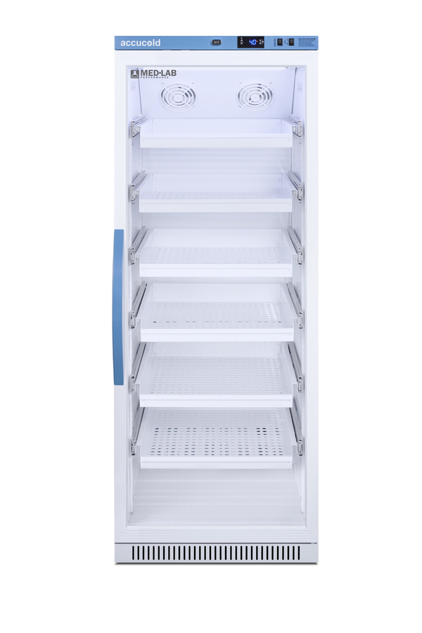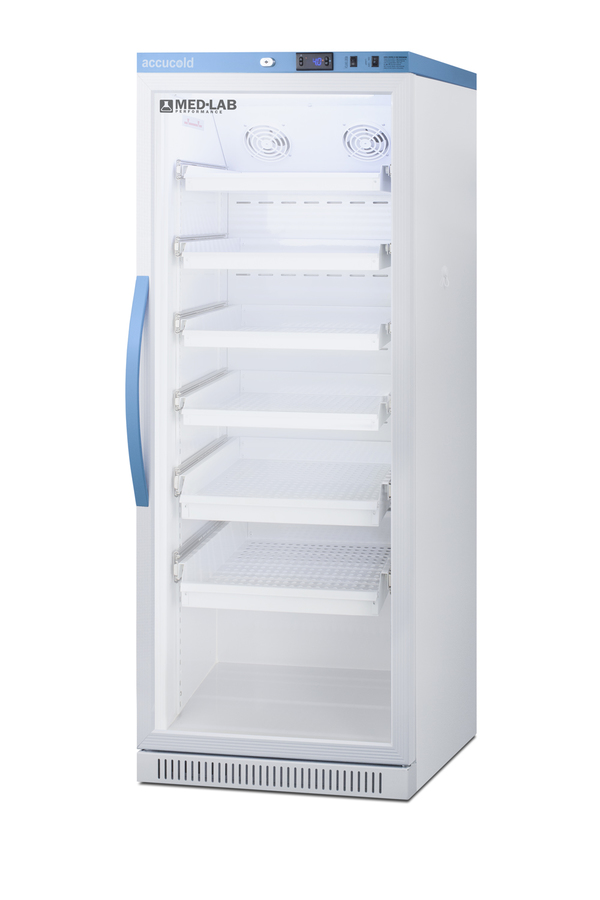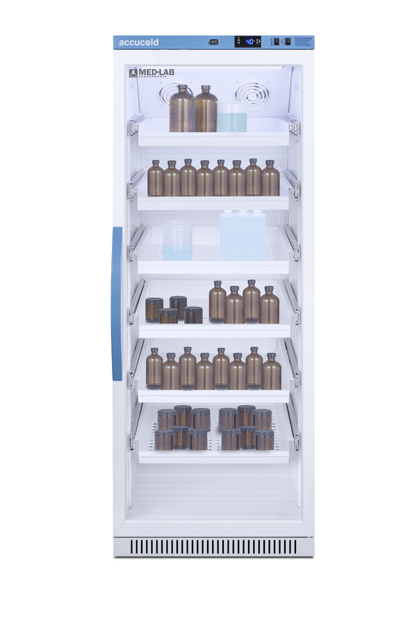 Accucold's Med-Lab Performance Series all-refrigerators are designed and purpose-built to meet the demanding needs of life science, laboratory, and medical cold storage applications, with a powder-coated silver ion handle that helps prevent germ spread. The ARG12MLDR is a 12 cu.ft. all-refrigerator with an adjustable control range from +2 to +10ºC. The microprocessor temperature controller is externally located to minimize door openings, helping to protect stored contents from ambient temperature. The buffered temperature probe is encased in a glycol-filled bottle to better simulate temperature of the stored product, with an additional sensor that reads air temperature to ensure superior temperature control. The current and min/max temperature display is viewable in Celsius or Fahrenheit to the nearest tenth of a degree. The audible and visual temperature alarm sounds if the unit's interior goes out of range. Additional alarms include a power failure alert, door open alarm, and sensor failure alarm. This unit is equipped with remote alarm contacts in the rear and a 1/2" probe port on the right side to accept additional monitoring devices. A hospital grade cord with 'green dot' plug is also included for added safety in high traffic areas. Inside, the ARG12MLDR utilizes adjustable cycle defrost operation to avoid temperature spikes. Optimized forced air cooling with two internal fans ensures excellent temperature stability and uniformity with rapid recovery after door openings. Six white powder-coated aluminum drawers provide ample storage and easy organization. Positioned on ball-bearing glides, the drawers offer full-extension for complete product access. Additionally, each drawer is removable allowing for transport of contents as needed. The drawers also lock into place for added security, while the perforated bottom ensures proper ventilation throughout the unit. LED internal lighting with an on/off rocker switch attractively illuminates the interior for easy viewing. The interior is constructed from white powder coated metal to ensure added durability and better temperature retention. The ARG12MLDR comes in a white cabinet finish with a blue accented control panel. The factory-installed antimicrobial handle is powder-coated with naturally occurring silver ions, which help to reduce the spread of germs, allowing for a safer, cleaner user experience. The user-reversible double pane tempered glass door provides a full view of the interior. This model includes a factory-installed lock and ships with two keys for staff use. Powerful magnetic gaskets ensure a positive seal. Designed with hydrocarbon refrigerant, the ARG12MLDR provides an energy efficient solution to laboratory and life science storage. This unit is Pyxis, Omnicell, and AcuDose RX compatible. Additional sizes, door options, and units with a combination of standard shelving and drawers are also available. Explore the full Med-Lab series at accucold.com/medlab. NOTE: Accucold refrigerators are purpose-built to the support meeting the current CDC (Centers for Disease Control) guidelines for the storage of vaccines. At this time, Accucold refrigerators have not been evaluated to the new NSF 456 standard. As referenced in the current Vaccine Storage and Handling Toolkit, these units incorporate microprocessor controls and forced air circulation for stable operation. For additional temperature assurance, the CDC recommends a calibrated digital data logger (DDL), which can be added with the factory-installed option DL2B or addition of the DL2BKit accessory.