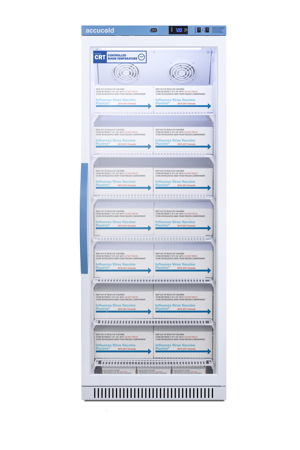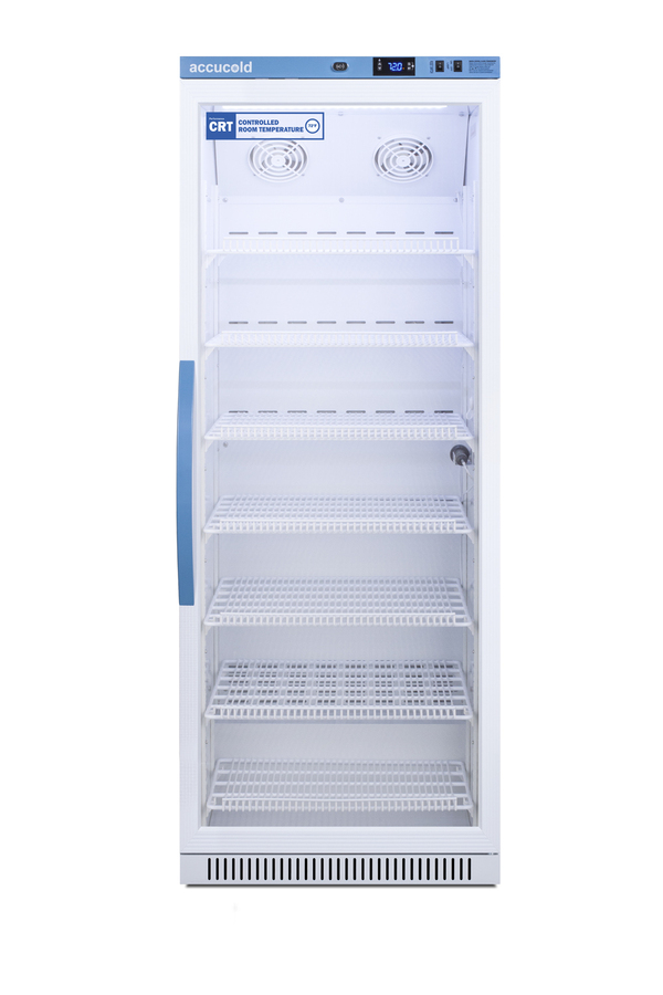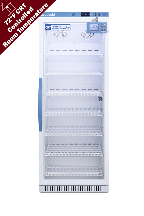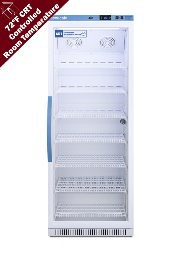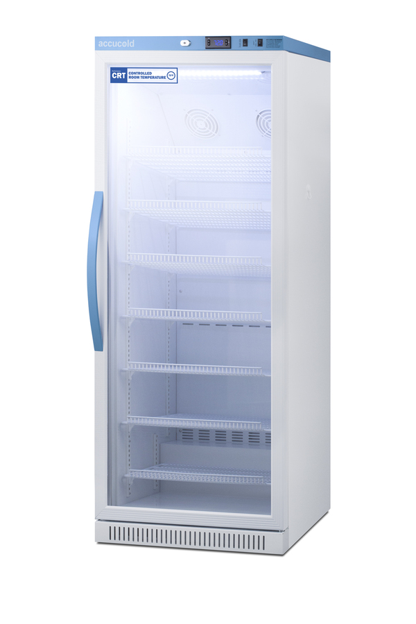 Accucold's Performance Series Controlled Room Temperature Cabinets offer purpose-built storage solutions for medication requiring a stable room temperature environment. The ARG12PV-CRT is a 12 cu.ft. upright unit pre-set to 72ºF, with an adjustable range from 68º to 77ºF. The microprocessor temperature controller is externally located to minimize door openings, helping to protect stored contents from ambient temperature. The buffered temperature probe is encased in a glycol-filled bottle to better simulate temperature of the stored product, with an additional sensor that reads air temperature to ensure superior temperature control. The current and min/max temperature display is viewable in Celsius or Fahrenheit to the nearest tenth of a degree. The audible and visual temperature alarm sounds if the unit's interior goes out of range. Additional alarms include a power failure alert, door open alarm, and sensor failure alarm. This unit is equipped with remote alarm contacts in the rear and a 1/2" probe port on the right side to accept additional monitoring devices. A hospital grade cord with 'green dot' plug is also included for added safety in high traffic areas. Inside, the ARG12PV-CRT utilizes adjustable cycle defrost operation to avoid temperature spikes. Optimized forced air cooling with two internal fans ensures excellent temperature stability and uniformity with rapid recovery after door openings. The adjustable plastic-coated wire shelves can be positioned at 1/2" increments to accommodate virtually any sized item. We include seven shelves, more than competitor products providing to maximize interior shelving storage area. This unit includes LED internal lighting with an on/off rocker switch. The interior is constructed from white powder coated metal to ensure added durability and better temperature retention. The ARG12PV-CRT comes in a white cabinet finish with a blue accented control panel. The factory-installed antimicrobial handle is powder-coated with naturally occurring silver ions, which help to reduce the spread of germs, allowing for a safer, cleaner user experience. The double pane tempered glass door provides a full view of the interior. The user-reversible door ships with a right hand swing and self-closing function. This model includes a factory-installed lock and ships with two keys for staff use. Powerful magnetic gaskets ensure a positive seal. Designed with hydrocarbon refrigerant, the ARG12PV-CRT provides an energy efficient solution to stabilized room temperature storage, even when ambient temperatures can reach temperatures as cold as 68ºF or warm as 86ºF. This unit is Pyxis, Omnicell, and AcuDose RX compatible. Additional sizes, as well as solid door options, are also available.