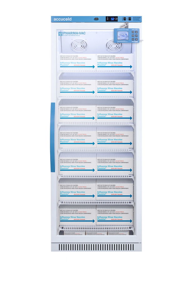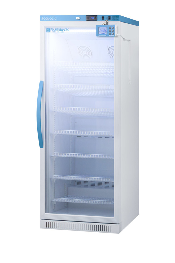 Accucold's Pharma-Vac Performance Series are upright all-refrigerators designed and purpose-built for pharmacy, medication, and vaccine applications to support meeting CDC/VFC/VFA guidelines, with a powder-coated silver ion handle that helps prevent germ spread. The ARG12PV is a 12 cu.ft. all-refrigerator with an adjustable control range from +2 to +8ºC. The microprocessor temperature controller is externally located to minimize door openings, helping to protect stored contents from ambient temperature. The buffered temperature probe is encased in a glycol-filled bottle to better simulate temperature of the stored product, with an additional sensor that reads air temperature to ensure superior temperature control. The current and min/max temperature display is viewable in Celsius or Fahrenheit to the nearest tenth of a degree. This refrigerator includes a high/low temperature alarm, as well as a power failure alert, door open alarm, and sensor failure alarm. This unit is equipped with remote alarm contacts in the rear and a 1/2" probe port. A hospital grade cord with 'green dot' plug is also included for added safety in high traffic areas. We also include our DL2B digital data logger to be mounted to the door, a feature recommended by the CDC, VFC and VFA for vaccine storage. This password-protected DDL is NIST calibrated in our ISO/IEC 17025:2017 accredited laboratory and offers a large LCD display of the current and high/low temperature, recording up to 32,000 data groups to its internal memory or even more on the included 4GB USB flash drive. Data can be viewed through a PC or Mac in Microsoft Excel or any .CSV compatible program. Users can set their own recording intervals starting at increments of 10 seconds to best meet a facility's specific logging needs. We include a 2-year certificate of calibration beginning the date of manufacture. The logger can be re-calibrated in our laboratories after the certificate expires. (For additional information on the DDL, see the DL2BKit listing on our website.) Inside, the ARG12PVDL2B utilizes adjustable cycle defrost operation to avoid temperature spikes. Optimized forced air cooling with two internal fans ensures excellent temperature stability and uniformity with rapid recovery after door openings. The adjustable plastic-coated wire shelves can be positioned at 1/2" increments to accommodate virtually any sized item. We include seven shelves, more than competitor products providing to maximize interior shelving storage area. This unit includes LED internal lighting with an on/off rocker switch. The interior is constructed from white powder coated metal to ensure added durability and better temperature retention. The ARG12PVDL2B comes in a white cabinet finish with a blue accented control panel. The factory-installed antimicrobial handle is powder-coated with naturally occurring silver ions, which help to reduce the spread of germs, allowing for a safer, cleaner user experience. The double pane tempered glass door provides a full view of the interior. This model includes a factory-installed lock and ships with two keys for staff use. Powerful magnetic gaskets ensure a positive seal. Designed with hydrocarbon refrigerant, the ARG12PV provides an energy efficient solution to vaccine storage. This unit is Pyxis, Omnicell, and AcuDose RX compatible. Additional sizes, as well as solid door options, are also available. Explore the full Pharma-Vac series at accucold.com/pharmavac. Note: The DL2B data logger adds 1 1/2" to the depth of the upper right hand corner of the door (not included in the listed specifications on this page). NOTE: Accucold refrigerators are purpose-built to the support meeting the current CDC (Centers for Disease Control) guidelines for the storage of vaccines. Units that end in suffix "456" have been certified to the new NSF 456 standard. As referenced in the current Vaccine Storage and Handling Toolkit, these units incorporate microprocessor controls and forced air circulation for stable operation between 2 and 8ºC. For additional temperature assurance, the CDC recommends a calibrated digital data logger (DDL), which can be added with the factory-installed option DL2B or addition of the DL2BKit accessory.