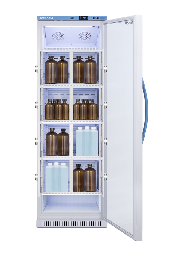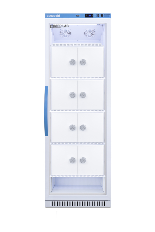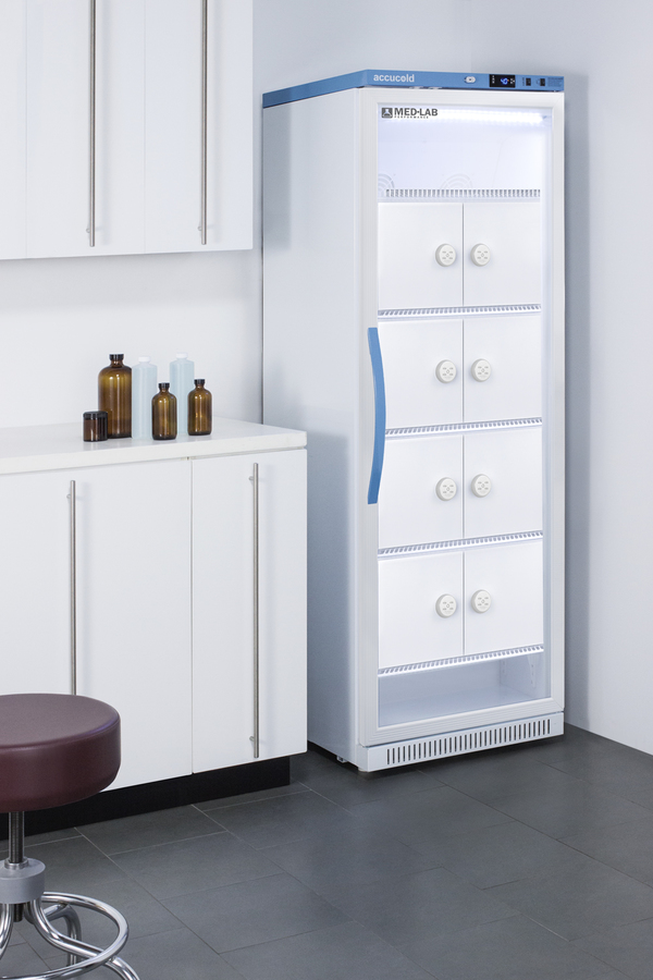 Accucold's Med-Lab Performance Series all-refrigerators are designed and purpose-built to meet the demanding needs of life science, laboratory, and medical cold storage applications, with a powder-coated silver ion handle that helps prevent germ spread. The ARG15MLLOCKER is a 15 cu.ft. all-refrigerator with an adjustable control range from +2 to +10ºC. The microprocessor temperature controller is externally located to minimize door openings, helping to protect stored contents from ambient temperature. The buffered temperature probe is encased in a glycol-filled bottle to better simulate temperature of the stored product, with an additional sensor that reads air temperature to ensure superior temperature control. The current and min/max temperature display is viewable in Celsius or Fahrenheit to the nearest tenth of a degree. The audible and visual temperature alarm sounds if the unit's interior goes out of range. Additional alarms include a power failure alert, door open alarm, and sensor failure alarm. This unit is equipped with remote alarm contacts in the rear and a 1/2" probe port on the right side to accept additional monitoring devices. A hospital grade cord with 'green dot' plug is also included for added safety in high traffic areas. Inside, the ARG15MLLOCKER has eight lockers, each with a combination lock to ensure appropriate security for secure medical or general-purpose storage, which can be reset or overridden as needed with included master keys. The adjustable cycle defrost operation helps to avoid temperature spikes. Optimized forced air cooling with two internal fans ensures excellent temperature stability and uniformity with rapid recovery after door openings. The adjustable plastic-coated wire shelves can be positioned at 1/2" increments to accommodate virtually any sized item. We include seven shelves, more than competitor products providing to maximize interior shelving storage area. This unit includes LED internal lighting with an on/off rocker switch. The interior is constructed from white powder-coated metal to ensure added durability and better temperature retention. The ARG15MLLOCKER comes in a white cabinet finish with a blue accented control panel. The factory-installed antimicrobial handle is powder-coated with naturally occurring silver ions, which help to reduce the spread of germs, allowing for a safer, cleaner user experience. The user-reversible double pane tempered glass door provides a full view of the interior. This model includes a factory-installed lock and ships with two keys for staff use. Powerful magnetic gaskets ensure a positive seal. Designed with hydrocarbon refrigerant, the ARG15MLLOCKER provides an energy-efficient solution to laboratory and life science storage. This unit is Pyxis, Omnicell, and AcuDose RX compatible. Additional sizes are available. Explore the full Med-Lab series at accucold.com/medlab. NOTE: Accucold refrigerators are purpose-built to the support meeting the current CDC (Centers for Disease Control) guidelines for the storage of vaccines. At this time, Accucold refrigerators have not been evaluated to the new NSF 456 standard. As referenced in the current Vaccine Storage and Handling Toolkit, these units incorporate microprocessor controls and forced air circulation for stable operation. For additional temperature assurance, the CDC recommends a calibrated digital data logger (DDL), which can be added with the factory-installed option DL2B or addition of the DL2BKit accessory.