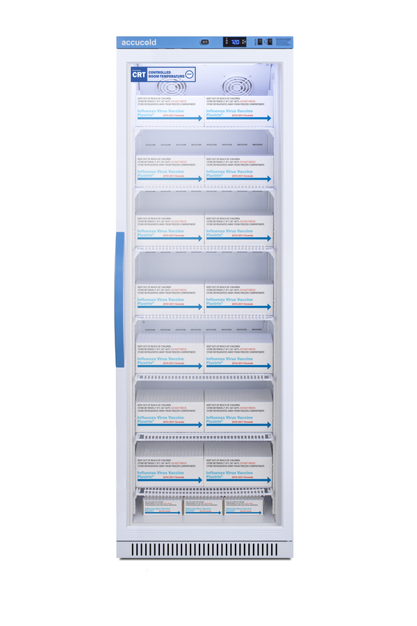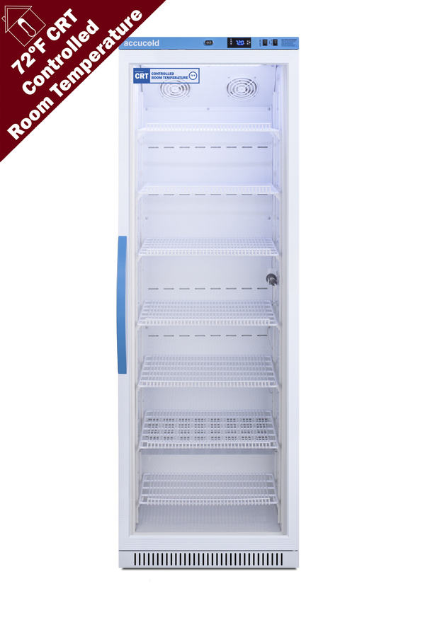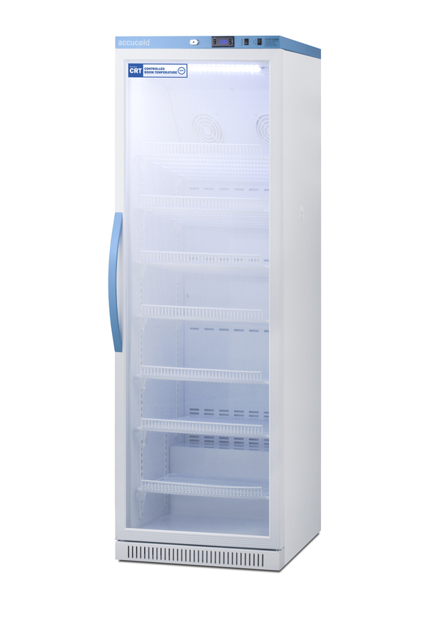 Accucold's Performance Series Controlled Room Temperature Cabinets offer purpose-built storage solutions for medication requiring a stable room temperature environment. The ARG15PV-CRT is a 15 cu.ft. upright unit pre-set to 72ºF, with an adjustable range from 68º to 77ºF. The microprocessor temperature controller is externally located to minimize door openings, helping to protect stored contents from ambient temperature. The buffered temperature probe is encased in a glycol-filled bottle to better simulate temperature of the stored product, with an additional sensor that reads air temperature to ensure superior temperature control. The current and min/max temperature display is viewable in Celsius or Fahrenheit to the nearest tenth of a degree. The audible and visual temperature alarm sounds if the unit's interior goes out of range. Additional alarms include a power failure alert, door open alarm, and sensor failure alarm. This unit is equipped with remote alarm contacts in the rear and a 1/2" probe port on the right side to accept additional monitoring devices. A hospital grade cord with 'green dot' plug is also included for added safety in high traffic areas. Inside, the ARG15PV-CRT utilizes adjustable cycle defrost operation to avoid temperature spikes. Optimized forced air cooling with two internal fans ensures excellent temperature stability and uniformity with rapid recovery after door openings. The adjustable plastic-coated wire shelves can be positioned at 1/2" increments to accommodate virtually any sized item. We include seven shelves, more than competitor products providing to maximize interior shelving storage area. This unit includes LED internal lighting with an on/off rocker switch. The interior is constructed from white powder coated metal to ensure added durability and better temperature retention. The ARG15PV-CRT comes in a white cabinet finish with a blue accented control panel. The factory-installed antimicrobial handle is powder-coated with naturally occurring silver ions, which help to reduce the spread of germs, allowing for a safer, cleaner user experience. The double pane tempered glass door provides a full view of the interior. The user-reversible door ships with a right hand swing and self-closing function. This model includes a factory-installed lock and ships with two keys for staff use. Powerful magnetic gaskets ensure a positive seal. Designed with hydrocarbon refrigerant, the ARG15PV-CRT provides an energy efficient solution to stabilized room temperature storage, even when ambient temperatures can reach temperatures as cold as 68ºF or warm as 86ºF. This unit is Pyxis, Omnicell, and AcuDose RX compatible. Additional sizes, as well as solid door options, are also available.