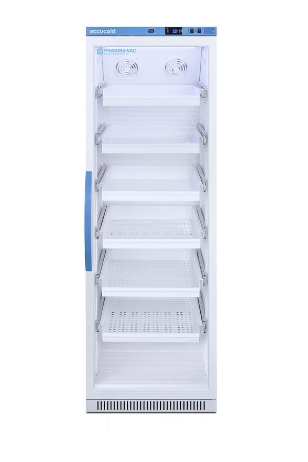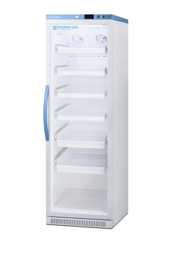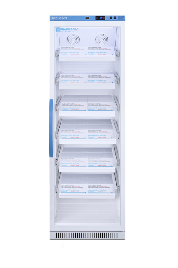 Accucold's Pharma-Vac Performance Series are upright all-refrigerators designed and purpose-built for pharmacy, medication, and vaccine applications to support meeting CDC/VFC/VFA guidelines, with a powder-coated silver ion handle that helps prevent germ spread. The ARG15PVDR is a 15 cu.ft. all-refrigerator with an adjustable control range from +2 to +8ºC. The microprocessor temperature controller is externally located to minimize door openings, helping to protect stored contents from ambient temperature. The buffered temperature probe is encased in a glycol-filled bottle to better simulate temperature of the stored product, with an additional sensor that reads air temperature to ensure superior temperature control. The current and min/max temperature display is viewable in Celsius or Fahrenheit to the nearest tenth of a degree. The audible and visual temperature alarm sounds if the unit's interior goes out of range. Additional alarms include a power failure alert, door open alarm, and sensor failure alarm. This unit is equipped with remote alarm contacts in the rear and a 1/2" probe port on the right side to accept additional monitoring devices. A hospital grade cord with 'green dot' plug is also included for added safety in high traffic areas. Inside, the ARG15PVDR utilizes adjustable cycle defrost operation to avoid temperature spikes. Optimized forced air cooling with two internal fans ensures excellent temperature stability and uniformity with rapid recovery after door openings. Six white powder-coated aluminum drawers provide ample storage and easy organization. Positioned on ball-bearing glides, the drawers offer full-extension for complete product access. Additionally, each drawer is removable allowing for transport of contents as needed. The drawers also lock into place for added security, while the perforated bottom ensures proper ventilation throughout the unit. LED internal lighting with an on/off rocker switch attractively illuminates the interior for easy viewing. The interior is constructed from white powder-coated metal to ensure added durability and better temperature retention. The ARG15PVDR comes in a white cabinet finish with a blue accented control panel. The factory-installed antimicrobial handle is powder-coated with naturally occurring silver ions, which help to reduce the spread of germs, allowing for a safer, cleaner user experience. The user-reversible double pane tempered glass door provides a full view of the interior. This model includes a factory-installed lock and ships with two keys for staff use. Powerful magnetic gaskets ensure a positive seal. Designed with hydrocarbon refrigerant, the ARG15PVDR provides an energy-efficient solution to vaccine storage. This unit is Pyxis, Omnicell, and AcuDose RX compatible. Additional sizes, door options, and units with a combination of standard shelving and drawers are also available. Explore the full Pharma-Vac series at accucold.com/pharmavac. NOTE: Accucold refrigerators are purpose-built to the support meeting the current CDC (Centers for Disease Control) guidelines for the storage of vaccines. Units that end in suffix "456" have been certified to the new NSF 456 standard. As referenced in the current Vaccine Storage and Handling Toolkit, these units incorporate microprocessor controls and forced air circulation for stable operation between 2 and 8ºC. For additional temperature assurance, the CDC recommends a calibrated digital data logger (DDL), which can be added with the factory-installed option DL2B or addition of the DL2BKit accessory.