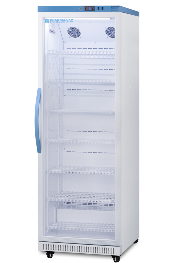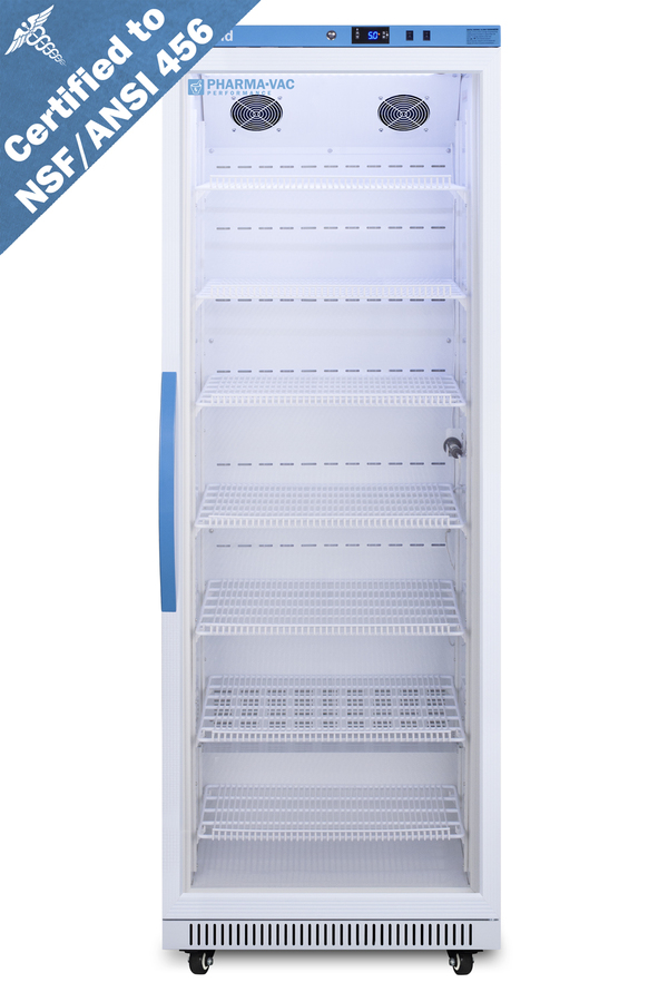 Accucold is proud to lead the industry with the largest line of cold storage product sizes certified to NSF/ANSI 456 Vaccine Storage Standard. The Pharma-Vac Performance Series supports meeting regulations and guidelines from the CDC, State Agencies, World Health Organization, and other Health Ministries on vaccine storage and handling. The ARG18PV456 is a 18 cu.ft. all-refrigerator with an adjustable control range from +2 to +8ºC. The microprocessor temperature controller is externally located to minimize door openings, helping to protect stored contents from ambient temperature. The buffered temperature probe is encased in a glycol-filled bottle to better simulate temperature of the stored product, with an additional sensor that reads air temperature to ensure superior temperature control. The current and min/max temperature display is viewable in Celsius or Fahrenheit to the nearest tenth of a degree. The audible and visual temperature alarm sounds if the unit's interior goes out of range. Additional alarms include a power failure alert, door open alarm, and sensor failure alarm. This unit is equipped with remote alarm contacts in the rear and a 1/2" probe port on the right side to accept additional monitoring devices. A hospital grade cord with 'green dot' plug is also included for added safety in high traffic areas. Inside, the ARG18PV456 utilizes adjustable cycle defrost operation to avoid temperature spikes. Optimized forced air cooling with one internal fan ensures excellent temperature stability and uniformity with rapid recovery after door openings. The adjustable plastic-coated wire shelves can be positioned at 1/2" increments to accommodate virtually any sized item. We include seven shelves, more than competitor products providing to maximize interior shelving storage area. This unit includes LED internal lighting with an on/off rocker switch. The interior is constructed from white powder coated metal to ensure added durability and better temperature retention. The ARG18PV456 comes in a white cabinet finish with a blue accented control panel and double pane tempered self-closing glass door. The factory-installed antimicrobial handle is powder-coated with naturally occurring silver ions, which help to reduce the spread of germs, allowing for a safer, cleaner user experience. This model includes a factory-installed lock and ships with two keys for staff use. Powerful magnetic gaskets ensure a positive seal. Four pre-installed 3" high casters with brakes make it easier to move as needed. Designed with hydrocarbon refrigerant, the ARG18PV456 provides an energy efficient solution to vaccine storage. This unit is Pyxis, Omnicell, and AcuDose RX compatible. Additional sizes, as well as solid door options, are also available. Explore the full Pharma-Vac NSF 456 series at accucold.com/pharmavac. ABOUT NSF 456: NSF/ANSI 456 is a voluntary standard introduced in 2021 that was designed to establish the performance and construction requirements for vaccine refrigeration. Models certified to this standard undergo strict testing to confirm temperatury consistency. All Accucold units approved to NSF 456 for vaccine storage are certified by an independent testing agency.