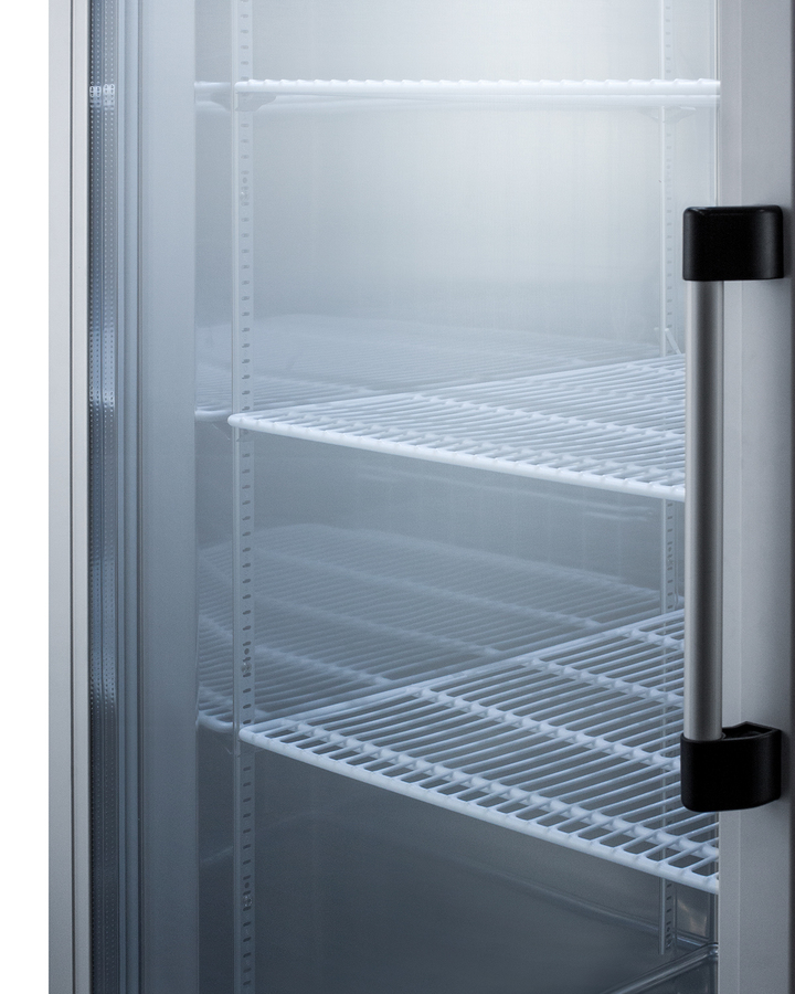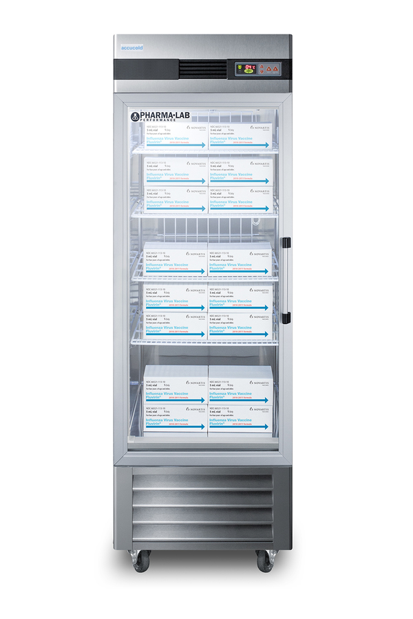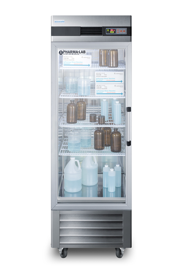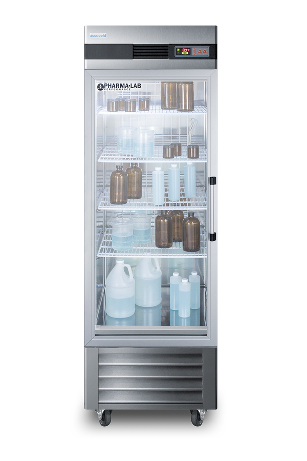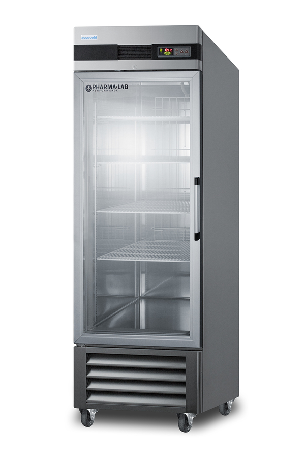 Accucold's Pharma-Lab Performance Series features reach-in refrigerators and matching freezers designed and purpose-built to meet the demanding needs for pharmacy, medication, vaccine, laboratory, and life science applications. The ARG23MLLH is a 23 cu.ft. glass door all-refrigerator with an adjustable control range from +2 to +10ºC. The microprocessor temperature controller features a large digital LED display viewable in Celsius or Fahrenheit, making it easy for staff to manage and monitor the temperature. The unit is equipped with an air sensor for rapid control response and a product sensor for a more accurate reading of the interior, including a display of the min/max temperature in 15 minute increments The audible and visual temperature alarm sounds if the unit rises or falls above a user-set range. Additional alarms include a power failure alert, door open alarm, and a condenser cleaning reminder. Inside, the ARG23MLLH utilizes adjustable cycle defrost operation to avoid temperature spikes, with a top-mounted forced air cooling system to ensure rapid temperature recovery. Four vinyl-coated wire shelves on cantilevered clips allow you to accommodate virtually any sized item. The LED lighting displays automatically when the door is open, providing a full and energy efficient display. The ARG23MLLH features a durable stainless steel cabinet and interior, with a sealed back for easier cleanup. The double pane tempered glass door provides a full display of the interior. We include a set of casters (2 locking) for optional installation. A factory-installed lock offers added security, with two keys included for your facility. Magnetic door gaskets ensure a strong seal. The door is self-closing to help protect contents, but will remain open at 90º for easier loading. This unit has a left hand door swing. For the same model with the door opening from the other side, see the ARS23ML. Designed with hydrocarbon refrigerant, the ARG23MLLH provides an energy efficient solution to large capacity storage. This unit is Pyxis, Omnicell, and AcuDose RX compatible and meets NSF-7 commercial standards. For a matching frost-free freezer, see the AFS23ML. NOTE: Accucold refrigerators are purpose-built to the support meeting the current CDC (Centers for Disease Control) guidelines for the storage of vaccines. At this time, Accucold refrigerators have not been evaluated to the new NSF 456 standard. As referenced in the current Vaccine Storage and Handling Toolkit, these units incorporate microprocessor controls and forced air circulation for stable operation. For additional temperature assurance, the CDC recommends a calibrated digital data logger (DDL), which can be added with the factory-installed option DL2B or addition of the DL2BKit accessory.