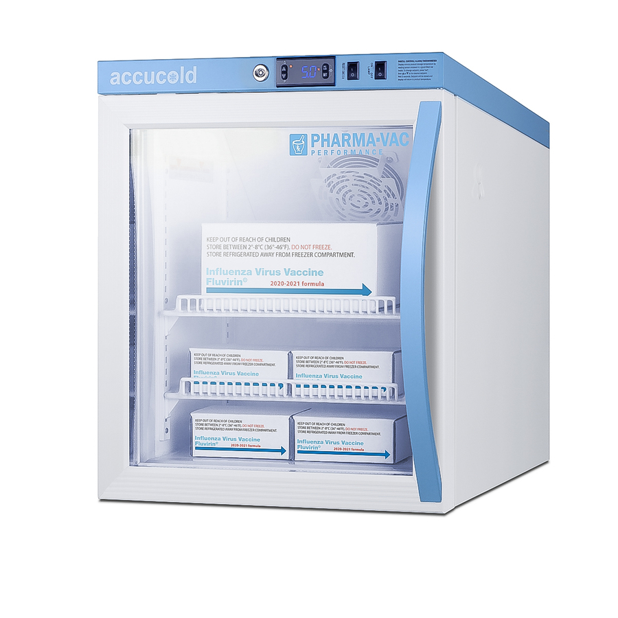 Accucold is proud to lead the industry with the largest line of cold storage product sizes certified to NSF/ANSI 456 Vaccine Storage Standard. The Pharma-Vac Performance Series supports meeting regulations and guidelines from the CDC, State Agencies, World Health Organization, and other Health Ministries on vaccine storage and handling. The ARG2PV456LHD is a 1.94 cu.ft. all-refrigerator with an adjustable control range from +2 to +8ºC. The microprocessor temperature controller is externally located to minimize door openings, helping to protect stored contents from ambient temperature. The buffered temperature probe is encased in a glycol-filled bottle to better simulate temperature of the stored product, with an additional sensor that reads air temperature to ensure superior temperature control. The current and min/max temperature display is viewable in Celsius or Fahrenheit to the nearest tenth of a degree. The audible and visual temperature alarm sounds if the unit's interior goes out of range. Additional alarms include a power failure alert, door open alarm, and sensor failure alarm. This unit is equipped with remote alarm contacts in the rear and a 1/2" probe port on the right side to accept additional monitoring devices. A hospital grade cord with 'green dot' plug is also included for added safety in high traffic areas. Inside, the ARG2PV456LHD utilizes adjustable cycle defrost operation to avoid temperature spikes. Optimized forced air cooling with an internal fan to ensure excellent temperature stability and uniformity with rapid recovery after door openings. The adjustable plastic-coated wire shelves can be positioned at 1/2" increments to accommodate virtually any sized item. This unit includes LED internal lighting with an on/off rocker switch. The interior is constructed from white powder coated metal to ensure added durability and better temperature retention. The ARG2PV456LHD comes in a white cabinet finish with a blue accented control panel. The factory-installed antimicrobial handle is powder-coated with naturally occurring silver ions, which help to reduce the spread of germs, allowing for a safer, cleaner user experience. The double pane tempered glass door provides a full view of the interior. The door ships with a left hand swing and self-closing function. This model includes a factory-installed lock and ships with two keys for staff use. Powerful magnetic gaskets ensure a positive seal. Designed with hydrocarbon refrigerant, the ARG2PV456 provides an energy efficient solution to vaccine storage. This unit is Pyxis, Omnicell, and AcuDose RX compatible. Additional sizes, as well as solid door options, are also available. Explore the full Pharma-Vac NSF 456 series at accucold.com/pharmavac. ABOUT NSF 456: NSF/ANSI 456 is a voluntary standard introduced in 2021 that was designed to establish the performance and construction requirements for vaccine refrigeration. Models certified to this standard undergo strict testing to confirm temperatury consistency. All Accucold units approved to NSF 456 for vaccine storage are certified by an independent testing agency.