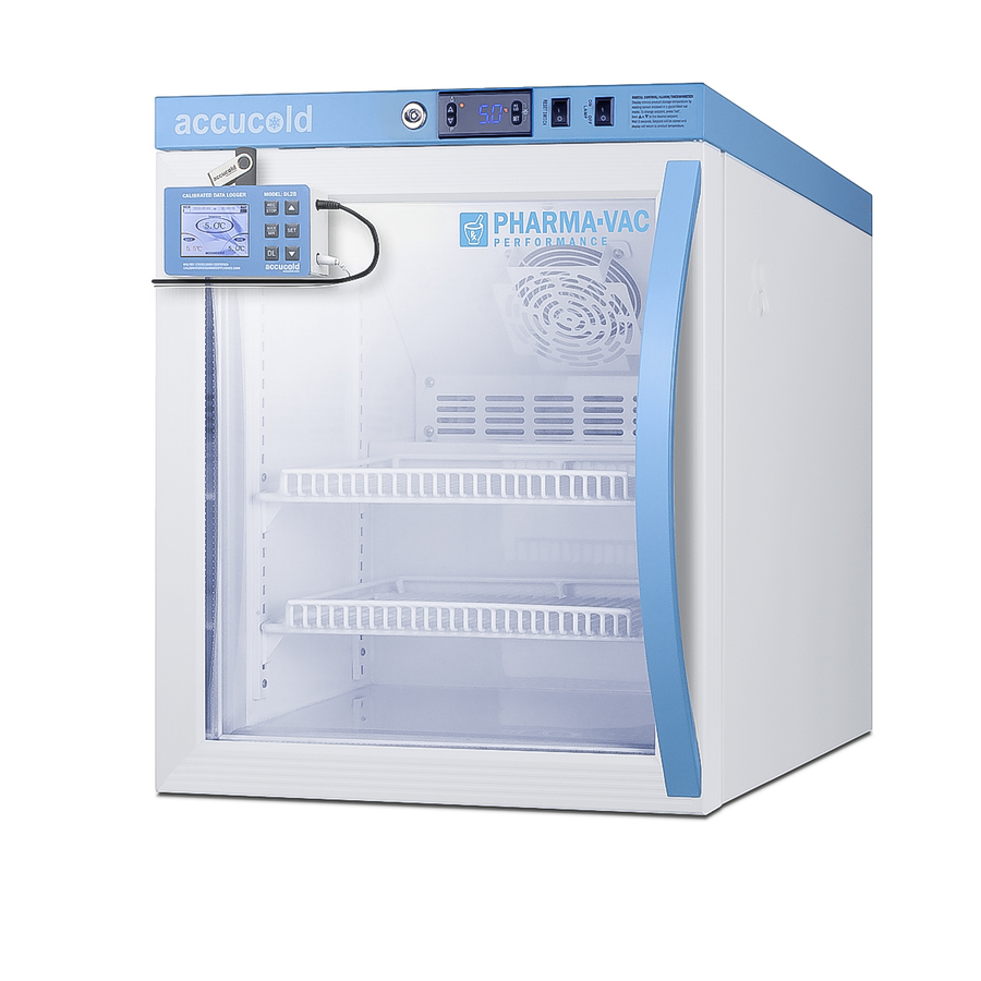 Accucold's Pharma-Vac Performance Series are upright all-refrigerators designed and purpose-built for pharmacy, medication, and vaccine applications to support meeting CDC/VFC/VFA guidelines. The ARG2PVDL2B is a 1.94 cu.ft. all-refrigerator with an adjustable control range from +2 to +8ºC. The microprocessor temperature controller is externally located to minimize door openings, helping to protect stored contents from ambient temperature. The buffered temperature probe is encased in a glycol-filled bottle to better simulate temperature of the stored product, with an additional sensor that reads air temperature to ensure superior temperature control. The current and min/max temperature display is viewable in Celsius or Fahrenheit to the nearest tenth of a degree. This refrigerator includes a high/low temperature alarm, as well as a power failure alert, door open alarm, and sensor failure alarm. This unit is equipped with remote alarm contacts in the rear and a 1/2" probe port. A hospital grade cord with 'green dot' plug is also included for added safety in high traffic areas. We also include our DL2B digital data logger to be mounted to the door, a feature recommended by the CDC, VFC and VFA for vaccine storage. This password-protected DDL is NIST calibrated in our ISO/IEC 17025:2017 accredited laboratory and offers a large LCD display of the current and high/low temperature, recording up to 32,000 data groups to its internal memory or even more on the included 4GB USB flash drive. Data can be viewed through a PC or Mac in Microsoft Excel or any .CSV compatible program. Users can set their own recording intervals starting at increments of 10 seconds to best meet a facility's specific logging needs. We include a 2-year certificate of calibration beginning the date of manufacture. The logger can be re-calibrated in our laboratories after the certificate expires. (For additional information on the DDL, see the DL2BKit listing on our website.) Inside, the ARG2PVDL2B utilizes adjustable cycle defrost operation to avoid temperature spikes. Optimized forced air cooling with an internal fan to ensures excellent temperature stability and uniformity with rapid recovery after door openings. The adjustable plastic-coated wire shelves can be positioned at 1/2" increments to accommodate virtually any sized item. This unit includes LED internal lighting with an on/off rocker switch. The interior is constructed from white powder coated metal to ensure added durability and better temperature retention. The ARG2PVDL2B comes in a white cabinet finish with a blue accented control panel. The factory-installed antimicrobial handle is powder-coated with naturally occurring silver ions, which help to reduce the spread of germs, allowing for a safer, cleaner user experience. The double pane tempered glass door provides a full view of the interior. This model includes a factory-installed lock and ships with two keys for staff use. Powerful magnetic gaskets ensure a positive seal. Designed with hydrocarbon refrigerant, the ARG2PVDL2B provides an energy efficient solution to vaccine storage. This unit is Pyxis, Omnicell, and AcuDose RX compatible. Additional sizes, as well as solid door options, are also available. Explore the full Pharma-Vac series at accucold.com/pharmavac. Note: The DL2B data logger adds 1 1/2" to the depth of the upper right hand corner of the door (not included in the listed specifications on this page). NOTE: Accucold refrigerators are purpose-built to the support meeting the current CDC (Centers for Disease Control) guidelines for the storage of vaccines. Units that end in suffix "456" have been certified to the new NSF 456 standard. As referenced in the current Vaccine Storage and Handling Toolkit, these units incorporate microprocessor controls and forced air circulation for stable operation between 2 and 8ºC. For additional temperature assurance, the CDC recommends a calibrated digital data logger (DDL), which is included on this unit.