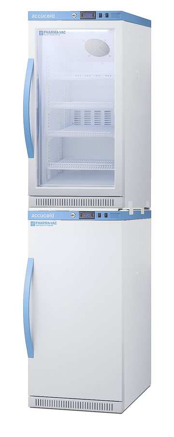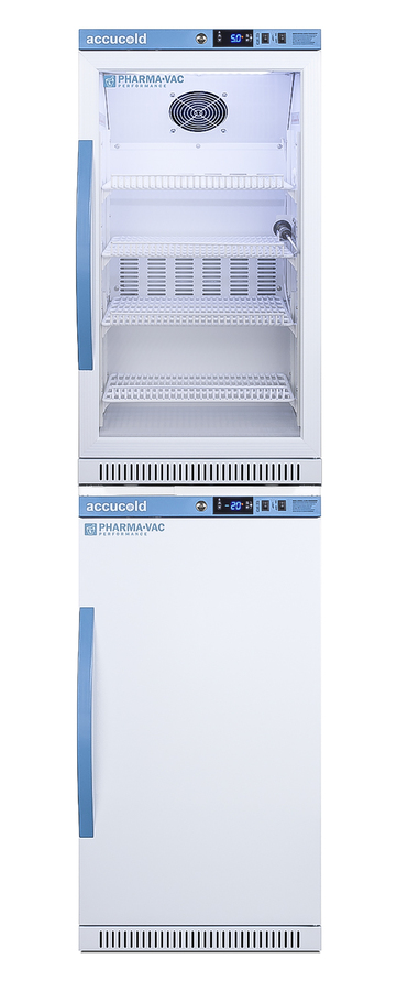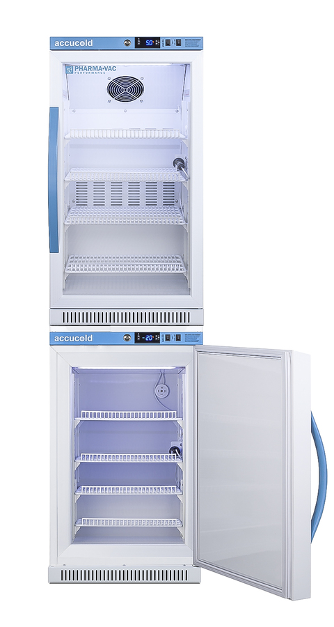 Accucold offers innovative solutions to vaccine storage with our Performance Series stackable purpose-built refrigerator-freezer combinations designed to support meeting CDC/VFC/VFA guidelines. Sized just under 20" wide, the ARG31PVBIADA-AFZ2PVBIADASTACK combines the 2.83 cu.ft. ARG31PVBIADA auto defrost all-refrigerator with AFZ5PVBIADA all-freezer into one slim footprint using Accucold's StackRack. This ships in three boxes and requires some minor assembly upon delivery. The Pharma-Vac Performance Series is designed to meet the demanding needs of vaccine storage. Both units utilize a microprocessor temperature controller (refrigerator range: +2 to +8ºC; freezer range: -30 to -10ºC). The buffered temperature probe is encased in a glycol-filled bottle to better simulate temperature of the stored product, with an additional sensor that reads air temperature to ensure superior temperature control. The current and min/max temperature display is viewable in Celsius or Fahrenheit to the nearest tenth of a degree. The audible and visual temperature alarms sound if the units' interiors go out of range. Additional alarms include a power failure alert, door open alarm, and sensor failure alarm. Both units are equipped with remote alarm contacts in the rear and a 1/2" probe port on the right side to accept additional monitoring devices. The factory-installed antimicrobial handles are powder-coated with naturally occurring silver ions, which help to reduce the spread of germs, allowing for a safer, cleaner user experience. A hospital grade cord with 'green dot' plug is also included for added safety in high traffic areas. Inside, the ARS32PVBIADA refrigerator utilizes adjustable cycle defrost operation to avoid temperature spikes. Optimized forced air cooling with an internal fan ensures excellent temperature stability and uniformity with rapid recovery after door openings. The adjustable plastic-coated wire shelves can be positioned at 1/2" increments to accommodate virtually any sized item. This unit includes LED internal lighting with an on/off rocker switch. The interior is constructed from white powder coated metal to ensure added durability and better temperature retention. The refrigerator is designed to be stacked on top of the AFZ2PVBIADA, our Performance Series 2.47 cu.ft. all-freezer that utilizes static manual defrost operation. The freezer includes four adjustable plastic-coated wire shelves for flexible storage. Both units include front-mounted keyed locks and powerful magnetic gaskets to ensure a positive seal, with self-closing doors for added protection in high traffic settings. Additional stacked combinations are available. Browse Accucold's website for more information, or contact our sales team at 718-893-3900 to discuss your equipment needs. NOTE: Accucold refrigerators are purpose-built to the support meeting the current CDC (Centers for Disease Control) guidelines for the storage of vaccines. As referenced in the current Vaccine Storage and Handling Toolkit, these units incorporate microprocessor controls and forced air circulation for stable operation between 2 and 8ºC. For additional temperature assurance, the CDC recommends a calibrated digital data logger (DDL), which can be added with the factory-installed option DL2B or addition of the DL2BKit accessory.