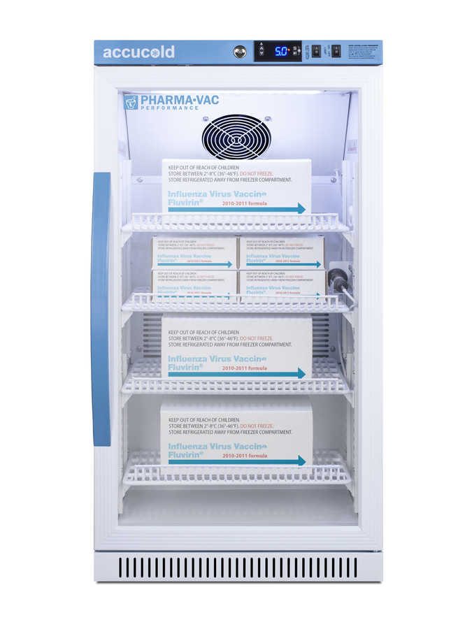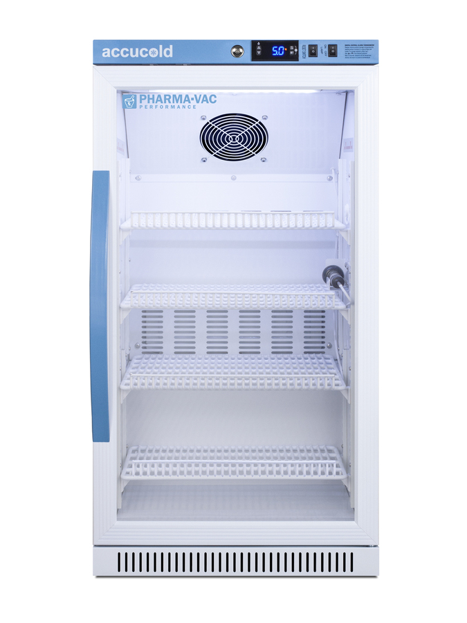 Accucold is proud to lead the industry with the largest line of cold storage product sizes certified to NSF/ANSI 456 Vaccine Storage Standard. The Pharma-Vac Performance Series supports meeting regulations and guidelines from the CDC, State Agencies, World Health Organization, and other Health Ministries on vaccine storage and handling. The ARG31PVBIADA456 is a 2.83 cu.ft. all-refrigerator with a temperature range of +2°C to +8°C. Sized at 32" high to fit under lower counters complying with ADA guidelines for accessibility. It is designed for freestanding or recessed installation. The microprocessor temperature controller is externally located to minimize door openings, helping to protect stored contents from ambient temperature. The buffered temperature probe is encased in a glycol-filled bottle to better simulate temperature of the stored product, with an additional sensor that reads air temperature to ensure superior temperature control. The current and min/max temperature display is viewable in Celsius or Fahrenheit to the nearest tenth of a degree. The audible and visual temperature alarm sounds if the unit's interior goes out of range. Additional alarms include a power failure alert, door open alarm, and sensor failure alarm. This model is equipped with remote alarm contacts in the rear and a 1/2" probe port on the right side to accept additional monitoring devices. A hospital grade cord with 'green dot' plug is also included for added safety in high traffic areas. Inside, the ARG31PVBIADA456 utilizes adjustable cycle defrost operation to avoid temperature spikes. Optimized forced air cooling with an internal fan to ensure excellent temperature stability and uniformity with rapid recovery after door openings. The adjustable plastic-coated wire shelves can be positioned at 1/2" increments to accommodate virtually any sized item. This unit includes LED internal lighting with an on/off rocker switch. The interior is constructed from white powder coated metal to ensure added durability and better temperature retention. The ARG31PVBIADA456 comes in a white cabinet finish with a blue accented control panel. The factory-installed antimicrobial handle is powder-coated with naturally occurring silver ions, which help to reduce the spread of germs, allowing for a safer, cleaner user experience. The double pane tempered glass door provides a full view of the interior. The door ships with a right hand swing and self-closing function, while a factory-installed lock provides security as needed, with two keys for staff use. Powerful magnetic gaskets ensure a positive seal. Designed with hydrocarbon refrigerant, the ARG31PVBIADA456 provides an energy efficient solution to vaccine storage. This unit is Pyxis, Omnicell, and AcuDose RX compatible. Additional sizes, as well as solid door options, are also available. Explore the full Pharma-Vac NSF 456 series at accucold.com/pharmavac. ABOUT NSF 456: NSF/ANSI 456 is a voluntary standard introduced in 2021 that was designed to establish the performance and construction requirements for vaccine refrigeration. Models certified to this standard undergo strict testing to confirm temperatury consistency. All Accucold units approved to NSF 456 for vaccine storage are certified by an independent testing agency.