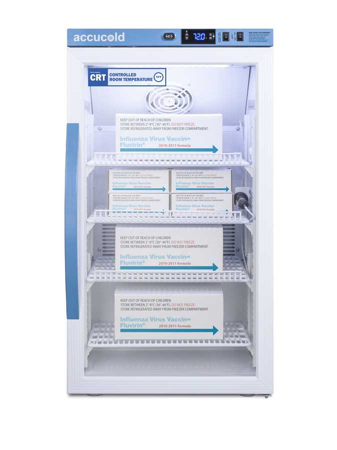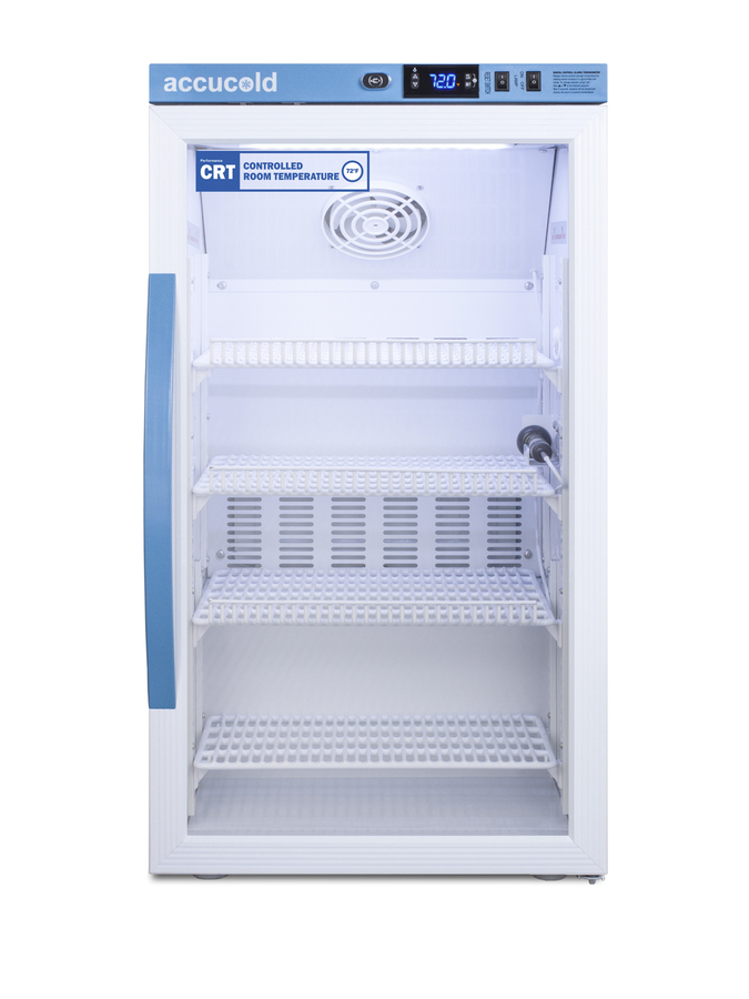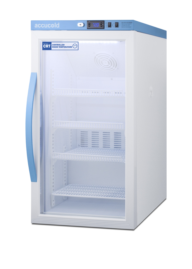 Accucold's Performance Series Controlled Room Temperature Cabinets offer purpose-built storage solutions for medication requiring a stable room temperature environment. The ARG3PV-CRT is a 3 cu.ft. upright unit pre-set to 72ºF, with an adjustable range from 68º to 77ºF. The microprocessor temperature controller is externally located to minimize door openings, helping to protect stored contents from ambient temperature. The buffered temperature probe is encased in a glycol-filled bottle to better simulate temperature of the stored product, with an additional sensor that reads air temperature to ensure superior temperature control. The current and min/max temperature display is viewable in Celsius or Fahrenheit to the nearest tenth of a degree. The audible and visual temperature alarm sounds if the unit's interior goes out of range. Additional alarms include a power failure alert, door open alarm, and sensor failure alarm. This unit is equipped with remote alarm contacts in the rear and a 1/2" probe port on the right side to accept additional monitoring devices. A hospital grade cord with 'green dot' plug is also included for added safety in high traffic areas. Inside, the ARG3PV-CRT utilizes adjustable cycle defrost operation to avoid temperature spikes. Optimized forced air cooling with an internal fan to ensure excellent temperature stability and uniformity with rapid recovery after door openings. The adjustable plastic-coated wire shelves can be positioned at 1/2" increments to accommodate virtually any sized item. This unit includes LED internal lighting with an on/off rocker switch. The interior is constructed from white powder coated metal to ensure added durability and better temperature retention. The ARG3PV-CRT comes in a white cabinet finish with a blue accented control panel. The factory-installed antimicrobial handle is powder-coated with naturally occurring silver ions, which help to reduce the spread of germs, allowing for a safer, cleaner user experience. The double pane tempered glass door provides a full view of the interior. The user-reversible door ships with a right hand swing and self-closing function. This model includes a factory-installed lock and ships with two keys for staff use. Powerful magnetic gaskets ensure a positive seal. Designed with hydrocarbon refrigerant, the ARG3PV-CRT provides an energy efficient solution to stabilized room temperature storage, even when ambient temperatures can reach temperatures as cold as 68ºF or warm as 86ºF. This unit is Pyxis, Omnicell, and AcuDose RX compatible. Additional sizes, as well as solid door options, are also available.