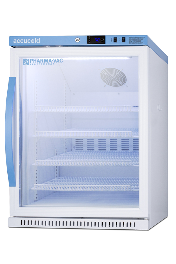 Accucold is proud to lead the industry with the largest line of cold storage product sizes certified to NSF/ANSI 456 Vaccine Storage Standard. The Pharma-Vac Performance Series supports meeting regulations and guidelines from the CDC, State Agencies, World Health Organization, and other Health Ministries on vaccine storage and handling. The ARG61PVBIADA456 is a 6 cu.ft. all-refrigerator with a temperature range of +2°C to +8°C. Sized at just under 32" high to fit under lower counters complying with ADA guidelines for accessibility. It is designed for freestanding or recessed installation. The microprocessor temperature controller is externally located to minimize door openings, helping to protect stored contents from ambient temperature. The buffered temperature probe is encased in a glycol-filled bottle to better simulate temperature of the stored product, with an additional sensor that reads air temperature to ensure superior temperature control. The current and min/max temperature display is viewable in Celsius or Fahrenheit to the nearest tenth of a degree. The audible and visual temperature alarm sounds if the unit's interior goes out of range. Additional alarms include a power failure alert, door open alarm, and sensor failure alarm. This model is equipped with remote alarm contacts in the rear and a 1/2" probe port on the right side to accept additional monitoring devices. A hospital grade cord with 'green dot' plug is also included for added safety in high traffic areas. Inside, the ARG61PVBIADA456 utilizes adjustable cycle defrost operation to avoid temperature spikes. Optimized forced air cooling with an internal fan to ensure excellent temperature stability and uniformity with rapid recovery after door openings. The adjustable plastic-coated wire shelves can be positioned at 1/2" increments to accommodate virtually any sized item. This unit includes LED internal lighting with an on/off rocker switch. The interior is constructed from white powder coated metal to ensure added durability and better temperature retention. The ARG61PVBIADA456 comes in a white cabinet finish with a blue accented control panel. The factory-installed antimicrobial handle is powder-coated with naturally occurring silver ions, which help to reduce the spread of germs, allowing for a safer, cleaner user experience. The double pane tempered glass door provides a full view of the interior. The door ships with a right hand swing and self-closing function, while a factory-installed lock provides security as needed, with two keys for staff use. Powerful magnetic gaskets ensure a positive seal. Designed with hydrocarbon refrigerant, the ARG61PVBIADA456 provides an energy efficient solution to vaccine storage. This unit is Pyxis, Omnicell, and AcuDose RX compatible. Additional sizes, as well as solid door options, are also available. Explore the full Pharma-Vac NSF 456 series at accucold.com/pharmavac. ABOUT NSF 456: NSF/ANSI 456 is a voluntary standard introduced in 2021 that was designed to establish the performance and construction requirements for vaccine refrigeration. Models certified to this standard undergo strict testing to confirm temperatury consistency. All Accucold units approved to NSF 456 for vaccine storage are certified by an independent testing agency.