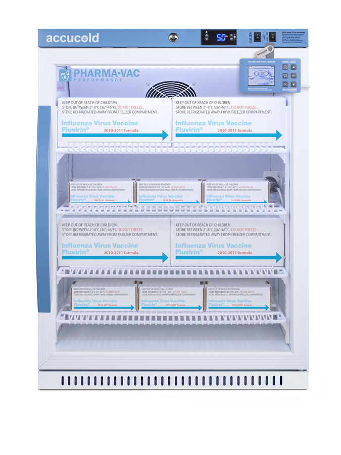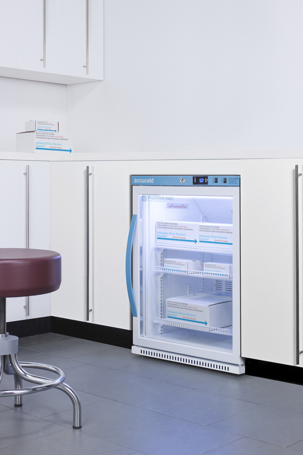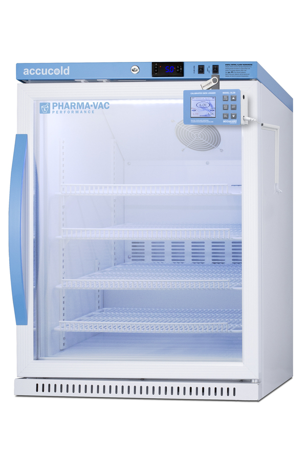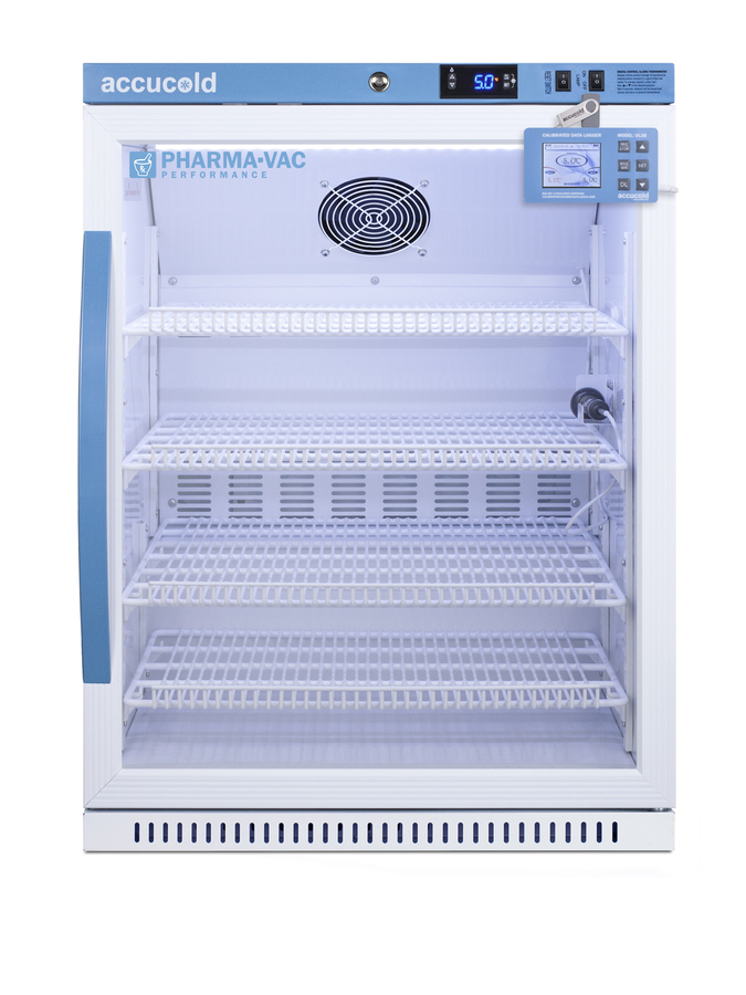 Accucold's Pharma-Vac Performance Series are upright all-refrigerators designed and purpose-built for pharmacy, medication, and vaccine applications to support meeting CDC/VFC/VFA guidelines. The ARG61PVBIADADL2B is a 6 cu.ft. all-refrigerator with a temperature range of +2°C to +8°C. Sized at just under 32" high to fit under lower counters complying with ADA guidelines for accessibility. It is designed for freestanding or recessed installation. The microprocessor temperature controller is externally located to minimize door openings, helping to protect stored contents from ambient temperature. The buffered temperature probe is encased in a glycol-filled bottle to better simulate temperature of the stored product, with an additional sensor that reads air temperature to ensure superior temperature control. The current and min/max temperature display is viewable in Celsius or Fahrenheit to the nearest tenth of a degree. The audible and visual temperature alarm sounds if the unit's interior goes out of range. Additional alarms include a power failure alert, door open alarm, and sensor failure alarm. This model is equipped with remote alarm contacts in the rear and a 1/2" probe port on the right side to accept additional monitoring devices. A hospital grade cord with 'green dot' plug is also included for added safety in high traffic areas. We also include our DL2B digital data logger to be mounted to the door, a feature recommended by the CDC, VFC and VFA for vaccine storage. This password-protected DDL is NIST calibrated in our ISO/IEC 17025:2017 accredited laboratory and offers a large LCD display of the current and high/low temperature, recording up to 32,000 data groups to its internal memory or even more on the included 4GB USB flash drive. Data can be viewed through a PC or Mac in Microsoft Excel or any .CSV compatible program. Users can set their own recording intervals starting at increments of 10 seconds to best meet a facility's specific logging needs. We include a 2-year certificate of calibration beginning the date of manufacture. The logger can be re-calibrated in our laboratories after the certificate expires. (For additional information on the DDL, see the DL2BKit listing on our website.) Inside, the ARG61PVBIADADL2B utilizes adjustable cycle defrost operation to avoid temperature spikes. Optimized forced air cooling with an internal fan to ensure excellent temperature stability and uniformity with rapid recovery after door openings. The adjustable plastic-coated wire shelves can be positioned at 1/2" increments to accommodate virtually any sized item. This unit includes LED internal lighting with an on/off rocker switch. The interior is constructed from white powder coated metal to ensure added durability and better temperature retention. The ARG61PVBIADADL2B comes in a white cabinet finish with a blue accented control panel. The factory-installed antimicrobial handle is powder-coated with naturally occurring silver ions, which help to reduce the spread of germs, allowing for a safer, cleaner user experience. The double pane tempered glass door provides a full view of the interior. The door ships with a right hand swing and self-closing function, while a factory-installed lock provides security as needed, with two keys for staff use. Powerful magnetic gaskets ensure a positive seal. Designed with hydrocarbon refrigerant, the ARG61PVBIADADL2B provides an energy efficient solution to vaccine storage. This unit is Pyxis, Omnicell, and AcuDose RX compatible. Additional sizes, as well as solid door options, are also available. Explore the full Pharma-Vac series at accucold.com/pharmavac. NOTE: Accucold refrigerators are purpose-built to the support meeting the current CDC (Centers for Disease Control) guidelines for the storage of vaccines. Units that end in suffix "456" have been certified to the new NSF 456 standard. As referenced in the current Vaccine Storage and Handling Toolkit, these units incorporate microprocessor controls and forced air circulation for stable operation between 2 and 8ºC. For additional temperature assurance, the CDC recommends a calibrated digital data logger (DDL), which can be added with the factory-installed option DL2B or addition of the DL2BKit accessory.