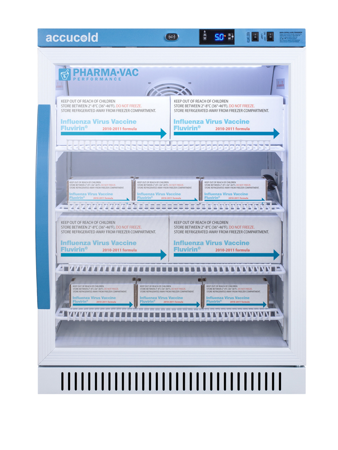 Accucold's Pharma-Vac Performance Series are upright all-refrigerators designed and purpose-built for pharmacy, medication, and vaccine applications to support meeting CDC/VFC/VFA guidelines, with a powder-coated silver ion handle that helps prevent germ spread. The ARG6PV is a 6 cu.ft. all-refrigerator sized at 32.5 inches high for use in most ADA compliant applications. The adjustable control range allows you to manage the temperature between +2 to +8ºC. The microprocessor temperature controller is externally located to minimize door openings, helping to protect stored contents from ambient temperature. The buffered temperature probe is encased in a glycol-filled bottle to better simulate temperature of the stored product, with an additional sensor that reads air temperature to ensure superior temperature control. The current and min/max temperature display is viewable in Celsius or Fahrenheit to the nearest tenth of a degree. The audible and visual temperature alarm sounds if the unit's interior goes out of range. Additional alarms include a power failure alert, door open alarm, and sensor failure alarm. This unit is equipped with remote alarm contacts in the rear and a 1/2" probe port on the right side to accept additional monitoring devices. A hospital grade cord with 'green dot' plug is also included for added safety in high traffic areas. Inside, the ARG6PV utilizes adjustable cycle defrost operation to avoid temperature spikes. Optimized forced air cooling with an internal fan to ensure excellent temperature stability and uniformity with rapid recovery after door openings. The adjustable plastic-coated wire shelves can be positioned at 1/2" increments to accommodate virtually any sized item. This unit includes LED internal lighting with an on/off rocker switch. The interior is constructed from white powder coated metal to ensure added durability and better temperature retention. The ARG6PV comes in a white cabinet finish with a blue accented control panel. The factory-installed antimicrobial handle is powder-coated with naturally occurring silver ions, which help to reduce the spread of germs, allowing for a safer, cleaner user experience. The double pane tempered glass door provides a full view of the interior. The user-reversible door ships with a right hand swing and self-closing function. This model includes a factory-installed lock and ships with two keys for staff use. Powerful magnetic gaskets ensure a positive seal. Designed with hydrocarbon refrigerant, the ARG6PV provides an energy efficient solution to vaccine storage. This unit is Pyxis, Omnicell, and AcuDose RX compatible. Additional sizes, as well as solid door options, are also available. Explore the full Pharma-Vac series at accucold.com/pharmavac. NOTE: Accucold refrigerators are purpose-built to the support meeting the current CDC (Centers for Disease Control) guidelines for the storage of vaccines. Units that end in suffix "456" have been certified to the new NSF 456 standard. As referenced in the current Vaccine Storage and Handling Toolkit, these units incorporate microprocessor controls and forced air circulation for stable operation between 2 and 8ºC. For additional temperature assurance, the CDC recommends a calibrated digital data logger (DDL), which can be added with the factory-installed option DL2B or addition of the DL2BKit accessory.