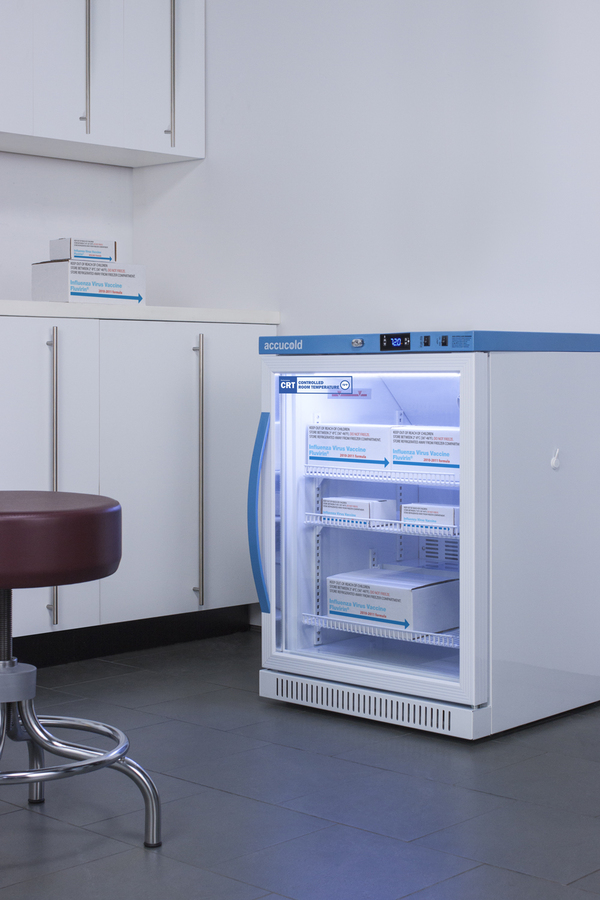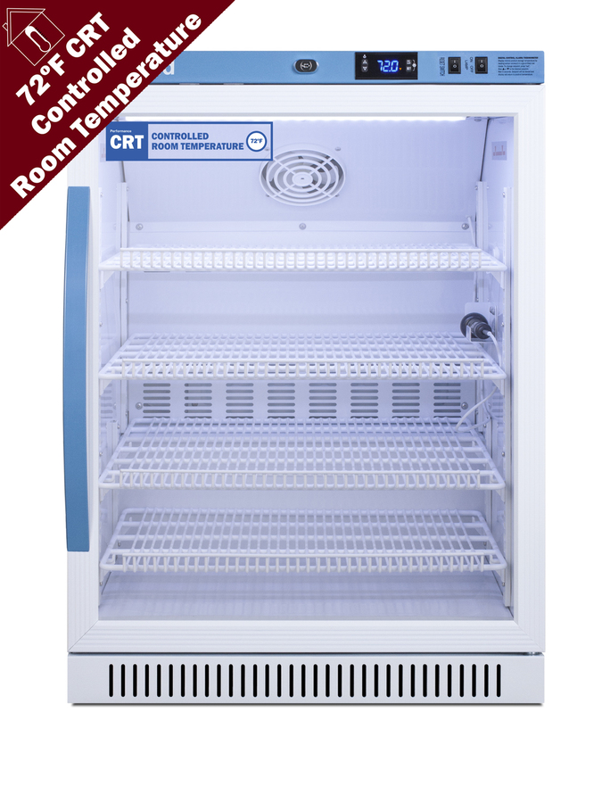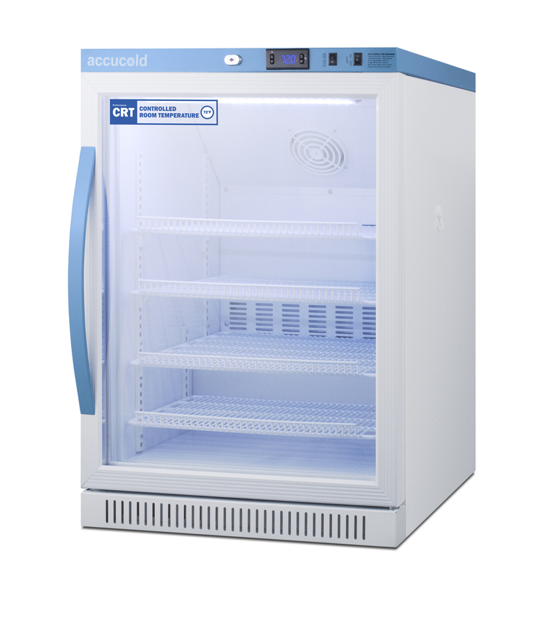 Accucold's Performance Series Controlled Room Temperature Cabinets offer purpose-built storage solutions for medication requiring a stable room temperature environment. The ARG6PV-CRT is a 6 cu.ft. upright unit pre-set to 72ºF, with an adjustable range from 68º to 77ºF. It is sized at 32.5 inches high for use in most ADA compliant applications. The microprocessor temperature controller is externally located to minimize door openings, helping to protect stored contents from ambient temperature. The buffered temperature probe is encased in a glycol-filled bottle to better simulate temperature of the stored product, with an additional sensor that reads air temperature to ensure superior temperature control. The current and min/max temperature display is viewable in Celsius or Fahrenheit to the nearest tenth of a degree. The audible and visual temperature alarm sounds if the unit's interior goes out of range. Additional alarms include a power failure alert, door open alarm, and sensor failure alarm. This unit is equipped with remote alarm contacts in the rear and a 1/2" probe port on the right side to accept additional monitoring devices. A hospital grade cord with 'green dot' plug is also included for added safety in high traffic areas. Inside, the ARG6PV-CRT utilizes adjustable cycle defrost operation to avoid temperature spikes. Optimized forced air cooling with an internal fan to ensure excellent temperature stability and uniformity with rapid recovery after door openings. The adjustable plastic-coated wire shelves can be positioned at 1/2" increments to accommodate virtually any sized item. This unit includes LED internal lighting with an on/off rocker switch. The interior is constructed from white powder coated metal to ensure added durability and better temperature retention. The ARG6PV-CRT comes in a white cabinet finish with a blue accented control panel. The factory-installed antimicrobial handle is powder-coated with naturally occurring silver ions, which help to reduce the spread of germs, allowing for a safer, cleaner user experience. The double pane tempered glass door provides a full view of the interior. The user-reversible door ships with a right hand swing and self-closing function. This model includes a factory-installed lock and ships with two keys for staff use. Powerful magnetic gaskets ensure a positive seal. Designed with hydrocarbon refrigerant, the ARG6PV-CRT provides an energy efficient solution to stabilized room temperature storage, even when ambient temperatures can reach temperatures as cold as 68ºF or warm as 86ºF. This unit is Pyxis, Omnicell, and AcuDose RX compatible. Additional sizes, as well as solid door options, are also available.