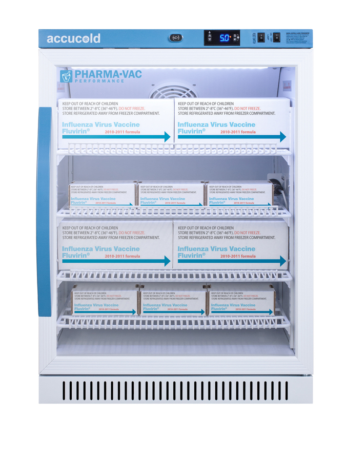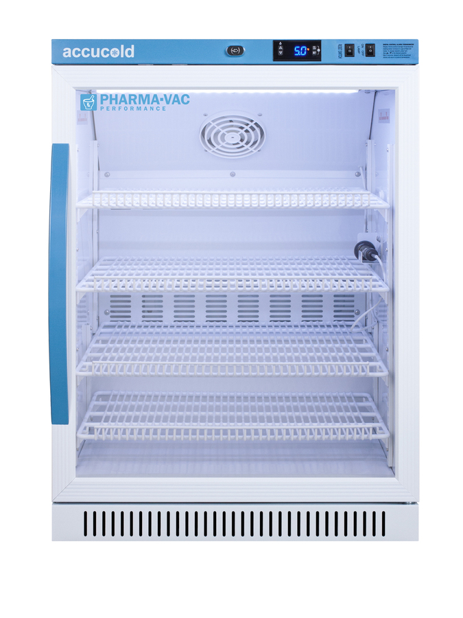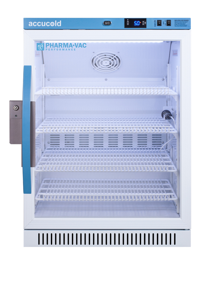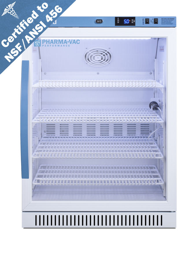 Accucold is proud to lead the industry with the largest line of cold storage product sizes certified to NSF/ANSI 456 Vaccine Storage Standard. The Pharma-Vac Performance Series supports meeting regulations and guidelines from the CDC, State Agencies, World Health Organization, and other Health Ministries on vaccine storage and handling. The ARG6PV456 is a 6 cu.ft. all-refrigerator sized at 32.5 inches high for use in most ADA compliant applications. The adjustable control range allows you to manage the temperature between +2 to +8ºC. The microprocessor temperature controller is externally located to minimize door openings, helping to protect stored contents from ambient temperature. The buffered temperature probe is encased in a glycol-filled bottle to better simulate temperature of the stored product, with an additional sensor that reads air temperature to ensure superior temperature control. The current and min/max temperature display is viewable in Celsius or Fahrenheit to the nearest tenth of a degree. The audible and visual temperature alarm sounds if the unit's interior goes out of range. Additional alarms include a power failure alert, door open alarm, and sensor failure alarm. This unit is equipped with remote alarm contacts in the rear and a 1/2" probe port on the right side to accept additional monitoring devices. A hospital grade cord with 'green dot' plug is also included for added safety in high traffic areas. Inside, the ARG6PV456 utilizes adjustable cycle defrost operation to avoid temperature spikes. Optimized forced air cooling with an internal fan to ensure excellent temperature stability and uniformity with rapid recovery after door openings. The adjustable plastic-coated wire shelves can be positioned at 1/2" increments to accommodate virtually any sized item. This unit includes LED internal lighting with an on/off rocker switch. The interior is constructed from white powder coated metal to ensure added durability and better temperature retention. The ARG6PV456 comes in a white cabinet finish with a blue accented control panel. The factory-installed antimicrobial handle is powder-coated with naturally occurring silver ions, which help to reduce the spread of germs, allowing for a safer, cleaner user experience. The double pane tempered glass door provides a full view of the interior. The door ships with a right hand swing and self-closing function. This model includes a factory-installed lock and ships with two keys for staff use. Powerful magnetic gaskets ensure a positive seal. Designed with hydrocarbon refrigerant, the ARG6PV456 provides an energy efficient solution to vaccine storage. This unit is Pyxis, Omnicell, and AcuDose RX compatible. Additional sizes, as well as solid door options, are also available. Explore the full Pharma-Vac NSF 456 series at accucold.com/pharmavac. ABOUT NSF 456: NSF/ANSI 456 is a voluntary standard introduced in 2021 that was designed to establish the performance and construction requirements for vaccine refrigeration. Models certified to this standard undergo strict testing to confirm temperatury consistency. All Accucold units approved to NSF 456 for vaccine storage are certified by an independent testing agency.