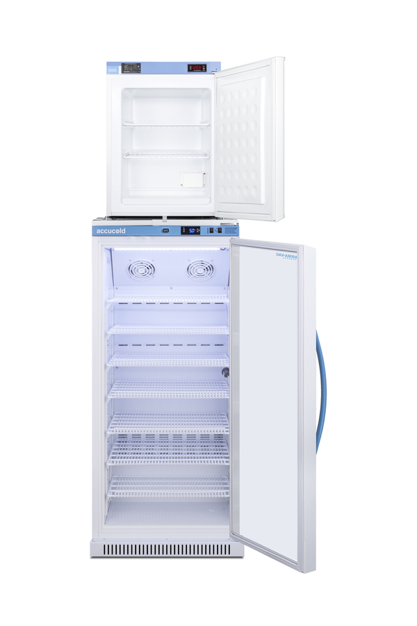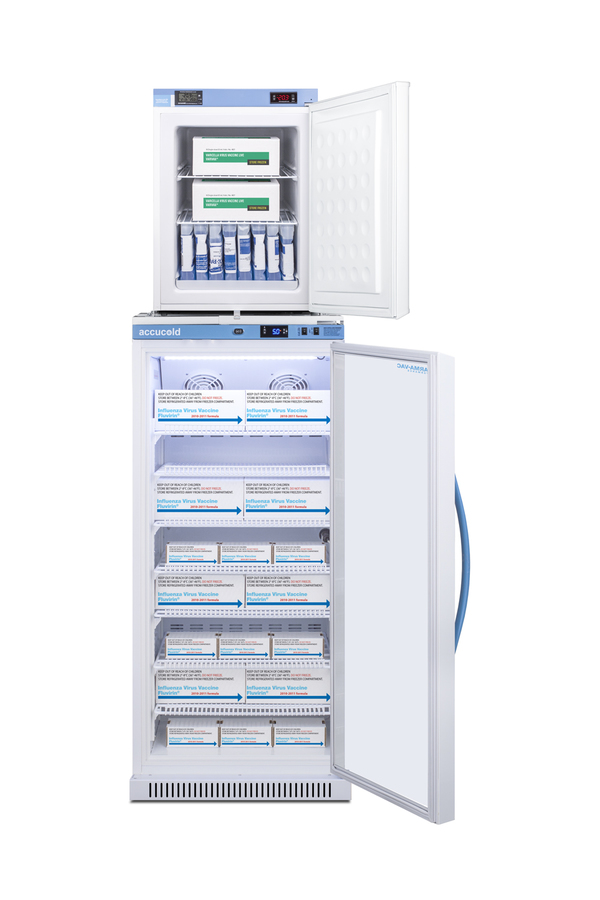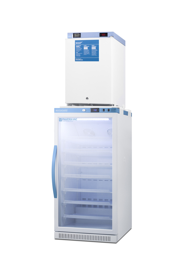Accucold offers innovative solutions to vaccine storage with stackable purpose-built refrigerator-freezer combinations design to support meeting CDC/VFC/VFA guidelines. Sized just under 24" wide, the ARG8PV-FS30LSTACKMED2 combines the 8 cu.ft. ARG8PV auto defrost all-refrigerator with the compact FS30LMED2 all-freezer into one slim footprint using Accucold's StackRack. This ships in three boxes and requires some minor assembly upon delivery. Refrigerator ARG8PV is part of Accucold's Pharma-Vac Performance Series, designed to meet the demanding needs of vaccine storage. It utilizes a microprocessor temperature controller with an adjustable control range from +2 to +8ºC. The buffered temperature probe is encased in a glycol-filled bottle to better simulate temperature of the stored product, with an additional sensor that reads air temperature to ensure superior temperature control. The current and min/max temperature display is viewable in Celsius or Fahrenheit to the nearest tenth of a degree. The audible and visual temperature alarm sounds if the unit's interior goes out of range. Additional alarms include a power failure alert, door open alarm, and sensor failure alarm. This unit is equipped with remote alarm contacts in the rear and a 1/2" probe port on the right side to accept additional monitoring devices. A hospital grade cord with 'green dot' plug is also included for added safety in high traffic areas. Inside, the ARG8PV utilizes adjustable cycle defrost operation to avoid temperature spikes. Optimized forced air cooling with two internal fans ensures excellent temperature stability and uniformity with rapid recovery after door openings. The adjustable plastic-coated wire shelves can be positioned at 1/2" increments to accommodate virtually any sized item. We include seven shelves, more than competitor products providing to maximize interior shelving storage area. This unit includes LED internal lighting with an on/off rocker switch. The interior is constructed from white powder coated metal to ensure added durability and better temperature retention. Designed to be stacked on top of the ARG8PV, the FS30LMED2 freezer utilizes manual defrost operation, with a digital control panel and NIST calibrated thermometer that provides a continuous display of the current and high/low temperature. This unit is also equipped with a temperature alarm and access port to accept additional monitoring equipment. The 1.8 cu.ft. interior with two adjustable wire shelves provide ample storage, while it can operate at temperatures as low as -20°C, ideal for vaccine storage and other sensitive materials. Both units include front-mounted keyed locks and powerful magnetic gaskets to ensure a positive seal. The refrigerator has a self-closing door for added protection in high traffic settings, and comes with a factory-installed antimicrobial handle that is powder-coated with naturally occurring silver ions, which help to reduce the spread of germs, allowing for a safer, cleaner user experience. Additional stacked combinations are available, including smaller sizes and units with glass doors. Browse Accucold's website for more information, or contact our sales team at 718-893-3900 to discuss your equipment needs. NOTE: Accucold refrigerators are purpose-built to the support meeting the current CDC (Centers for Disease Control) guidelines for the storage of vaccines. At this time, Accucold refrigerators have not been evaluated to the new NSF 456 standard. As referenced in the current Vaccine Storage and Handling Toolkit, these units incorporate microprocessor controls and forced air circulation for stable operation between 2 and 8ºC. For additional temperature assurance, the CDC recommends a calibrated digital data logger (DDL), which can be added with the factory-installed option DL2B or addition of the DL2BKit accessory.