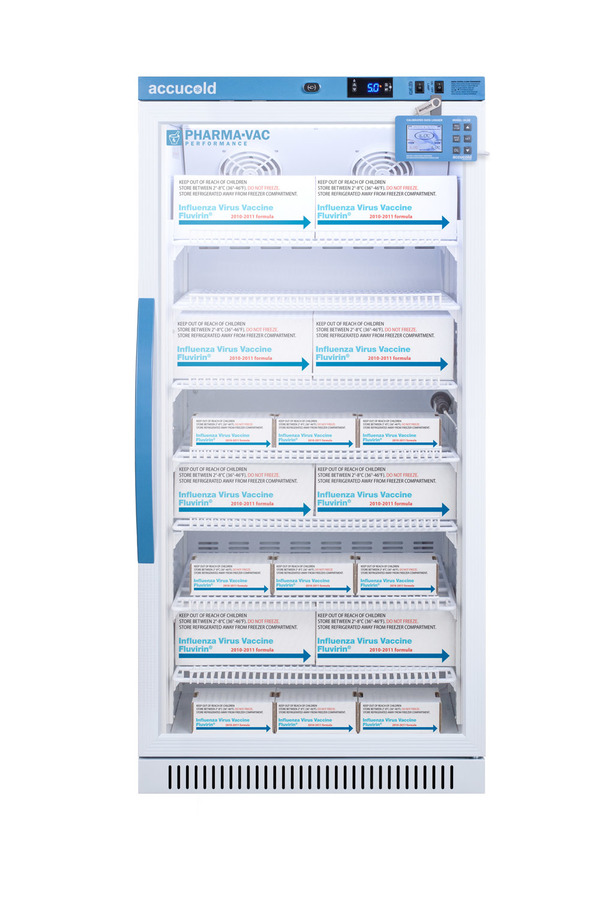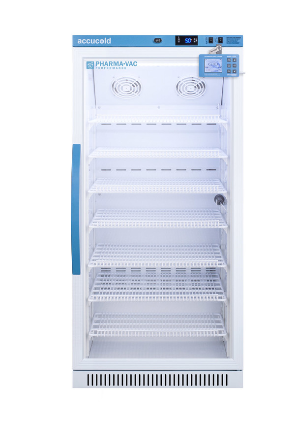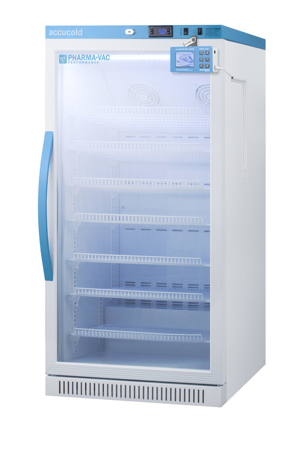 Accucold's Pharma-Vac Performance Series are upright all-refrigerators designed and purpose-built for pharmacy, medication, and vaccine applications to support meeting CDC/VFC/VFA guidelines, with a powder-coated silver ion handle that helps prevent germ spread. The ARG8PVDL2B is an 8 cu.ft. all-refrigerator with an adjustable control range from +2 to +8ºC. The microprocessor temperature controller is externally located to minimize door openings, helping to protect stored contents from ambient temperature. The buffered temperature probe is encased in a glycol-filled bottle to better simulate temperature of the stored product, with an additional sensor that reads air temperature to ensure superior temperature control. The current and min/max temperature display is viewable in Celsius or Fahrenheit to the nearest tenth of a degree. This refrigerator includes a high/low temperature alarm, as well as a power failure alert, door open alarm, and sensor failure alarm. This unit is equipped with remote alarm contacts in the rear and a 1/2" probe port. A hospital grade cord with 'green dot' plug is also included for added safety in high traffic areas. We also include our DL2B digital data logger to be mounted to the door, a feature recommended by the CDC, VFC and VFA for vaccine storage. This password-protected DDL is NIST calibrated in our ISO/IEC 17025:2017 accredited laboratory and offers a large LCD display of the current and high/low temperature, recording up to 32,000 data groups to its internal memory or even more on the included 4GB USB flash drive. Data can be viewed through a PC or Mac in Microsoft Excel or any .CSV compatible program. Users can set their own recording intervals starting at increments of 10 seconds to best meet a facility's specific logging needs. We include a 2-year certificate of calibration beginning the date of manufacture. The logger can be re-calibrated in our laboratories after the certificate expires. (For additional information on the DDL, see the DL2BKit listing on our website.) Inside, the ARG8PVDL2B utilizes adjustable cycle defrost operation to avoid temperature spikes. Optimized forced air cooling with two internal fans ensures excellent temperature stability and uniformity with rapid recovery after door openings. The adjustable plastic-coated wire shelves can be positioned at 1/2" increments to accommodate virtually any sized item. We include seven shelves, more than competitor products providing to maximize interior shelving storage area. This unit includes LED internal lighting with an on/off rocker switch. The interior is constructed from white powder coated metal to ensure added durability and better temperature retention. The ARG8PVDL2B comes in a white cabinet finish with a blue accented control panel. The factory-installed antimicrobial handle is powder-coated with naturally occurring silver ions, which help to reduce the spread of germs, allowing for a safer, cleaner user experience. The double pane tempered glass door provides a full view of the interior. This model includes a factory-installed lock and ships with two keys for staff use. Powerful magnetic gaskets ensure a positive seal. Designed with hydrocarbon refrigerant, the ARG8PVDL2B provides an energy efficient solution to vaccine storage. This unit is Pyxis, Omnicell, and AcuDose RX compatible. Additional sizes, as well as solid door options, are also available. Explore the full Pharma-Vac series at accucold.com/pharmavac. Note: The DL2B data logger adds 1 1/2" to the depth of the upper right hand corner of the door (not included in the listed specifications on this page). NOTE: Accucold refrigerators are purpose-built to the support meeting the current CDC (Centers for Disease Control) guidelines for the storage of vaccines. Units that end in suffix "456" have been certified to the new NSF 456 standard. As referenced in the current Vaccine Storage and Handling Toolkit, these units incorporate microprocessor controls and forced air circulation for stable operation between 2 and 8ºC. For additional temperature assurance, the CDC recommends a calibrated digital data logger (DDL), which can be added with the factory-installed option DL2B or addition of the DL2BKit accessory.