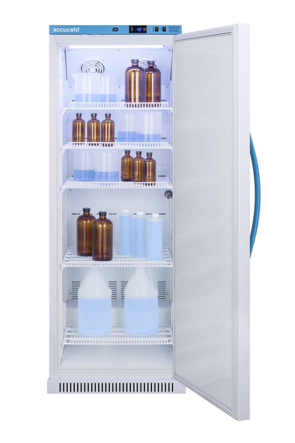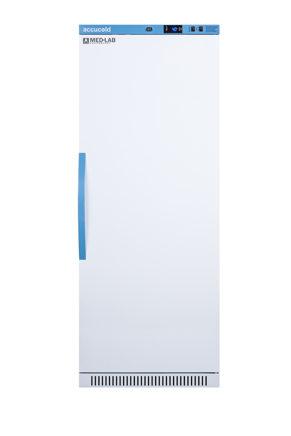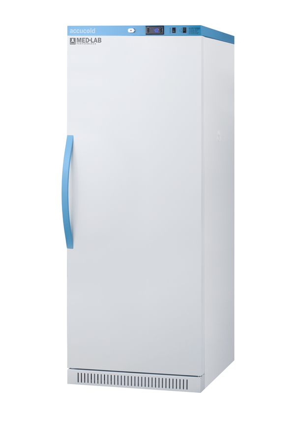 Accucold's Med-Lab Performance Series all-refrigerators are designed and purpose-built to meet the demanding needs of life science, laboratory, and medical cold storage applications, with a powder-coated silver ion handle that helps prevent germ spread. The ARS12ML is a 12 cu.ft. all-refrigerator with an adjustable control range from +2 to +10ºC. The microprocessor temperature controller is externally located to minimize door openings, helping to protect stored contents from ambient temperature. The buffered temperature probe is encased in a glycol-filled bottle to better simulate temperature of the stored product, with an additional sensor that reads air temperature to ensure superior temperature control. The current and min/max temperature display is viewable in Celsius or Fahrenheit to the nearest tenth of a degree. The audible and visual temperature alarm sounds if the unit's interior goes out of range. Additional alarms include a power failure alert, door open alarm, and sensor failure alarm. This unit is equipped with remote alarm contacts in the rear and a 1/2" probe port on the right side to accept additional monitoring devices. A hospital grade cord with 'green dot' plug is also included for added safety in high traffic areas. Inside, the ARS12ML utilizes adjustable cycle defrost operation to avoid temperature spikes. Optimized forced air cooling with one internal fan ensures excellent temperature stability and uniformity with rapid recovery after door openings. The adjustable plastic-coated wire shelves can be positioned at 1/2" increments to accommodate virtually any sized item. We include seven shelves, more than competitor products providing to maximize interior shelving storage area. This unit includes LED internal lighting with an on/off rocker switch. The interior is constructed from white powder coated metal to ensure added durability and better temperature retention. The ARS12ML comes in a white cabinet finish with a blue accented control panel. The user-reversible door comes with a factory-installed antimicrobial handle that is powder-coated with naturally occurring silver ions, which help to reduce the spread of germs, allowing for a safer, cleaner user experience. This model also includes a factory-installed lock and ships with two keys for staff use. Powerful magnetic gaskets ensure a positive seal. Designed with hydrocarbon refrigerant, the ARS12ML provides an energy efficient solution to laboratory and life science storage. This unit is Pyxis, Omnicell, and AcuDose RX compatible. Additional choices are also available in a variety of sizes. Explore the full Med-Lab series at accucold.com/medlab. NOTE: Accucold refrigerators are purpose-built to the support meeting the current CDC (Centers for Disease Control) guidelines for the storage of vaccines. At this time, Accucold refrigerators have not been evaluated to the new NSF 456 standard. As referenced in the current Vaccine Storage and Handling Toolkit, these units incorporate microprocessor controls and forced air circulation for stable operation. For additional temperature assurance, the CDC recommends a calibrated digital data logger (DDL), which can be added with the factory-installed option DL2B or addition of the DL2BKit accessory.