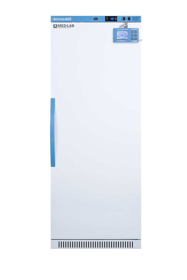 Accucold's Med-Lab Performance Series all-refrigerators are designed and purpose-built to meet the demanding needs of life science, laboratory, and medical cold storage applications, with a powder-coated silver ion handle that helps prevent germ spread. The ARS12MLDL2B is a 12 cu.ft. all-refrigerator with an adjustable control range from +2 to +10ºC. The microprocessor temperature controller is externally located to minimize door openings, helping to protect stored contents from ambient temperature. The buffered temperature probe is encased in a glycol-filled bottle to better simulate temperature of the stored product, with an additional sensor that reads air temperature to ensure superior temperature control. The current and min/max temperature display is viewable in Celsius or Fahrenheit to the nearest tenth of a degree. This refrigerator includes a high/low temperature alarm, as well as a power failure alert, door open alarm, and sensor failure alarm. This unit is equipped with remote alarm contacts in the rear and a 1/2" probe port. A hospital grade cord with 'green dot' plus is also included for added safety in high traffic areas. We also include our DL2B digital data logger to be mounted to the door, a feature recommended by the CDC, VFC and VFA for vaccine storage. This password-protected DDL is NIST calibrated in our ISO/IEC 17025:2017 accredited laboratory and offers a large LCD display of the current and high/low temperature, recording up to 32,000 data groups to its internal memory or even more on the included 4GB USB flash drive. Data can be viewed through a PC or Mac in Microsoft Excel or any .CSV compatible program. Users can set their own recording intervals starting at increments of 10 seconds to best meet a facility's specific logging needs. We include a 2-year certificate of calibration beginning the date of manufacture. The logger can be re-calibrated in our laboratories after the certificate expires. (For additional information on the DDL, see the DL2BKit listing on our website.) Inside, the ARS12MLDL2B utilizes adjustable cycle defrost operation to avoid temperature spikes. Optimized forced air cooling with one internal fan ensures excellent temperature stability and uniformity with rapid recovery after door openings. The adjustable plastic-coated wire shelves can be positioned at 1/2" increments to accommodate virtually any sized item. We include seven shelves, more than competitor products providing to maximize interior shelving storage area. This unit includes LED internal lighting with an on/off rocker switch. The interior is constructed from white powder coated metal to ensure added durability and better temperature retention. The ARS12MLDL2B comes in a white cabinet finish with a blue accented control panel. The factory-installed antimicrobial handle is powder-coated with naturally occurring silver ions, which help to reduce the spread of germs, allowing for a safer, cleaner user experience. This model includes a factory-installed lock and ships with two keys for staff use. Powerful magnetic gaskets ensure a positive seal. Designed with hydrocarbon refrigerant, the ARS12MLDL2B provides an energy efficient solution to vaccine storage. This unit is Pyxis, Omnicell, and AcuDose RX compatible. Additional sizes, as well as solid door options, are also available. Explore the full Med-Lab series at accucold.com/medlab. Note: The DL2B data logger adds 1 1/2" to the depth of the upper right hand corner of the door (not included in the listed specifications on this page). NOTE: Accucold refrigerators are purpose-built to the support meeting the current CDC (Centers for Disease Control) guidelines for the storage of vaccines. At this time, Accucold refrigerators have not been evaluated to the new NSF 456 standard. As referenced in the current Vaccine Storage and Handling Toolkit, these units incorporate microprocessor controls and forced air circulation for stable operation, as well as a calibrated digital data logger (DDL) to display the current and high/low temperature.