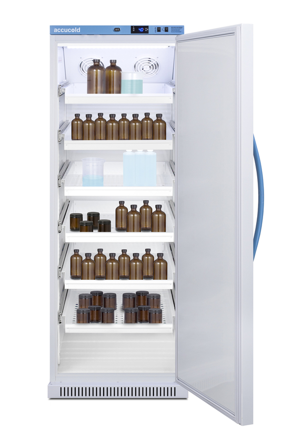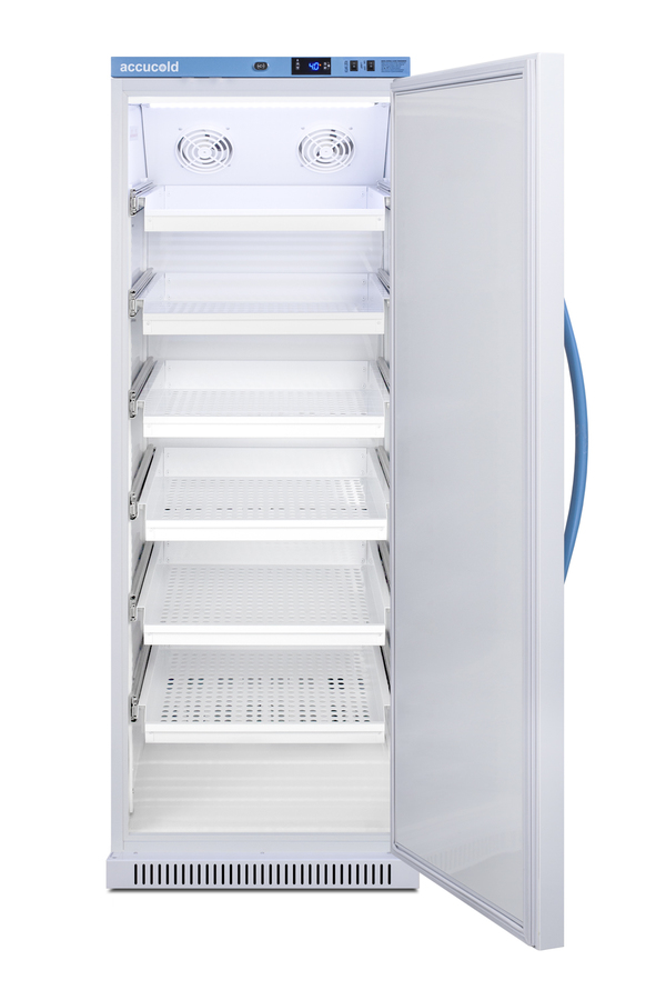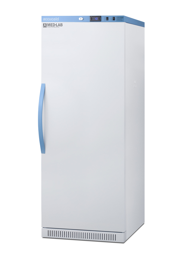 Accucold's Med-Lab Performance Series all-refrigerators are designed and purpose-built to meet the demanding needs of life science, laboratory, and medical cold storage applications, with a powder-coated silver ion handle that helps prevent germ spread. The ARS12MLDR is a 12 cu.ft. all-refrigerator with an adjustable control range from +2 to +10ºC. The microprocessor temperature controller is externally located to minimize door openings, helping to protect stored contents from ambient temperature. The buffered temperature probe is encased in a glycol-filled bottle to better simulate temperature of the stored product, with an additional sensor that reads air temperature to ensure superior temperature control. The current and min/max temperature display is viewable in Celsius or Fahrenheit to the nearest tenth of a degree. The audible and visual temperature alarm sounds if the unit's interior goes out of range. Additional alarms include a power failure alert, door open alarm, and sensor failure alarm. This unit is equipped with remote alarm contacts in the rear and a 1/2" probe port on the right side to accept additional monitoring devices. A hospital grade cord with 'green dot' plug is also included for added safety in high traffic areas. Inside, the ARS12MLDR utilizes adjustable cycle defrost operation to avoid temperature spikes. Optimized forced air cooling with one internal fan ensures excellent temperature stability and uniformity with rapid recovery after door openings. Six white powder-coated aluminum drawers provide ample storage and easy organization. Positioned on ball-bearing glides, the drawers offer full-extension for complete product access. Additionally, each drawer is removable allowing for transport of contents as needed. The drawers also lock into place for added security, while the perforated bottom ensures proper ventilation throughout the unit. LED internal lighting with an on/off rocker switch attractively illuminates the interior for easy viewing. The interior is constructed from white powder-coated metal to ensure added durability and better temperature retention. The ARS12MLDR comes in a white cabinet finish with a blue accented control panel. The user-reversible door comes with a factory-installed antimicrobial handle that is powder-coated with naturally occurring silver ions, which help to reduce the spread of germs, allowing for a safer, cleaner user experience. This model also includes a factory-installed lock and ships with two keys for staff use. Powerful magnetic gaskets ensure a positive seal. Designed with hydrocarbon refrigerant, the ARS12MLDR provides an energy-efficient solution to laboratory and life science storage. This unit is Pyxis, Omnicell, and AcuDose RX compatible. Additional sizes, door options, and units with a combination of standard shelving and drawers are also available. Explore the full Med-Lab series at accucold.com/medlab. NOTE: Accucold refrigerators are purpose-built to the support meeting the current CDC (Centers for Disease Control) guidelines for the storage of vaccines. At this time, Accucold refrigerators have not been evaluated to the new NSF 456 standard. As referenced in the current Vaccine Storage and Handling Toolkit, these units incorporate microprocessor controls and forced air circulation for stable operation. For additional temperature assurance, the CDC recommends a calibrated digital data logger (DDL), which can be added with the factory-installed option DL2B or addition of the DL2BKit accessory.