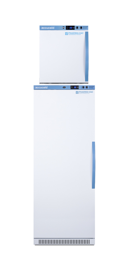 Accucold offers innovative solutions to vaccine storage with our Performance Series stackable purpose-built refrigerator-freezer combinations designed to support meeting CDC/VFC/VFA guidelines. Sized just under 20" wide, the ARS12PV-AFZ1PVSTACKLHD combines the 12 cu.ft. ARG12PV auto defrost all-refrigerator with the 1.4 cu.ft. AFZ1PV all-freezer into one slim footprint using Accucold's StackRack. This ships in three boxes and requires some minor assembly upon delivery. The Pharma-Vac Performance Series is designed to meet the demanding needs of vaccine storage. Both units utilize a microprocessor temperature controller (refrigerator range: +2 to +8ºC; freezer range: -30 to -10ºC). The buffered temperature probe is encased in a glycol-filled bottle to better simulate temperature of the stored product, with an additional sensor that reads air temperature to ensure superior temperature control. The current and min/max temperature display is viewable in Celsius or Fahrenheit to the nearest tenth of a degree. The audible and visual temperature alarms sound if the units' interiors go out of range. Additional alarms include a power failure alert, door open alarm, and sensor failure alarm. Both units are equipped with remote alarm contacts in the rear and a 1/2" probe port on the right side to accept additional monitoring devices. The factory-installed antimicrobial handles are powder-coated with naturally occurring silver ions, which help to reduce the spread of germs, allowing for a safer, cleaner user experience. A hospital grade cord with 'green dot' plug is also included for added safety in high traffic areas. Inside, the ARS12PV refrigerator utilizes adjustable cycle defrost operation to avoid temperature spikes. Optimized forced air cooling with an internal fan ensures excellent temperature stability and uniformity with rapid recovery after door openings. The adjustable plastic-coated wire shelves can be positioned at 1/2" increments to accommodate virtually any sized item. This unit includes LED internal lighting with an on/off rocker switch. The interior is constructed from white powder coated metal to ensure added durability and better temperature retention. Freezer model AFZ1PV can be installed on top of the refrigerator with our stacking rack. This freezer utilizes static manual defrost operation. It comes with two adjustable shelves. Both units include front-mounted keyed locks and powerful magnetic gaskets to ensure a positive seal, with self-closing doors for added protection in high traffic settings. Additional stacked combinations are available. Browse Accucold's website for more information, or contact our sales team at 718-893-3900 to discuss your equipment needs. NOTE: Accucold refrigerators are purpose-built to the support meeting the current CDC (Centers for Disease Control) guidelines for the storage of vaccines. As referenced in the current Vaccine Storage and Handling Toolkit, these units incorporate microprocessor controls and forced air circulation for stable operation between 2 and 8ºC. For additional temperature assurance, the CDC recommends a calibrated digital data logger (DDL), which can be added with the factory-installed option DL2B or addition of the DL2BKit accessory.
