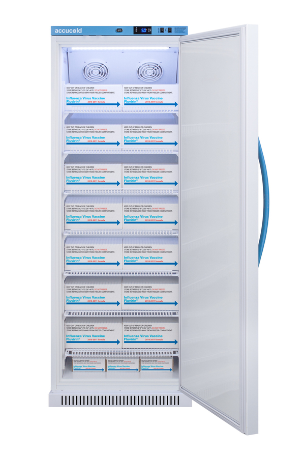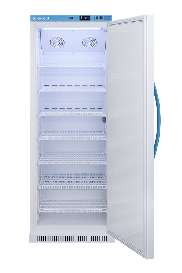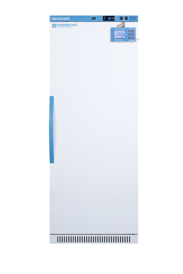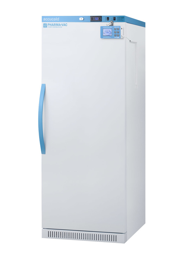 Accucold's Pharma-Vac Performance Series are upright all-refrigerators designed and purpose-built for pharmacy, medication, and vaccine applications to support meeting CDC/VFC/VFA guidelines, with a powder-coated silver ion handle that helps prevent germ spread. The ARS12PV is a 12 cu.ft. all-refrigerator with an adjustable control range from +2 to +8ºC. The microprocessor temperature controller is externally located to minimize door openings, helping to protect stored contents from ambient temperature. The buffered temperature probe is encased in a glycol-filled bottle to better simulate temperature of the stored product, with an additional sensor that reads air temperature to ensure superior temperature control. The current and min/max temperature display is viewable in Celsius or Fahrenheit to the nearest tenth of a degree. This refrigerator includes a high/low temperature alarm, as well as a power failure alert, door open alarm, and sensor failure alarm. This unit is equipped with remote alarm contacts in the rear and a 1/2" probe port. A hospital grade cord with 'green dot' plug is also included for added safety in high traffic areas. We also include our DL2B digital data logger to be mounted to the door, a feature recommended by the CDC, VFC and VFA for vaccine storage. This password-protected DDL is NIST calibrated in our ISO/IEC 17025:2017 accredited laboratory and offers a large LCD display of the current and high/low temperature, recording up to 32,000 data groups to its internal memory or even more on the included 4GB USB flash drive. Data can be viewed through a PC or Mac in Microsoft Excel or any .CSV compatible program. Users can set their own recording intervals starting at increments of 10 seconds to best meet a facility's specific logging needs. We include a 2-year certificate of calibration beginning the date of manufacture. The logger can be re-calibrated in our laboratories after the certificate expires. (For additional information on the DDL, see the DL2BKit listing on our website.) Inside, the ARS12PVDL2B utilizes adjustable cycle defrost operation to avoid temperature spikes. Optimized forced air cooling with one internal fan ensures excellent temperature stability and uniformity with rapid recovery after door openings. The adjustable plastic-coated wire shelves can be positioned at 1/2" increments to accommodate virtually any sized item. We include seven shelves, more than competitor products providing to maximize interior shelving storage area. This unit includes LED internal lighting with an on/off rocker switch. The interior is constructed from white powder coated metal to ensure added durability and better temperature retention. The ARS12PVDL2B comes in a white cabinet finish with a blue accented control panel. The factory-installed antimicrobial handle is powder-coated with naturally occurring silver ions, which help to reduce the spread of germs, allowing for a safer, cleaner user experience. This model includes a factory-installed lock and ships with two keys for staff use. Powerful magnetic gaskets ensure a positive seal. Designed with hydrocarbon refrigerant, the ARS12PVDL2B provides an energy efficient solution to vaccine storage. This unit is Pyxis, Omnicell, and AcuDose RX compatible. Additional sizes, as well as glass door options, are also available. Explore the full Pharma-Vac series at accucold.com/pharmavac. Note: The DL2B data logger adds 1 1/2" to the depth of the upper right hand corner of the door (not included in the listed specifications on this page). NOTE: Accucold refrigerators are purpose-built to the support meeting the current CDC (Centers for Disease Control) guidelines for the storage of vaccines. Units that end in suffix "456" have been certified to the new NSF 456 standard. As referenced in the current Vaccine Storage and Handling Toolkit, these units incorporate microprocessor controls and forced air circulation for stable operation between 2 and 8ºC. For additional temperature assurance, the CDC recommends a calibrated digital data logger (DDL), which can be added with the factory-installed option DL2B or addition of the DL2BKit accessory.