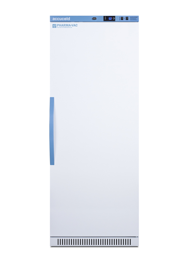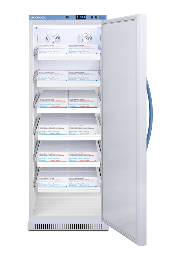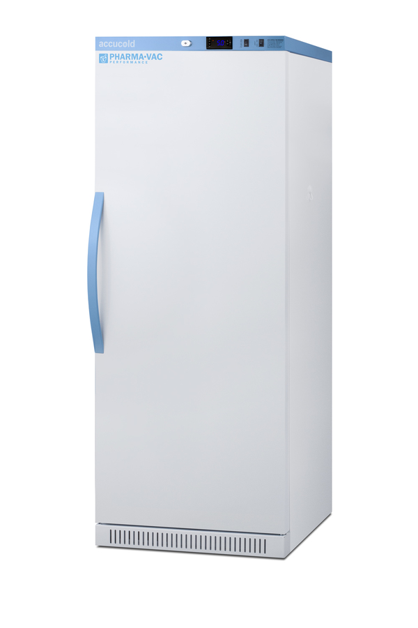 Accucold's Pharma-Vac Performance Series are upright all-refrigerators designed and purpose-built for pharmacy, medication, and vaccine applications to support meeting CDC/VFC/VFA guidelines, with a powder-coated silver ion handle that helps prevent germ spread. The ARS12PVDR is a 12 cu.ft. all-refrigerator with an adjustable control range from +2 to +8ºC. The microprocessor temperature controller is externally located to minimize door openings, helping to protect stored contents from ambient temperature. The buffered temperature probe is encased in a glycol-filled bottle to better simulate temperature of the stored product, with an additional sensor that reads air temperature to ensure superior temperature control. The current and min/max temperature display is viewable in Celsius or Fahrenheit to the nearest tenth of a degree. The audible and visual temperature alarm sounds if the unit's interior goes out of range. Additional alarms include a power failure alert, door open alarm, and sensor failure alarm. This unit is equipped with remote alarm contacts in the rear and a 1/2" probe port on the right side to accept additional monitoring devices. A hospital grade cord with 'green dot' plug is also included for added safety in high traffic areas. Inside, the ARS12PVDR utilizes adjustable cycle defrost operation to avoid temperature spikes. Optimized forced air cooling with one internal fan ensures excellent temperature stability and uniformity with rapid recovery after door openings. Six white powder-coated aluminum drawers provide ample storage and easy organization. Positioned on ball-bearing glides, the drawers offer full-extension for complete product access. Additionally, each drawer is removable allowing for transport of contents as needed. The drawers also lock into place for added security, while the perforated bottom ensures proper ventilation throughout the unit. LED internal lighting with an on/off rocker switch attractively illuminates the interior for easy viewing. The interior is constructed from white powder coated metal to ensure added durability and better temperature retention. The ARS12PVDR comes in a white cabinet finish with a blue accented control panel. The user-reversible door comes with a factory-installed antimicrobial handle that is powder-coated with naturally occurring silver ions, which help to reduce the spread of germs, allowing for a safer, cleaner user experience. This model also includes a factory-installed lock and ships with two keys for staff use. Powerful magnetic gaskets ensure a positive seal. Designed with hydrocarbon refrigerant, the ARS12PVDR provides an energy efficient solution to vaccine storage. This unit is Pyxis, Omnicell, and AcuDose RX compatible. Additional sizes, door options, and units with a combination of standard shelving and drawers are also available. Explore the full Pharma-Vac series at accucold.com/pharmavac. NOTE: Accucold refrigerators are purpose-built to the support meeting the current CDC (Centers for Disease Control) guidelines for the storage of vaccines. Units that end in suffix "456" have been certified to the new NSF 456 standard. As referenced in the current Vaccine Storage and Handling Toolkit, these units incorporate microprocessor controls and forced air circulation for stable operation between 2 and 8ºC. For additional temperature assurance, the CDC recommends a calibrated digital data logger (DDL), which can be added with the factory-installed option DL2B or addition of the DL2BKit accessory.