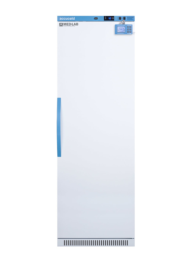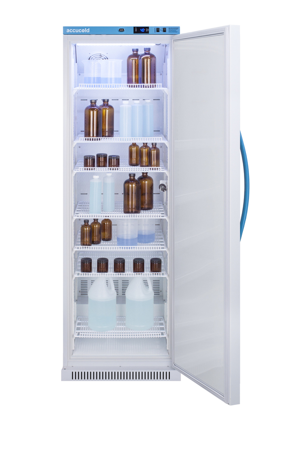 Accucold's Med-Lab Performance Series all-refrigerators are designed and purpose-built to meet the demanding needs of life science, laboratory, and medical cold storage applications, with a powder-coated silver ion handle that helps prevent germ spread. The ARS15PMLD2B is a 15 cu.ft. all-refrigerator with an adjustable control range from +2 to +10ºC. The microprocessor temperature controller is externally located to minimize door openings, helping to protect stored contents from ambient temperature. The buffered temperature probe is encased in a glycol-filled bottle to better simulate temperature of the stored product, with an additional sensor that reads air temperature to ensure superior temperature control. The current and min/max temperature display is viewable in Celsius or Fahrenheit to the nearest tenth of a degree. This refrigerator includes a high/low temperature alarm, as well as a power failure alert, door open alarm, and sensor failure alarm. This unit is equipped with remote alarm contacts in the rear and a 1/2" probe port. A hospital grade cord with 'green dot' plug is also included for added safety in high traffic areas. We also include our DL2B digital data logger to be mounted to the door, a feature recommended by the CDC, VFC and VFA for vaccine storage. This password-protected DDL is NIST calibrated in our ISO/IEC 17025:2017 accredited laboratory and offers a large LCD display of the current and high/low temperature, recording up to 32,000 data groups to its internal memory or even more on the included 4GB USB flash drive. Data can be viewed through a PC or Mac in Microsoft Excel or any .CSV compatible program. Users can set their own recording intervals starting at increments of 10 seconds to best meet a facility's specific logging needs. We include a 2-year certificate of calibration beginning the date of manufacture. The logger can be re-calibrated in our laboratories after the certificate expires. (For additional information on the DDL, see the DL2BKit listing on our website.) Inside, the ARS15MLDL2B utilizes adjustable cycle defrost operation to avoid temperature spikes. Optimized forced air cooling with one internal fan ensures excellent temperature stability and uniformity with rapid recovery after door openings. The adjustable plastic-coated wire shelves can be positioned at 1/2" increments to accommodate virtually any sized item. We include seven shelves, more than competitor products providing to maximize interior shelving storage area. This unit includes LED internal lighting with an on/off rocker switch. The interior is constructed from white powder coated metal to ensure added durability and better temperature retention. The ARS15MLDL2B comes in a white cabinet finish with a blue accented control panel. The factory-installed antimicrobial handle is powder-coated with naturally occurring silver ions, which help to reduce the spread of germs, allowing for a safer, cleaner user experience. This model includes a factory-installed lock and ships with two keys for staff use. Powerful magnetic gaskets ensure a positive seal. Designed with hydrocarbon refrigerant, the ARS15MLDL2B provides an energy efficient solution to vaccine storage. This unit is Pyxis, Omnicell, and AcuDose RX compatible. Additional sizes, as well as glass door options, are also available. Explore the full Med-Lab series at accucold.com/medlab. Note: The DL2B data logger adds 1 1/2" to the depth of the upper right hand corner of the door (not included in the listed specifications on this page). NOTE: Accucold refrigerators are purpose-built to the support meeting the current CDC (Centers for Disease Control) guidelines for the storage of vaccines. At this time, Accucold refrigerators have not been evaluated to the new NSF 456 standard. As referenced in the current Vaccine Storage and Handling Toolkit, these units incorporate microprocessor controls and forced air circulation for stable operation, as well as a calibrated digital data logger (DDL) to display the current and high/low temperature.