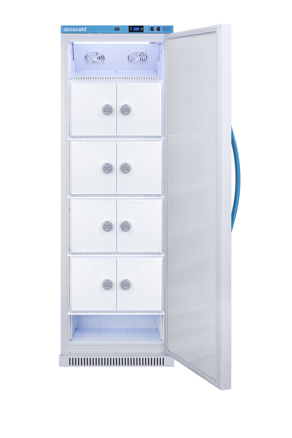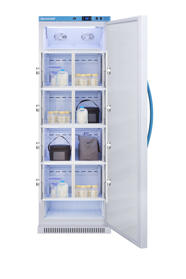 Accucold's MOMCUBE® upright all-refrigerators are designed and purpose-built for breast milk storage. All MOMCUBE® units are laboratory-tested to maintain temperature between 33-40°F, as recommended by the CDC and ideal for maternity wards, hospitals, NICUs, employee wellness rooms complying with Section 4207 of the Patient Protection and Affordable Care Act, and other facilities. The ARS15MLMCLK is a 15 cu.ft. all-refrigerator. The microprocessor digital thermostat is located in the top control panel, with an LED display of the interior temperature. The buffered temperature probe is encased in glycol to simulate the temperature of the interior's contents, while a second sensor measures interior air temperature for added control. Audible and visual alarms alert you to temperature fluctuations. Additional alarms include an open door alarm, power failure alarm, sensor alarm, and remote alarm contacts in the rear, which allow for alarm forwarding to an external remote alarm system. The pre-installed ½ inch probe hole is located in the right interior wall to allow for additional user-supplied monitoring devices. The digital display provides the min/max temperature in Fahrenheit to the nearest tenth of a degree. Users can switch to Celsius in a few simple steps. Temperature parameters are password protected but can be adjusted aftermarket. A hospital grade cord with 'green dot' plug is also included for added safety in high traffic areas. Inside, the ARS15MLMCLK boasts eight locking compartments, each with a combination lock to ensure added privacy for mothers storing their breast milk. Combination locks can be reset or overridden as needed with included master keys. The locker doors are constructed from galvanized steel, while the wire shelving and forced air cooling system with two internal fans helps to provide temperature uniformity, stability, and quick recovery from door openings. An adjustable cycle defrost system helps to avoid temperature spikes and ice build-up. A soft LED light is included with this unit with an option to turn on/off with a rocker switch. The interior is constructed from white powder coated metal providing added durability and improved temperature retention. The MOMCUBE® comes in a white cabinet with blue display panel. The factory-installed antimicrobial handle is powder-coated with naturally occurring silver ions, which help to reduce the spread of germs, allowing for a safer, cleaner user experience. The user-friendly reversible door comes standard in a right-hand swing. Magnetic gaskets ensure a sight seal for improved performance. The factory-installed lock offers additional security. The MOMCUBE is an eco-friendly solution to breast milk storage. Units of various capacity, heights, and interiors are available. Explore the entire MOMCUBE® Series on our website or contact our sales team at 718-893-3900 ext. 509 for more options.