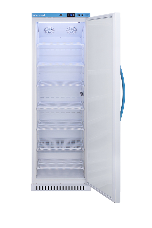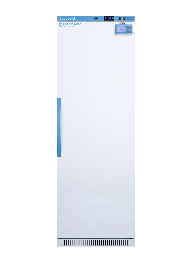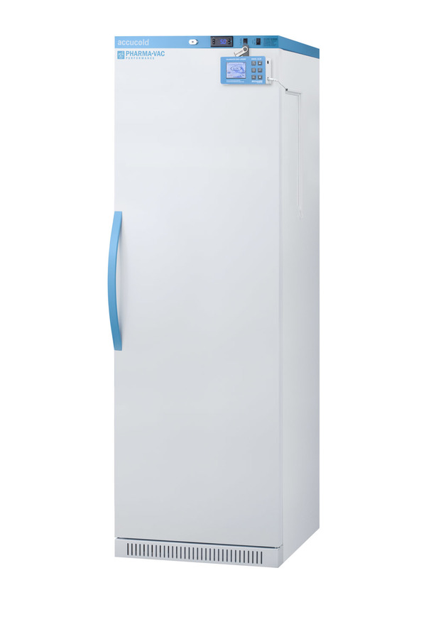 Accucold's Pharma-Vac Performance Series are upright all-refrigerators designed and purpose-built for pharmacy, medication, and vaccine applications to support meeting CDC/VFC/VFA guidelines, with a powder-coated silver ion handle that helps prevent germ spread. The ARS15PVDL2B is a 15 cu.ft. all-refrigerator with an adjustable control range from +2 to +8ºC. The microprocessor temperature controller is externally located to minimize door openings, helping to protect stored contents from ambient temperature. The buffered temperature probe is encased in a glycol-filled bottle to better simulate temperature of the stored product, with an additional sensor that reads air temperature to ensure superior temperature control. The current and min/max temperature display is viewable in Celsius or Fahrenheit to the nearest tenth of a degree. This refrigerator includes a high/low temperature alarm, as well as a power failure alert, door open alarm, and sensor failure alarm. This unit is equipped with remote alarm contacts in the rear and a 1/2" probe port. A hospital grade cord with 'green dot' plug is also included for added safety in high traffic areas. We also include our DL2B digital data logger to be mounted to the door, a feature recommended by the CDC, VFC and VFA for vaccine storage. This password-protected DDL is NIST calibrated in our ISO/IEC 17025:2017 accredited laboratory and offers a large LCD display of the current and high/low temperature, recording up to 32,000 data groups to its internal memory or even more on the included 4GB USB flash drive. Data can be viewed through a PC or Mac in Microsoft Excel or any .CSV compatible program. Users can set their own recording intervals starting at increments of 10 seconds to best meet a facility's specific logging needs. We include a 2-year certificate of calibration beginning the date of manufacture. The logger can be re-calibrated in our laboratories after the certificate expires. (For additional information on the DDL, see the DL2BKit listing on our website.) Inside, the ARS15PVDL2B utilizes adjustable cycle defrost operation to avoid temperature spikes. Optimized forced air cooling with one internal fan ensures excellent temperature stability and uniformity with rapid recovery after door openings. The adjustable plastic-coated wire shelves can be positioned at 1/2" increments to accommodate virtually any sized item. We include seven shelves, more than competitor products providing to maximize interior shelving storage area. This unit includes LED internal lighting with an on/off rocker switch. The interior is constructed from white powder coated metal to ensure added durability and better temperature retention. The ARS15PVDL2B comes in a white cabinet finish with a blue accented control panel. The factory-installed antimicrobial handle is powder-coated with naturally occurring silver ions, which help to reduce the spread of germs, allowing for a safer, cleaner user experience. This model includes a factory-installed lock and ships with two keys for staff use. Powerful magnetic gaskets ensure a positive seal. Designed with hydrocarbon refrigerant, the ARS15PVDL2B provides an energy efficient solution to vaccine storage. This unit is Pyxis, Omnicell, and AcuDose RX compatible. Additional sizes, as well as glass door options, are also available. Explore the full Pharma-Vac series at accucold.com/pharmavac. Note: The DL2B data logger adds 1 1/2" to the depth of the upper right hand corner of the door (not included in the listed specifications on this page). NOTE: Accucold refrigerators are purpose-built to the support meeting the current CDC (Centers for Disease Control) guidelines for the storage of vaccines. Units that end in suffix "456" have been certified to the new NSF 456 standard. As referenced in the current Vaccine Storage and Handling Toolkit, these units incorporate microprocessor controls and forced air circulation for stable operation between 2 and 8ºC. For additional temperature assurance, the CDC recommends a calibrated digital data logger (DDL), which can be added with the factory-installed option DL2B or addition of the DL2BKit accessory.