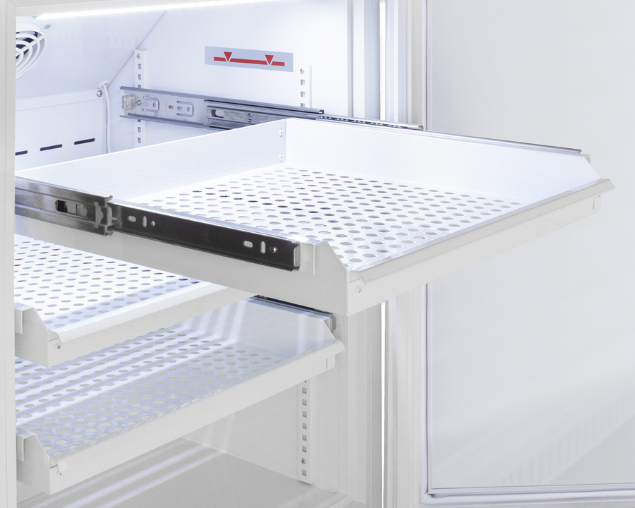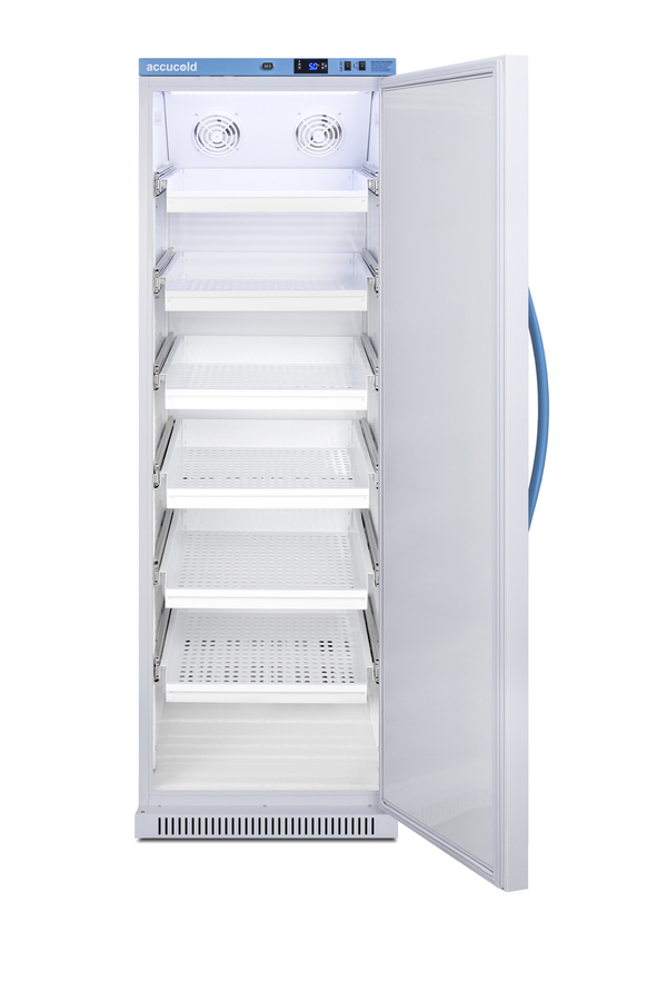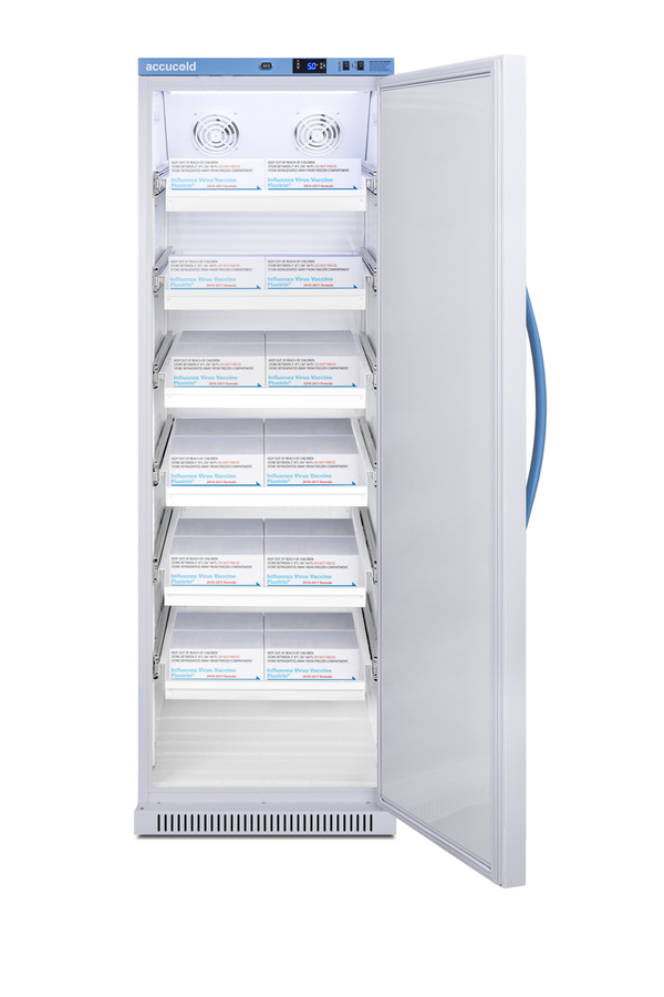 Accucold's Pharma-Vac Performance Series are upright all-refrigerators designed and purpose-built for pharmacy, medication, and vaccine applications to support meeting CDC/VFC/VFA guidelines, with a powder-coated silver ion handle that helps prevent germ spread. The ARS15PVDR is a 15 cu.ft. all-refrigerator with an adjustable control range from +2 to +8ºC. The microprocessor temperature controller is externally located to minimize door openings, helping to protect stored contents from ambient temperature. The buffered temperature probe is encased in a glycol-filled bottle to better simulate temperature of the stored product, with an additional sensor that reads air temperature to ensure superior temperature control. The current and min/max temperature display is viewable in Celsius or Fahrenheit to the nearest tenth of a degree. The audible and visual temperature alarm sounds if the unit's interior goes out of range. Additional alarms include a power failure alert, door open alarm, and sensor failure alarm. This unit is equipped with remote alarm contacts in the rear and a 1/2" probe port on the right side to accept additional monitoring devices. A hospital grade cord with 'green dot' plug is also included for added safety in high traffic areas. Inside, the ARS15PVDR utilizes adjustable cycle defrost operation to avoid temperature spikes. Optimized forced air cooling with one internal fan ensures excellent temperature stability and uniformity with rapid recovery after door openings. Six white powder-coated aluminum drawers provide ample storage and easy organization. Positioned on ball-bearing glides, the drawers offer full-extension for complete product access. Additionally, each drawer is removable allowing for transport of contents as needed. The drawers also lock into place for added security, while the perforated bottom ensures proper ventilation throughout the unit. LED internal lighting with an on/off rocker switch attractively illuminates the interior for easy viewing. The interior is constructed from white powder-coated metal to ensure added durability and better temperature retention. The ARS15PVDR comes in a white cabinet finish with a blue accented control panel and user-reversible door. The factory-installed antimicrobial handle is powder-coated with naturally occurring silver ions, which help to reduce the spread of germs, allowing for a safer, cleaner user experience. This model includes a factory-installed lock and ships with two keys for staff use. Powerful magnetic gaskets ensure a positive seal. Designed with hydrocarbon refrigerant, the ARS15PVDR provides an energy-efficient solution to vaccine storage. This unit is Pyxis, Omnicell, and AcuDose RX compatible. Additional sizes, door options, and units with a combination of standard shelving and drawers are also available. Explore the full Pharma-Vac series at accucold.com/pharmavac. NOTE: Accucold refrigerators are purpose-built to the support meeting the current CDC (Centers for Disease Control) guidelines for the storage of vaccines. At this time, Accucold refrigerators have not been evaluated to the new NSF 456 standard. As referenced in the current Vaccine Storage and Handling Toolkit, these units incorporate microprocessor controls and forced air circulation for stable operation between 2 and 8ºC. For additional temperature assurance, the CDC recommends a calibrated digital data logger (DDL), which can be added with the factory-installed option DL2B or addition of the DL2BKit accessory.