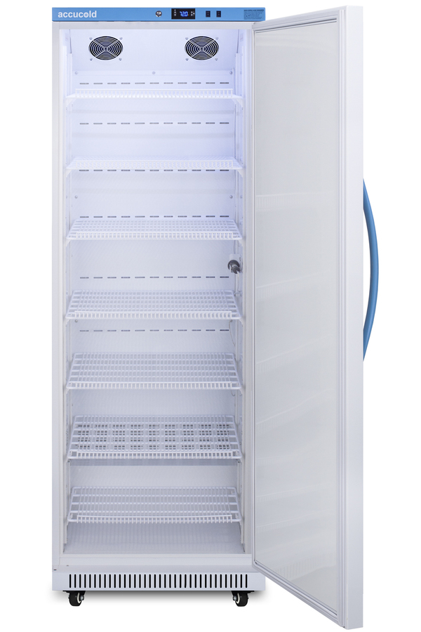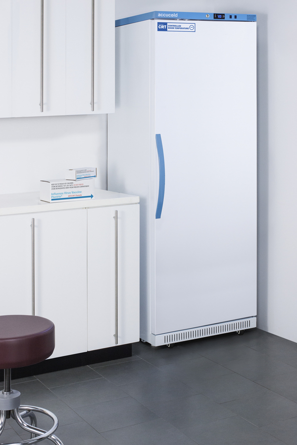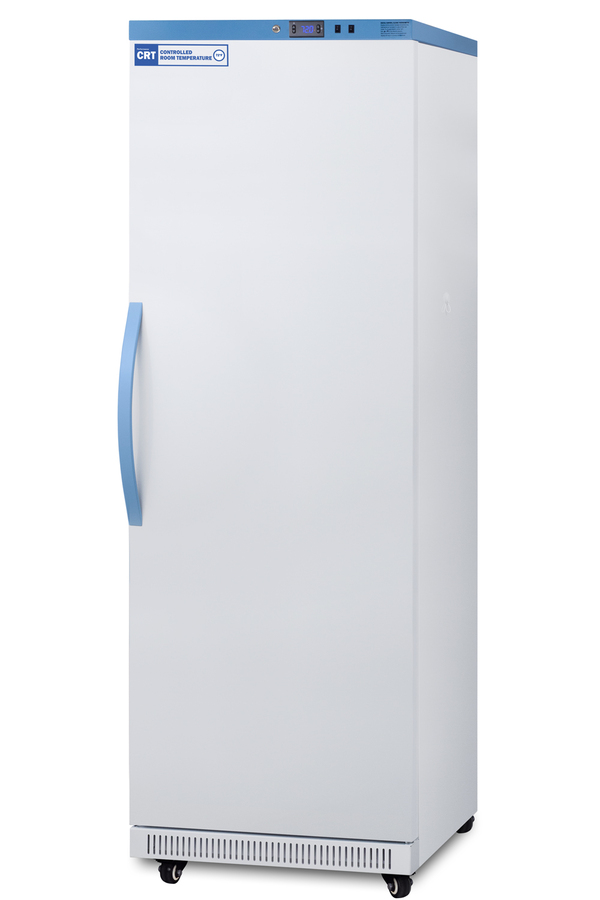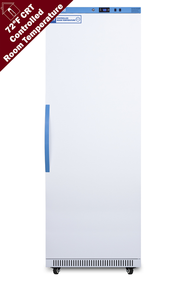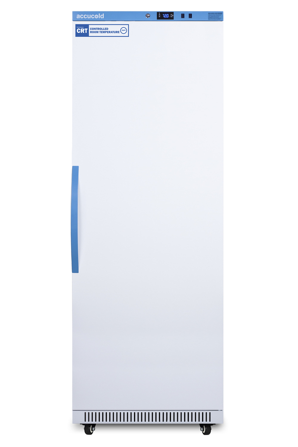 Accucold's Performance Series Controlled Room Temperature Cabinets offer purpose-built storage solutions for medication requiring a stable room temperature environment. The ARS18PV-CRT is an upright 18 cuf.ft. unit pre-set to 72ºF, with an adjustable range from 68º to 77ºF. The microprocessor temperature controller is externally located to minimize door openings, helping to protect stored contents from ambient temperature. The buffered temperature probe is encased in a glycol-filled bottle to better simulate temperature of the stored product, with an additional sensor that reads air temperature to ensure superior temperature control. The current and min/max temperature display is viewable in Celsius or Fahrenheit to the nearest tenth of a degree. The audible and visual temperature alarm sounds if the unit's interior goes out of range. Additional alarms include a power failure alert, door open alarm, and sensor failure alarm. This unit is equipped with remote alarm contacts in the rear and a 1/2" probe port on the right side to accept additional monitoring devices. A hospital grade cord with 'green dot' plug is also included for added safety in high traffic areas. Inside, the ARS18PV-CRT utilizes adjustable cycle defrost operation to avoid temperature spikes. Optimized forced air cooling with one internal fan ensures excellent temperature stability and uniformity with rapid recovery after door openings. The adjustable plastic-coated wire shelves can be positioned at 1/2" increments to accommodate virtually any sized item. We include seven shelves, more than competitor products providing to maximize interior shelving storage area. This unit includes LED internal lighting with an on/off rocker switch. The interior is constructed from white powder coated metal to ensure added durability and better temperature retention. The ARS18PV-CRT comes in a white cabinet finish with a blue accented control panel. The factory-installed antimicrobial handle is powder-coated with naturally occurring silver ions, which help to reduce the spread of germs, allowing for a safer, cleaner user experience. The user-reversible door ships with a right hand swing and self-closing function. This model includes a factory-installed lock and ships with two keys for staff use. Powerful magnetic gaskets ensure a positive seal. Four pre-installed 3" high casters with brakes make it easier to move as needed. Designed with hydrocarbon refrigerant, the ARG18PV-CRT provides an energy efficient solution to stabilized room temperature storage, even when ambient temperatures can reach temperatures as cold as 68ºF or warm as 86ºF. This unit is Pyxis, Omnicell, and AcuDose RX compatible. Additional sizes, as well as glass door options, are also available.