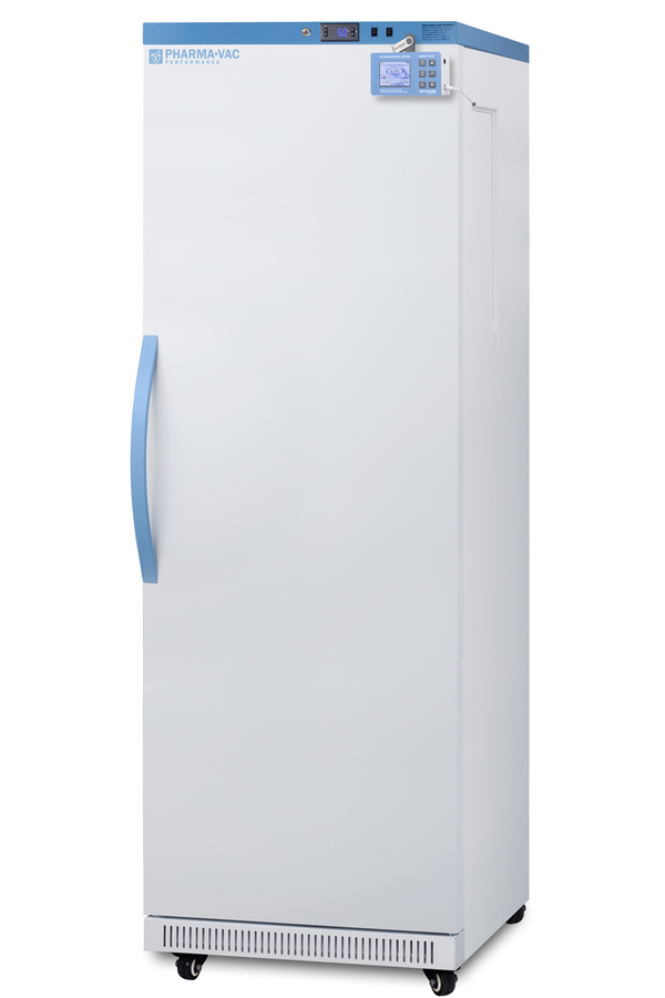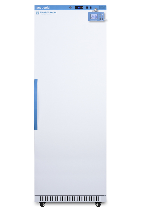 Accucold's Pharma-Vac Performance Series are upright all-refrigerators designed and purpose-built for pharmacy, medication, and vaccine applications to support meeting CDC/VFC/VFA guidelines, with a powder-coated silver ion handle that helps prevent germ spread. The ARS18PVDL2B is a 18 cu.ft. all-refrigerator with an adjustable control range from +2 to +8ºC. The microprocessor temperature controller is externally located to minimize door openings, helping to protect stored contents from ambient temperature. The buffered temperature probe is encased in a glycol-filled bottle to better simulate temperature of the stored product, with an additional sensor that reads air temperature to ensure superior temperature control. The current and min/max temperature display is viewable in Celsius or Fahrenheit to the nearest tenth of a degree. The audible and visual temperature alarm sounds if the unit's interior goes out of range. Additional alarms include a power failure alert, door open alarm, and sensor failure alarm. This unit is equipped with remote alarm contacts in the rear and a 1/2" probe port on the right side to accept additional monitoring devices. A hospital grade cord with 'green dot' plug is also included for added safety in high traffic areas. We also include our DL2B digital data logger to be mounted to the door, a feature recommended by the CDC, VFC and VFA for vaccine storage. This password-protected DDL is NIST calibrated in our ISO/IEC 17025:2017 accredited laboratory and offers a large LCD display of the current and high/low temperature, recording up to 32,000 data groups to its internal memory or even more on the included 4GB USB flash drive. Data can be viewed through a PC or Mac in Microsoft Excel or any .CSV compatible program. Users can set their own recording intervals starting at increments of 10 seconds to best meet a facility's specific logging needs. We include a 2-year certificate of calibration beginning the date of manufacture. The logger can be re-calibrated in our laboratories after the certificate expires. (For additional information on the DDL, see the DL2BKit listing on our website.) Inside, the ARS18PVDL2B utilizes adjustable cycle defrost operation to avoid temperature spikes. Optimized forced air cooling with one internal fan ensures excellent temperature stability and uniformity with rapid recovery after door openings. The adjustable plastic-coated wire shelves can be positioned at 1/2" increments to accommodate virtually any sized item. We include seven shelves, more than competitor products providing to maximize interior shelving storage area. This unit includes LED internal lighting with an on/off rocker switch. The interior is constructed from white powder coated metal to ensure added durability and better temperature retention. The ARS18PVDL2B comes in a white exterior finish with a blue accented control panel. The factory-installed antimicrobial handle is powder-coated with naturally occurring silver ions, which help to reduce the spread of germs, allowing for a safer, cleaner user experience. This model includes a factory-installed lock and ships with two keys for staff use. Powerful magnetic gaskets ensure a positive seal. Four pre-installed 3" high casters with brakes make it easier to move as needed. Designed with hydrocarbon refrigerant, the ARS18PVDL2B provides an energy efficient solution to vaccine storage. This unit is Pyxis, Omnicell, and AcuDose RX compatible. Additional sizes, as well as glass door options, are also available. Explore the full Pharma-Vac series at accucold.com/pharmavac. Note: The DL2B data logger adds 1 1/2" to the depth of the upper right hand corner of the door (not included in the listed specifications on this page). NOTE: Accucold refrigerators are purpose-built to the support meeting the current CDC (Centers for Disease Control) guidelines for the storage of vaccines. Units that end in suffix "456" have been certified to the new NSF 456 standard. As referenced in the current Vaccine Storage and Handling Toolkit, these units incorporate microprocessor controls and forced air circulation for stable operation between 2 and 8ºC. For additional temperature assurance, the CDC recommends a calibrated digital data logger (DDL), which can be added with the factory-installed option DL2B or addition of the DL2BKit accessory.