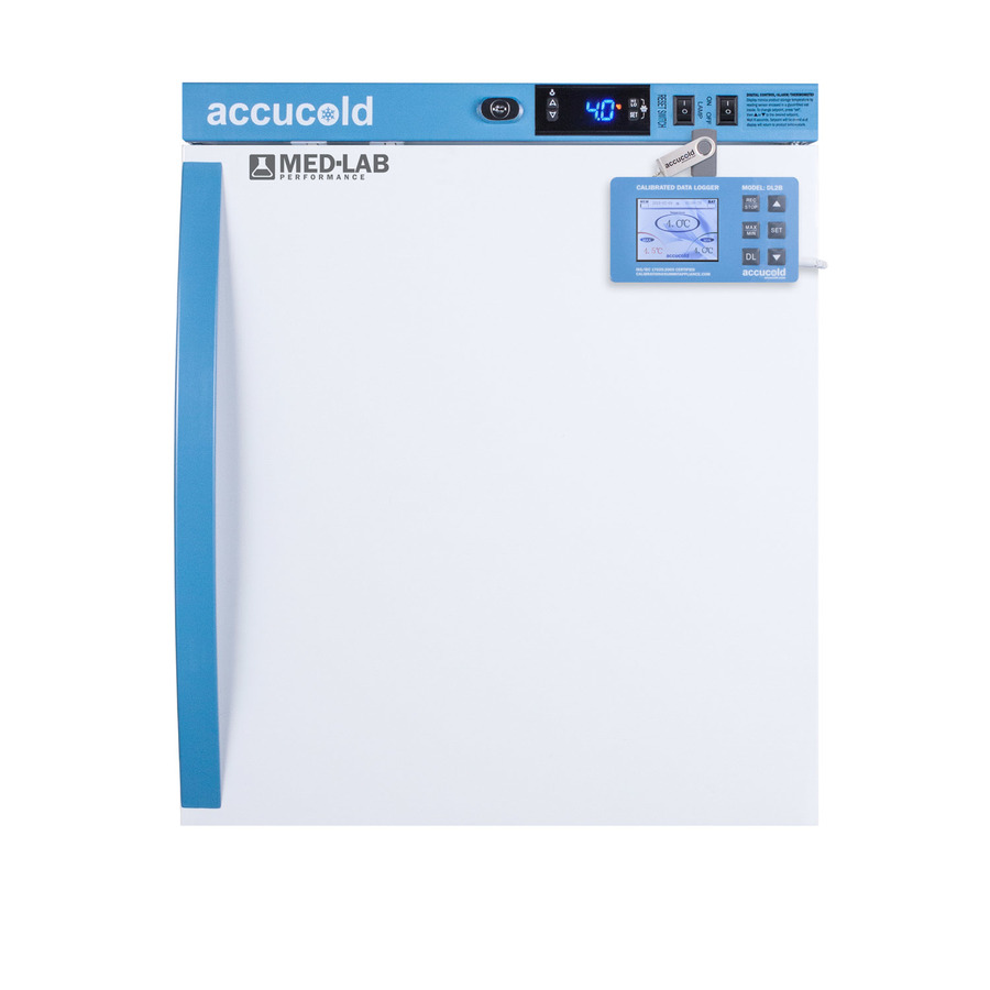 Accucold's Med-Lab Performance Series all-refrigerators are designed and purpose-built to meet the demanding needs of life science, laboratory, and medical cold storage applications. The ARS1MLDL2B is a 1 cu.ft. all-refrigerator with an adjustable control range from +2 to +10ºC. The microprocessor temperature controller is externally located to minimize door openings, helping to protect stored contents from ambient temperature. The buffered temperature probe is encased in a glycol-filled bottle to better simulate temperature of the stored product, with an additional sensor that reads air temperature to ensure superior temperature control. The current and min/max temperature display is viewable in Celsius or Fahrenheit to the nearest tenth of a degree. This refrigerator includes a high/low temperature alarm, as well as a power failure alert, door open alarm, and sensor failure alarm. This unit is equipped with remote alarm contacts in the rear and a 1/2" probe port, as well as a hospital grade cord with 'green dot' plug for added safety in high traffic areas. We also include our DL2B digital data logger to be mounted to the door, a feature recommended by the CDC, VFC and VFA for vaccine storage. This password-protected DDL is NIST calibrated in our ISO/IEC 17025:2017 accredited laboratory and offers a large LCD display of the current and high/low temperature, recording up to 32,000 data groups to its internal memory or even more on the included 4GB USB flash drive. Data can be viewed through a PC or Mac in Microsoft Excel or any .CSV compatible program. Users can set their own recording intervals starting at increments of 10 seconds to best meet a facility's specific logging needs. We include a 2-year certificate of calibration beginning the date of manufacture. The logger can be re-calibrated in our laboratories after the certificate expires. (For additional information on the DDL, see the DL2BKit listing on our website.) Inside, the ARS1MLDL2B utilizes adjustable cycle defrost operation to avoid temperature spikes. Optimized forced air cooling with an internal fan to ensures excellent temperature stability and uniformity with rapid recovery after door openings. The adjustable plastic-coated wire shelves can be positioned at 1/2" increments to accommodate virtually any sized item. This unit includes LED internal lighting with an on/off rocker switch. The interior is constructed from white powder coated metal to ensure added durability and better temperature retention. The ARS1MLDL2B comes in a white cabinet finish with a blue accented control panel. The factory-installed antimicrobial handle is powder-coated with naturally occurring silver ions, which help to reduce the spread of germs, allowing for a safer, cleaner user experience. The double pane tempered glass door provides a full view of the interior. This model includes a factory-installed lock and ships with two keys for staff use. Powerful magnetic gaskets ensure a positive seal. Designed with hydrocarbon refrigerant, the ARS1MLDL2B provides an energy efficient solution to vaccine storage. This unit is Pyxis, Omnicell, and AcuDose RX compatible. Additional sizes, as well as glass door options, are also available. Explore the full Med-Lab series at accucold.com/medlab. Note: The DL2B data logger adds 1 1/2" to the depth of the upper right hand corner of the door (not included in the listed specifications on this page). NOTE: Accucold refrigerators are purpose-built to the support meeting the current CDC (Centers for Disease Control) guidelines for the storage of vaccines. At this time, Accucold refrigerators have not been evaluated to the new NSF 456 standard. As referenced in the current Vaccine Storage and Handling Toolkit, these units incorporate microprocessor controls and forced air circulation for stable operation, as well as a calibrated digital data logger (DDL) to display the current and high/low temperature.