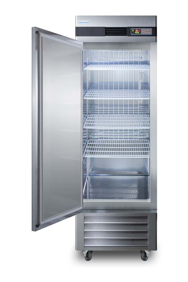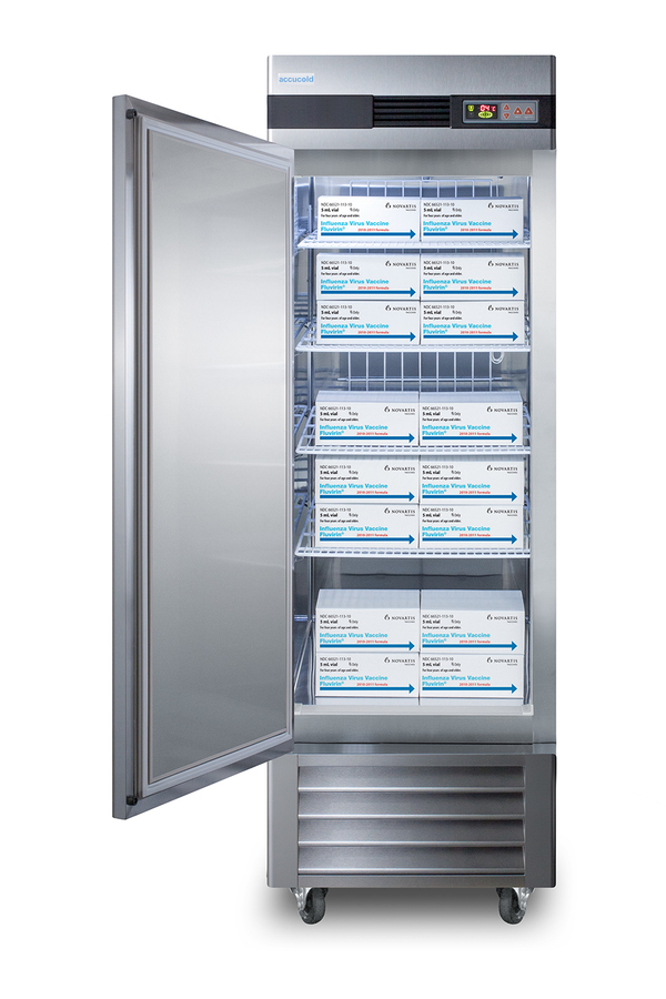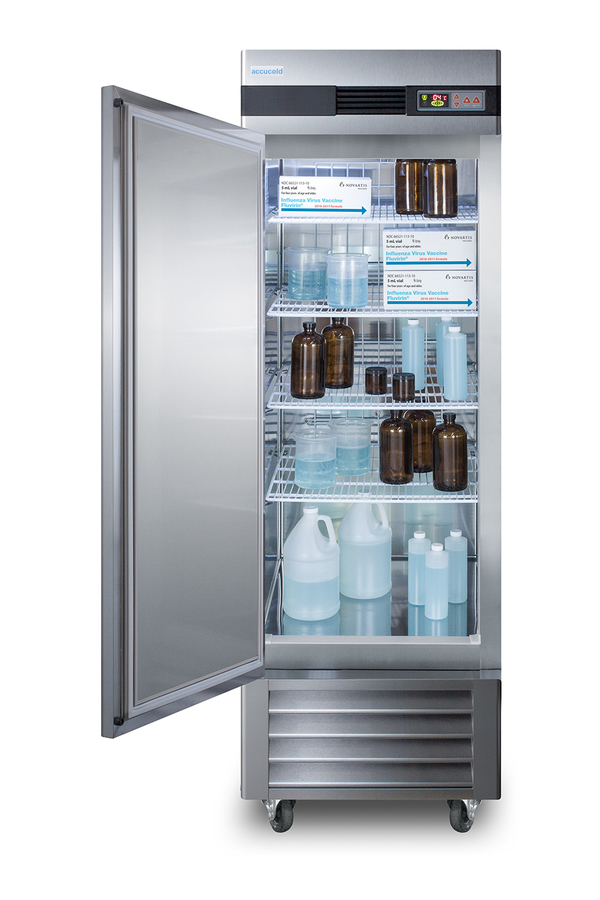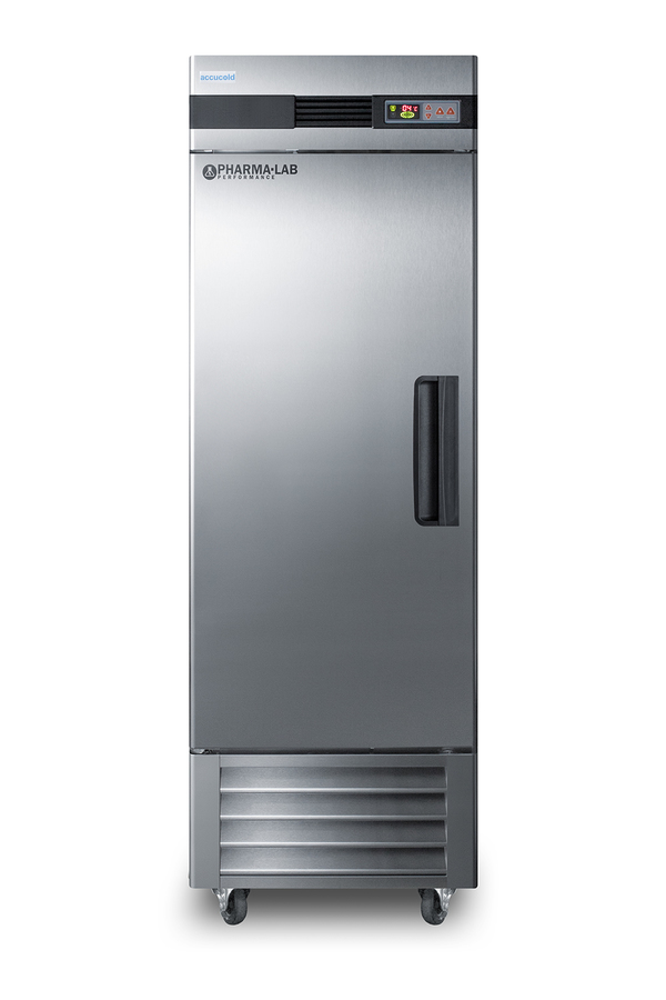 Accucold's Pharma-Lab Performance Series features reach-in refrigerators and matching freezers designed and purpose-built to meet the demanding needs for pharmacy, medication, vaccine, laboratory, and life science applications. The ARS23MLLH is a 23 cu.ft. all-refrigerator with an adjustable control range from +2 to +10ºC. The microprocessor temperature controller features a large digital LED display viewable in Celsius or Fahrenheit, making it easy for staff to manage and monitor the temperature. The unit is equipped with an air sensor for rapid control response and a product sensor for a more accurate reading of the interior, including a display of the min/max temperature in 15 minute increments The audible and visual temperature alarm sounds if the unit rises or falls above a user-set range. Additional alarms include a power failure alert, door open alarm, and a condenser cleaning reminder. Inside, the ARS23MLLH utilizes adjustable cycle defrost operation to avoid temperature spikes, with a top-mounted forced air cooling system to ensure rapid temperature recovery. Four vinyl-coated wire shelves on cantilevered clips allow you to accommodate virtually any sized item. The LED lighting displays automatically when the door is open, providing a full and energy efficient display. The ARS23MLLH features a durable stainless steel cabinet and interior, with a sealed back for easier cleanup. We include a set of casters (2 locking) for optional installation. A factory-installed lock offers added security, with two keys included for your facility. Magnetic door gaskets ensure a strong seal. The door is self-closing to help protect contents, but will remain open at 90º for easier loading. This unit has a left hand door swing. For the same model with the door opening from the other side, see the ARS23ML. Designed with hydrocarbon refrigerant, the ARS23MLLH provides an energy efficient solution to large capacity storage. This unit is Pyxis, Omnicell, and AcuDose RX compatible and meets NSF-7 commercial standards. For a matching frost-free freezer, see the ARF23ML. A glass door refrigerator version is also available (model ARG23ML). NOTE: Accucold refrigerators are purpose-built to the support meeting the current CDC (Centers for Disease Control) guidelines for the storage of vaccines. At this time, Accucold refrigerators have not been evaluated to the new NSF 456 standard. As referenced in the current Vaccine Storage and Handling Toolkit, these units incorporate microprocessor controls and forced air circulation for stable operation. For additional temperature assurance, the CDC recommends a calibrated digital data logger (DDL), which can be added with the factory-installed option DL2B or addition of the DL2BKit accessory.