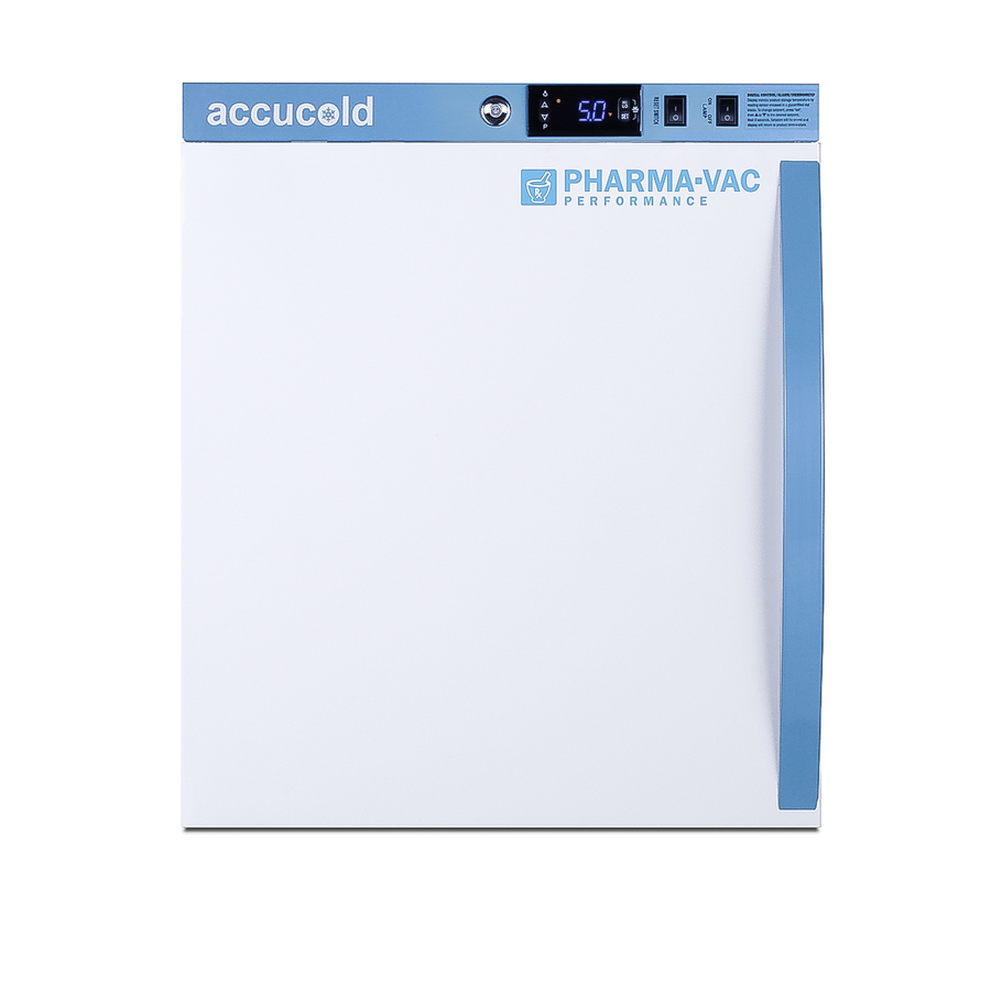 Accucold is proud to lead the industry with the largest line of cold storage product sizes certified to NSF/ANSI 456 Vaccine Storage Standard. The Pharma-Vac Performance Series supports meeting regulations and guidelines from the CDC, State Agencies, World Health Organization, and other Health Ministries on vaccine storage and handling. The ARS2PV456LHD is a 1.94 cu.ft. all-refrigerator with an adjustable control range from +2 to +8ºC. The microprocessor temperature controller is externally located to minimize door openings, helping to protect stored contents from ambient temperature. The buffered temperature probe is encased in a glycol-filled bottle to better simulate temperature of the stored product, with an additional sensor that reads air temperature to ensure superior temperature control. The current and min/max temperature display is viewable in Celsius or Fahrenheit to the nearest tenth of a degree. The audible and visual temperature alarm sounds if the unit's interior goes out of range. Additional alarms include a power failure alert, door open alarm, and sensor failure alarm. This unit is equipped with remote alarm contacts in the rear and a 1/2" probe port on the right side to accept additional monitoring devices. This unit comes with a hospital grade cord with a green dot plug for added safety in high traffic areas. Inside, the ARGSPV456LHD utilizes adjustable cycle defrost operation to avoid temperature spikes. Optimized forced air cooling with one internal fan ensures excellent temperature stability and uniformity with rapid recovery after door openings. The adjustable plastic-coated wire shelves can be positioned at 1/2" increments to accommodate virtually any sized item. This unit includes LED internal lighting with an on/off rocker switch. The interior is constructed from white powder coated metal to ensure added durability and better temperature retention. The ARS2PV456LHD comes in a white cabinet finish with a blue accented control panel. The factory-installed antimicrobial handle is powder-coated with naturally occurring silver ions, which help to reduce the spread of germs, allowing for a safer, cleaner user experience. The door ships with a left hand swing and self-closing function. This model includes a factory-installed lock and ships with two keys for staff use. Powerful magnetic gaskets ensure a positive seal. Designed with hydrocarbon refrigerant, this unit provides an energy efficient solution to vaccine storage. This unit is Pyxis, Omnicell, and AcuDose RX compatible. Additional sizes, as well as solid door options, are also available. Explore the full Pharma-Vac NSF 456 series at accucold.com/pharmavac. ABOUT NSF 456: NSF/ANSI 456 is a voluntary standard introduced in 2021 that was designed to establish the performance and construction requirements for vaccine refrigeration. Models certified to this standard undergo strict testing to confirm temperatury consistency. All Accucold units approved to NSF 456 for vaccine storage are certified by an independent testing agency.