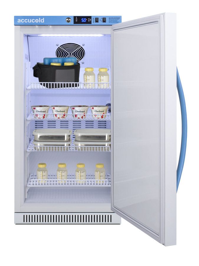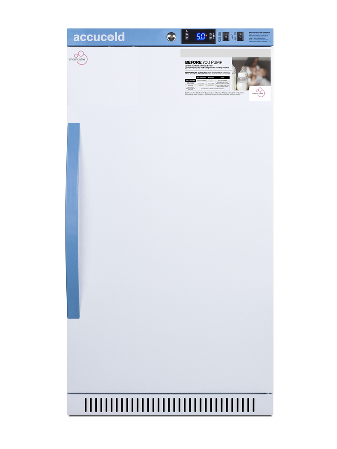 Accucold's MOMCUBE® upright all-refrigerators are designed and purpose-built for breast milk storage. All MOMCUBE® units are laboratory-tested to maintain temperature between 33-40°F, as recommended by the CDC and ideal for maternity wards, hospitals, NICUs, employee wellness rooms complying with Section 4207 of the Patient Protection and Affordable Care Act, and other facilities. The ARS32MLMCBIADA is a 2.83 cu.ft. all-refrigerator. Sized at 32" high to fit under lower counters complying with ADA guidelines for accessibility. It is designed for freestanding or recessed installation. The microprocessor temperature controller is externally located to minimize door openings, helping to protect stored contents from ambient temperature. The buffered temperature probe is encased in a glycol-filled bottle to better simulate temperature of the stored product, with an additional sensor that reads air temperature to ensure superior temperature control. The current and min/max temperature display is viewable in Celsius or Fahrenheit to the nearest tenth of a degree. The audible and visual temperature alarm sounds if the unit's interior goes out of range. Additional alarms include a power failure alert, door open alarm, and sensor failure alarm. This model is equipped with remote alarm contacts in the rear and a 1/2" probe port on the right side to accept additional monitoring devices. A hospital grade cord with 'green dot' plug is also included for added safety in high traffic areas. Inside, the ARS32MLMCBIADA utilizes adjustable cycle defrost operation to avoid temperature spikes. Optimized forced air cooling with an internal fan to ensure excellent temperature stability and uniformity with rapid recovery after door openings. The adjustable plastic-coated wire shelves can be positioned at 1/2" increments to accommodate virtually any sized item. This unit includes LED internal lighting with an on/off rocker switch. The interior is constructed from white powder coated metal to ensure added durability and better temperature retention. The ARS32MLMCBIADA comes in a white cabinet finish with a blue accented control panel. The factory-installed antimicrobial handle is powder-coated with naturally occurring silver ions, which help to reduce the spread of germs, allowing for a safer, cleaner user experience. The user-reversible door ships with a right hand swing and self-closing function, while a factory-installed lock provides security as needed, with two keys for staff use. Powerful magnetic gaskets ensure a positive seal. The MOMCUBE® is an eco-friendly solution to breast milk storage. Units of various capacity, heights, and interiors are available. Explore the entire MOMCUBE® Series on our website or contact our sales team at 718-893-3900 ext. 509 for more options.