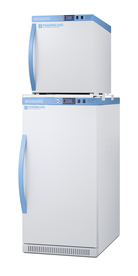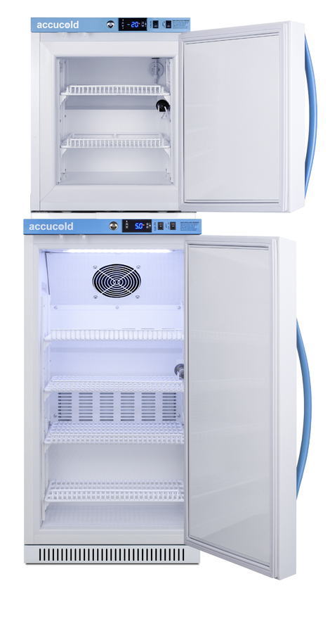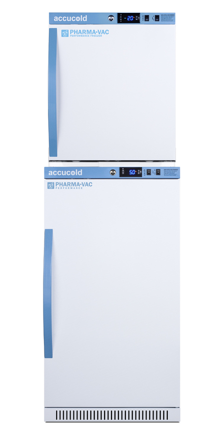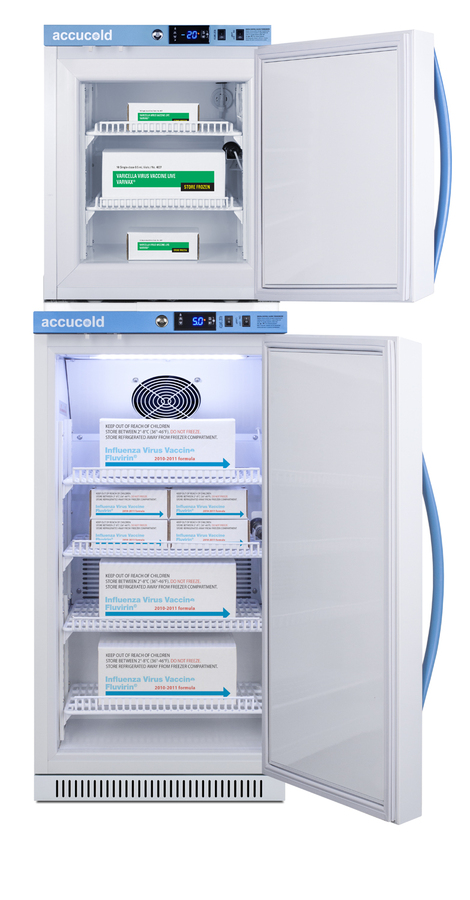 Accucold offers innovative solutions to vaccine storage with our Performance Series stackable purpose-built refrigerator-freezer combinations designed to support meeting CDC/VFC/VFA guidelines. Sized just under 20" wide, the ARS32PVBIADA-AFZ1PVSTACK combines the 2.83 cu.ft. ARS32PVBIADA auto defrost all-refrigerator with the 1.4 cu.ft. AFZ1PV all-freezer into one slim footprint using Accucold's StackRack. This ships in three boxes and requires some minor assembly upon delivery. The Pharma-Vac Performance Series is designed to meet the demanding needs of vaccine storage. Both units utilize a microprocessor temperature controller (refrigerator range: +2 to +8ºC; freezer range: -30 to -10ºC). The buffered temperature probe is encased in a glycol-filled bottle to better simulate temperature of the stored product, with an additional sensor that reads air temperature to ensure superior temperature control. The current and min/max temperature display is viewable in Celsius or Fahrenheit to the nearest tenth of a degree. The audible and visual temperature alarms sound if the units' interiors go out of range. Additional alarms include a power failure alert, door open alarm, and sensor failure alarm. Both units are equipped with remote alarm contacts in the rear and a 1/2" probe port on the right side to accept additional monitoring devices. The factory-installed antimicrobial handles are powder-coated with naturally occurring silver ions, which help to reduce the spread of germs, allowing for a safer, cleaner user experience. A hospital grade cord with 'green dot' plug is also included for added safety in high traffic areas. Inside, the ARS32PVIBADA refrigerator utilizes adjustable cycle defrost operation to avoid temperature spikes. Optimized forced air cooling with an internal fan ensures excellent temperature stability and uniformity with rapid recovery after door openings. The adjustable plastic-coated wire shelves can be positioned at 1/2" increments to accommodate virtually any sized item. This unit includes LED internal lighting with an on/off rocker switch. The interior is constructed from white powder coated metal to ensure added durability and better temperature retention. Freezer model AFZ1PV can be installed on top of the refrigerator with our stacking rack. This freezer utilizes static manual defrost operation. It comes with two adjustable shelves. Both units include front-mounted keyed locks and powerful magnetic gaskets to ensure a positive seal, with self-closing doors for added protection in high traffic settings. Additional stacked combinations are available. Browse Accucold's website for more information, or contact our sales team at 718-893-3900 to discuss your equipment needs. NOTE: Accucold refrigerators are purpose-built to the support meeting the current CDC (Centers for Disease Control) guidelines for the storage of vaccines. As referenced in the current Vaccine Storage and Handling Toolkit, these units incorporate microprocessor controls and forced air circulation for stable operation between 2 and 8ºC. For additional temperature assurance, the CDC recommends a calibrated digital data logger (DDL), which can be added with the factory-installed option DL2B or addition of the DL2BKit accessory.