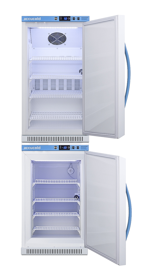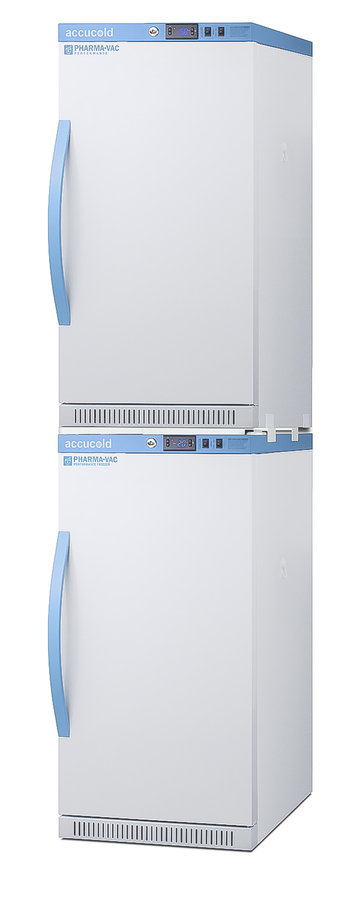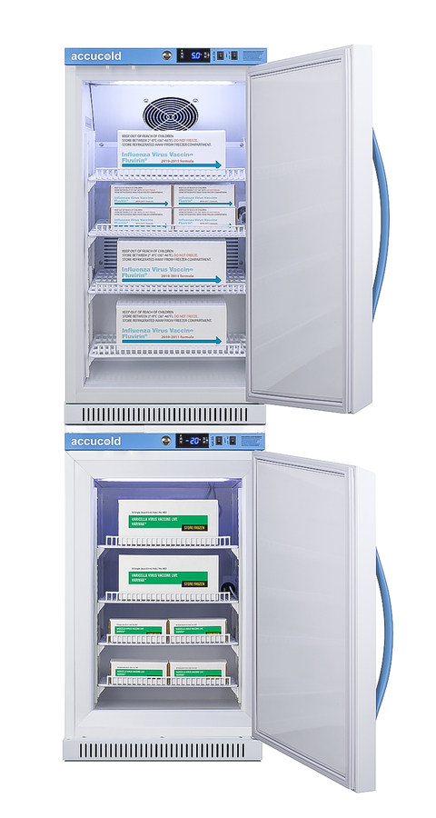 Accucold offers innovative solutions to vaccine storage with our Performance Series stackable purpose-built refrigerator-freezer combinations designed to support meeting CDC/VFC/VFA guidelines. Sized just under 20" wide, the ARS32PVBIADA-AFZ2PVBIADASTACK combines the 2.83 cu.ft. ARS32PVBIADA auto defrost all-refrigerator with AFZ2PVBIADA all-freezer into one slim footprint using Accucold's StackRack. This ships in three boxes and requires some minor assembly upon delivery. The Pharma-Vac Performance Series is designed to meet the demanding needs of vaccine storage. Both units utilize a microprocessor temperature controller (refrigerator range: +2 to +8ºC; freezer range: -30 to -10ºC). The buffered temperature probe is encased in a glycol-filled bottle to better simulate temperature of the stored product, with an additional sensor that reads air temperature to ensure superior temperature control. The current and min/max temperature display is viewable in Celsius or Fahrenheit to the nearest tenth of a degree. The audible and visual temperature alarms sound if the units' interiors go out of range. Additional alarms include a power failure alert, door open alarm, and sensor failure alarm. Both units are equipped with remote alarm contacts in the rear and a 1/2" probe port on the right side to accept additional monitoring devices. The factory-installed antimicrobial handles are powder-coated with naturally occurring silver ions, which help to reduce the spread of germs, allowing for a safer, cleaner user experience. A hospital grade cord with 'green dot' plug is also included for added safety in high traffic areas. Inside, the ARS32PVBIADA refrigerator utilizes adjustable cycle defrost operation to avoid temperature spikes. Optimized forced air cooling with an internal fan ensures excellent temperature stability and uniformity with rapid recovery after door openings. The adjustable plastic-coated wire shelves can be positioned at 1/2" increments to accommodate virtually any sized item. This unit includes LED internal lighting with an on/off rocker switch. The interior is constructed from white powder coated metal to ensure added durability and better temperature retention. The refrigerator is designed to be stacked on top of the AFZ2PVBIADA, our Performance Series 2.47 cu.ft. all-freezer that utilizes static manual defrost operation. The freezer includes four adjustable plastic-coated wire shelves for flexible storage. Both units include front-mounted keyed locks and powerful magnetic gaskets to ensure a positive seal, with self-closing doors for added protection in high traffic settings. Additional stacked combinations are available. Browse Accucold's website for more information, or contact our sales team at 718-893-3900 to discuss your equipment needs. NOTE: Accucold refrigerators are purpose-built to the support meeting the current CDC (Centers for Disease Control) guidelines for the storage of vaccines. As referenced in the current Vaccine Storage and Handling Toolkit, these units incorporate microprocessor controls and forced air circulation for stable operation between 2 and 8ºC. For additional temperature assurance, the CDC recommends a calibrated digital data logger (DDL), which can be added with the factory-installed option DL2B or addition of the DL2BKit accessory.