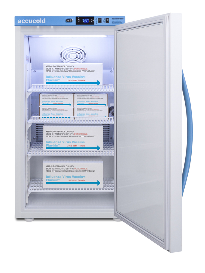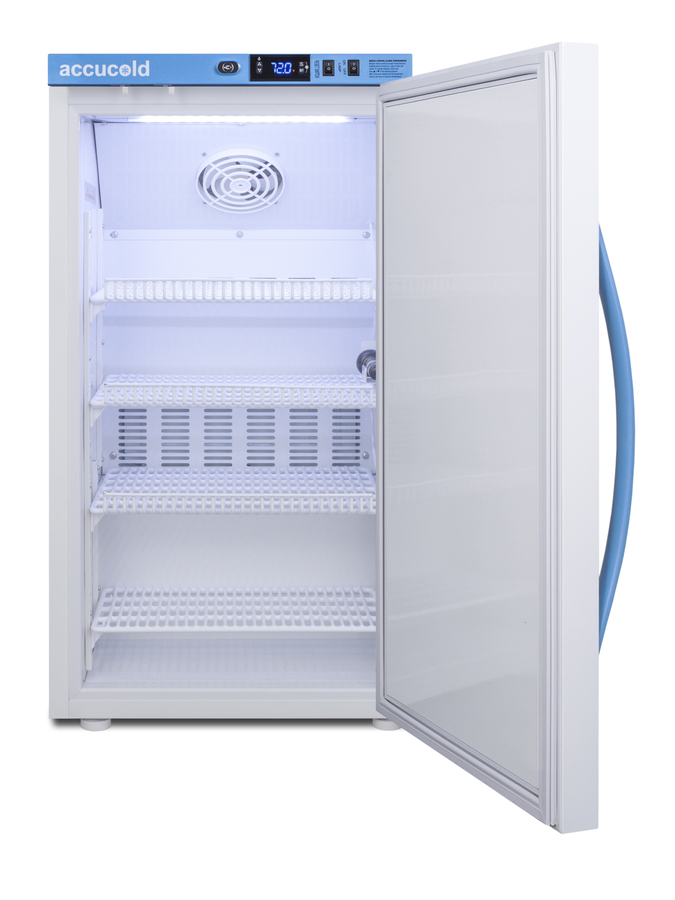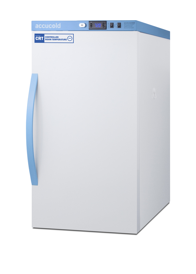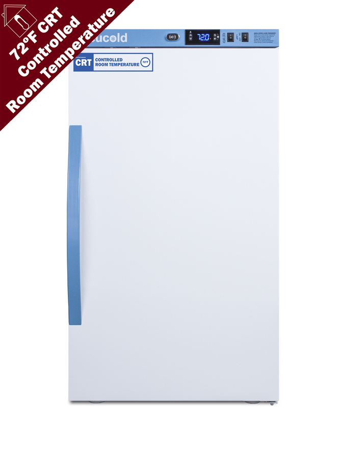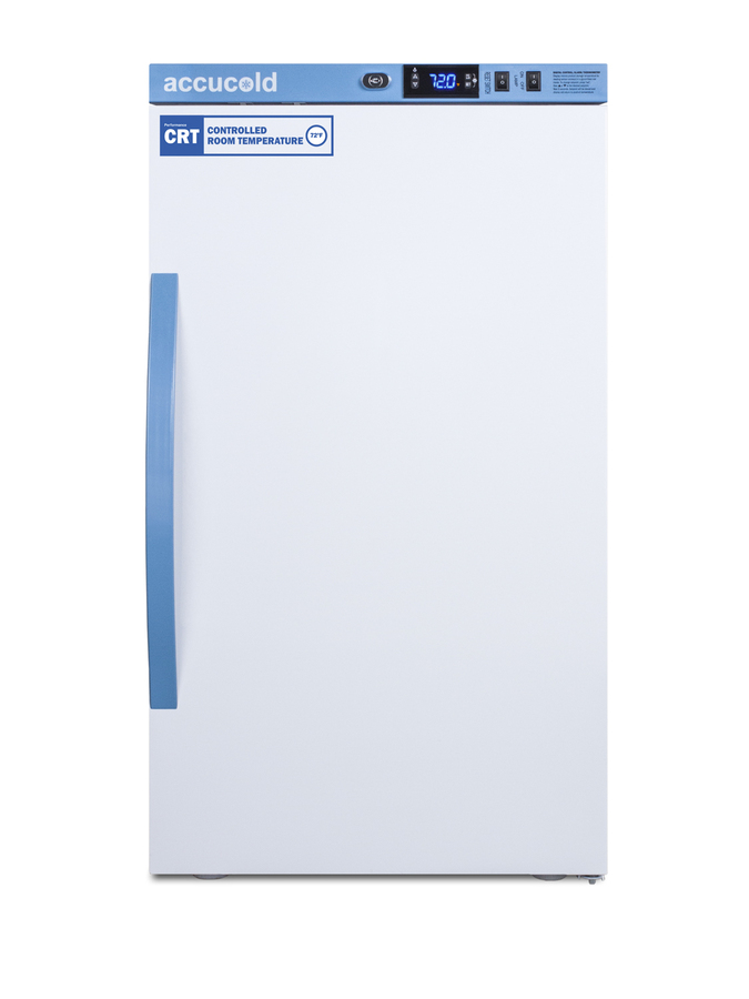 Accucold's Performance Series Controlled Room Temperature Cabinets offer purpose-built storage solutions for medication requiring a stable room temperature environment. The ARS3PV-CRT is a 3 cu.ft. upright unit pre-set to 72ºF, with an adjustable range from 68º to 77ºF. The microprocessor temperature controller is externally located to minimize door openings, helping to protect stored contents from ambient temperature. The buffered temperature probe is encased in a glycol-filled bottle to better simulate temperature of the stored product, with an additional sensor that reads air temperature to ensure superior temperature control. The current and min/max temperature display is viewable in Celsius or Fahrenheit to the nearest tenth of a degree. The audible and visual temperature alarm sounds if the unit's interior goes out of range. Additional alarms include a power failure alert, door open alarm, and sensor failure alarm. This unit is equipped with remote alarm contacts in the rear and a 1/2" probe port on the right side to accept additional monitoring devices. A hospital grade cord with 'green dot' plug is also included for added safety in high traffic areas. Inside, the ARS3PV-CRT utilizes adjustable cycle defrost operation to avoid temperature spikes. Optimized forced air cooling with an internal fan to ensure excellent temperature stability and uniformity with rapid recovery after door openings. The adjustable plastic-coated wire shelves can be positioned at 1/2" increments to accommodate virtually any sized item. This unit includes LED internal lighting with an on/off rocker switch. The interior is constructed from white powder coated metal to ensure added durability and better temperature retention. The ARS3PV-CRT comes in a white cabinet finish with a blue accented control panel. The factory-installed antimicrobial handle is powder-coated with naturally occurring silver ions, which help to reduce the spread of germs, allowing for a safer, cleaner user experience. The user-reversible door ships with a right hand swing and self-closing function. This model includes a factory-installed lock and ships with two keys for staff use. Powerful magnetic gaskets ensure a positive seal. Designed with hydrocarbon refrigerant, the ARS3PV-CRT provides an energy efficient solution to stabilized room temperature storage, even when ambient temperatures can reach temperatures as cold as 68ºF or warm as 86ºF. This unit is Pyxis, Omnicell, and AcuDose RX compatible. Additional sizes, as well as glass door options, are also available.