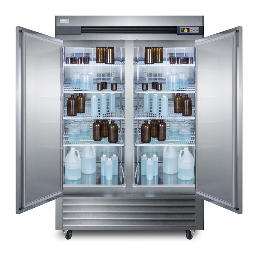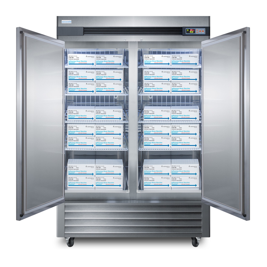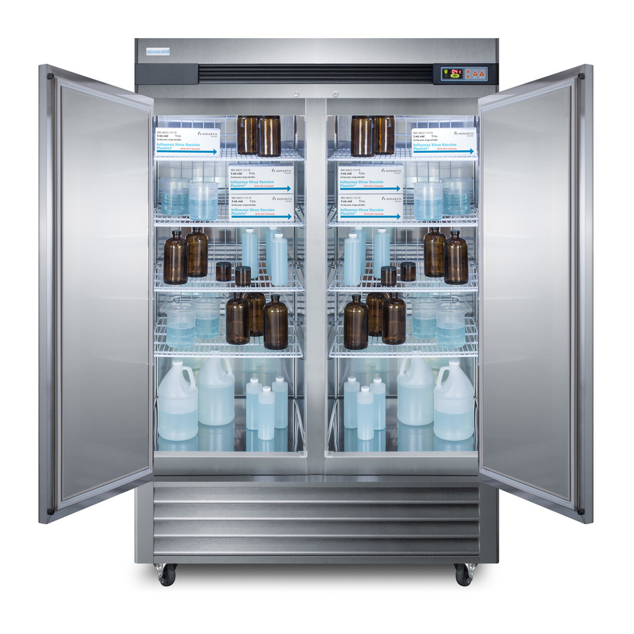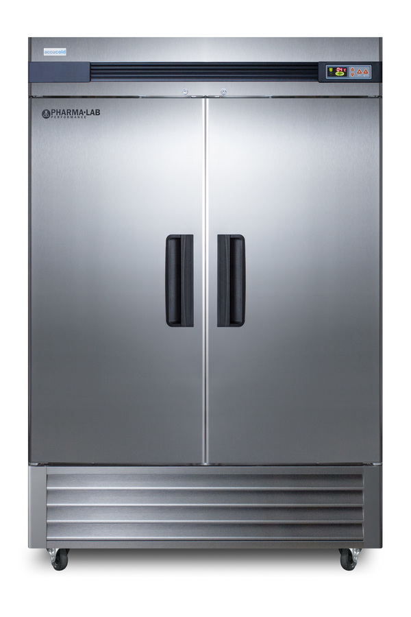 Accucold's Pharma-Lab Performance Series features reach-in refrigerators and matching freezers designed and purpose-built to meet the demanding needs for pharmacy, medication, vaccine, laboratory, and life science applications. The ARS49ML is a 49 cu.ft. two-door single section all-refrigerator with an adjustable control range from +2 to +10ºC. The microprocessor temperature controller features a large digital LED display viewable in Celsius or Fahrenheit, making it easy for staff to manage and monitor the temperature. The unit is equipped with an air sensor for rapid control response and a product sensor for a more accurate reading of the interior, including a display of the min/max temperature in 15 minute increments The audible and visual temperature alarm sounds if the unit rises or falls above a user-set range. Additional alarms include a power failure alert, door open alarm, and a condenser cleaning reminder. Inside, the ARS49ML utilizes adjustable cycle defrost operation to avoid temperature spikes, with a top-mounted forced air cooling system to ensure rapid temperature recovery. Eight vinyl-coated wire shelves on cantilevered clips allow you to accommodate virtually any sized item. The LED lighting displays automatically when the door is open, providing a full and energy efficient display. The ARS49ML features a durable stainless steel cabinet and interior, with a sealed back for easier cleanup. We include a set of casters (2 locking) for optional installation. A factory-installed lock offers added security, with two keys included for your facility. Magnetic door gaskets ensure a strong seal. The two doors are self-closing to help protect contents, but will remain open at 90º for easier loading. Designed with hydrocarbon refrigerant, the ARS49ML provides an energy efficient solution to large capacity storage. This unit is Pyxis, Omnicell, and AcuDose RX compatible and meets NSF-7 commercial standards. For a matching frost-free freezer, see the ARF49ML. A glass door refrigerator version is also available (model ARG49ML). NOTE: Accucold refrigerators are purpose-built to the support meeting the current CDC (Centers for Disease Control) guidelines for the storage of vaccines. At this time, Accucold refrigerators have not been evaluated to the new NSF 456 standard. As referenced in the current Vaccine Storage and Handling Toolkit, these units incorporate microprocessor controls and forced air circulation for stable operation. For additional temperature assurance, the CDC recommends a calibrated digital data logger (DDL), which can be added with the factory-installed option DL2B or addition of the DL2BKit accessory.