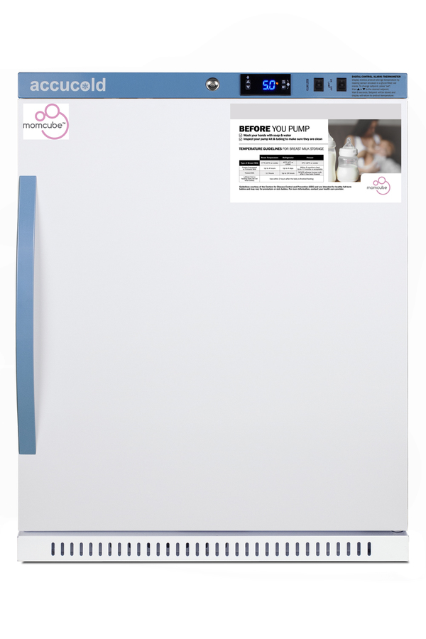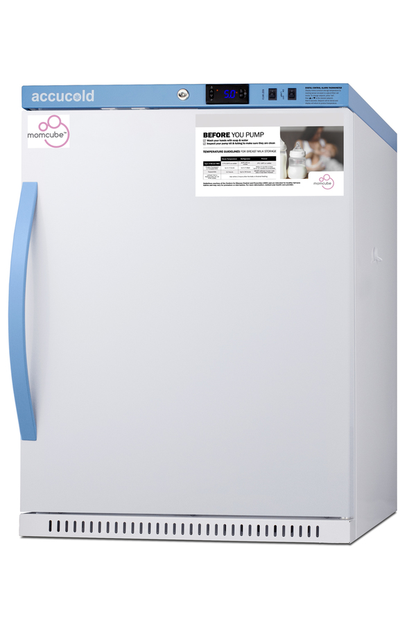 Accucold's MOMCUBE® upright all-refrigerators are designed and purpose-built for breast milk storage. All MOMCUBE® units are laboratory-tested to maintain temperature between 33-40°F, as recommended by the CDC and ideal for maternity wards, hospitals, NICUs, employee wellness rooms complying with Section 4207 of the Patient Protection and Affordable Care Act, and other facilities. The ARS62MLMCBIADA is a 6 cu.ft. all-refrigerator. Sized at just under 32" high to fit under lower counters complying with ADA guidelines for accessibility. It is designed for freestanding or recessed installation. The microprocessor temperature controller is externally located to minimize door openings, helping to protect stored contents from ambient temperature. The buffered temperature probe is encased in a glycol-filled bottle to better simulate temperature of the stored product, with an additional sensor that reads air temperature to ensure superior temperature control. The current and min/max temperature display is viewable in Celsius or Fahrenheit to the nearest tenth of a degree. The audible and visual temperature alarm sounds if the unit's interior goes out of range. Additional alarms include a power failure alert, door open alarm, and sensor failure alarm. This model is equipped with remote alarm contacts in the rear and a 1/2" probe port on the right side to accept additional monitoring devices. A hospital grade cord with 'green dot' plug is also included for added safety in high traffic areas. Inside, the ARS62MLMCBIADA utilizes adjustable cycle defrost operation to avoid temperature spikes. Optimized forced air cooling with an internal fan to ensure excellent temperature stability and uniformity with rapid recovery after door openings. The adjustable plastic-coated wire shelves can be positioned at 1/2" increments to accommodate virtually any sized item. This unit includes LED internal lighting with an on/off rocker switch. The interior is constructed from white powder coated metal to ensure added durability and better temperature retention. The ARS62MLMCBIADA comes in a white cabinet finish with a blue accented control panel. The factory-installed antimicrobial handle is powder-coated with naturally occurring silver ions, which help to reduce the spread of germs, allowing for a safer, cleaner user experience. The user-reversible door ships with a right hand swing and self-closing function, while a factory-installed lock provides security as needed, with two keys for staff use. Powerful magnetic gaskets ensure a positive seal. The MOMCUBE® is an eco-friendly solution to breast milk storage. Units of various capacity, heights, and interiors are available. Explore the entire MOMCUBE® Series on our website or contact our sales team at 718-893-3900 ext. 509 for more options.