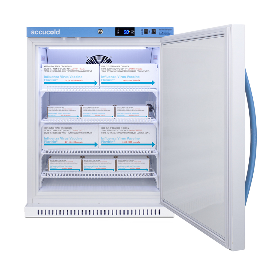 Accucold's Pharma-Vac Performance Series are upright all-refrigerators designed and purpose-built for pharmacy, medication, and vaccine applications to support meeting CDC/VFC/VFA guidelines. The ARS62PVBIADA is a 6 cu.ft. all-refrigerator with a temperature range of +2°C to +8°C. Sized at just under 32" high to fit under lower counters complying with ADA guidelines for accessibility. It is designed for freestanding or recessed installation. The microprocessor temperature controller is externally located to minimize door openings, helping to protect stored contents from ambient temperature. The buffered temperature probe is encased in a glycol-filled bottle to better simulate temperature of the stored product, with an additional sensor that reads air temperature to ensure superior temperature control. The current and min/max temperature display is viewable in Celsius or Fahrenheit to the nearest tenth of a degree. The audible and visual temperature alarm sounds if the unit's interior goes out of range. Additional alarms include a power failure alert, door open alarm, and sensor failure alarm. This model is equipped with remote alarm contacts in the rear and a 1/2" probe port on the right side to accept additional monitoring devices. A hospital grade cord with 'green dot' plug is also included for added safety in high traffic areas. Inside, the ARS62PVBIADA utilizes adjustable cycle defrost operation to avoid temperature spikes. Optimized forced air cooling with an internal fan to ensure excellent temperature stability and uniformity with rapid recovery after door openings. The adjustable plastic-coated wire shelves can be positioned at 1/2" increments to accommodate virtually any sized item. This unit includes LED internal lighting with an on/off rocker switch. The interior is constructed from white powder coated metal to ensure added durability and better temperature retention. The ARS62PVBIADA comes in a white cabinet finish with a blue accented control panel. The factory-installed antimicrobial handle is powder-coated with naturally occurring silver ions, which help to reduce the spread of germs, allowing for a safer, cleaner user experience. The user-reversible door ships with a right hand swing and self-closing function, while a factory-installed lock provides security as needed, with two keys for staff use. Powerful magnetic gaskets ensure a positive seal. Designed with hydrocarbon refrigerant, the ARS62PVBIADA provides an energy efficient solution to vaccine storage. This unit is Pyxis, Omnicell, and AcuDose RX compatible. Additional sizes, as well as solid door options, are also available. Explore the full Pharma-Vac series at accucold.com/pharmavac. NOTE: Accucold refrigerators are purpose-built to the support meeting the current CDC (Centers for Disease Control) guidelines for the storage of vaccines. Units that end in suffix "456" have been certified to the new NSF 456 standard. As referenced in the current Vaccine Storage and Handling Toolkit, these units incorporate microprocessor controls and forced air circulation for stable operation between 2 and 8ºC. For additional temperature assurance, the CDC recommends a calibrated digital data logger (DDL), which can be added with the factory-installed option DL2B or addition of the DL2BKit accessory.