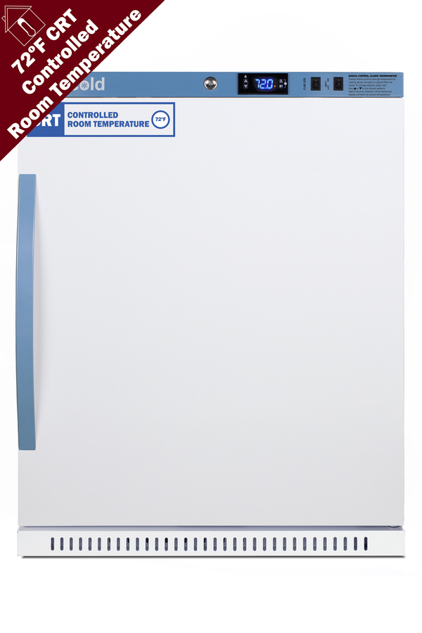 Accucold's Performance Series Controlled Room Temperature Cabinets offer purpose-built storage solutions for medication requiring a stable room temperature environment. The ARS62PVBIADA-CRT is a 6 cu.ft. upright unit pre-set to 72ºF, with an adjustable range from 68º to 77ºF, sized just under 32" high to fit under lower counters complying with ADA guidelines for accessibility. The microprocessor temperature controller is externally located to minimize door openings, helping to protect stored contents from ambient temperature. The buffered temperature probe is encased in a glycol-filled bottle to better simulate temperature of the stored product, with an additional sensor that reads air temperature to ensure superior temperature control. The current and min/max temperature display is viewable in Celsius or Fahrenheit to the nearest tenth of a degree. The audible and visual temperature alarm sounds if the unit's interior goes out of range. Additional alarms include a power failure alert, door open alarm, and sensor failure alarm. This unit is equipped with remote alarm contacts in the rear and a 1/2" probe port on the right side to accept additional monitoring devices. A hospital grade cord with 'green dot' plug is also included for added safety in high traffic areas. Inside, the ARS62PVBIADA-CRT utilizes adjustable cycle defrost operation to avoid temperature spikes. Optimized forced air cooling with an internal fan to ensure excellent temperature stability and uniformity with rapid recovery after door openings. The adjustable plastic-coated wire shelves can be positioned at 1/2" increments to accommodate virtually any sized item. This unit includes LED internal lighting with an on/off rocker switch. The interior is constructed from white powder coated metal to ensure added durability and better temperature retention. The ARS62PVBIADA-CRT comes in a white cabinet finish with a blue accented control panel. The factory-installed antimicrobial handle is powder-coated with naturally occurring silver ions, which help to reduce the spread of germs, allowing for a safer, cleaner user experience. The double pane tempered glass door provides a full view of the interior. The user-reversible door ships with a right hand swing and self-closing function. This model includes a factory-installed lock and ships with two keys for staff use. Powerful magnetic gaskets ensure a positive seal. Designed with hydrocarbon refrigerant, the ARS62PVBIADA-CRT provides an energy efficient solution to stabilized room temperature storage, even when ambient temperatures can reach temperatures as cold as 68ºF or warm as 86ºF. This unit is Pyxis, Omnicell, and AcuDose RX compatible. Additional sizes, as well as glass door options, are also available.