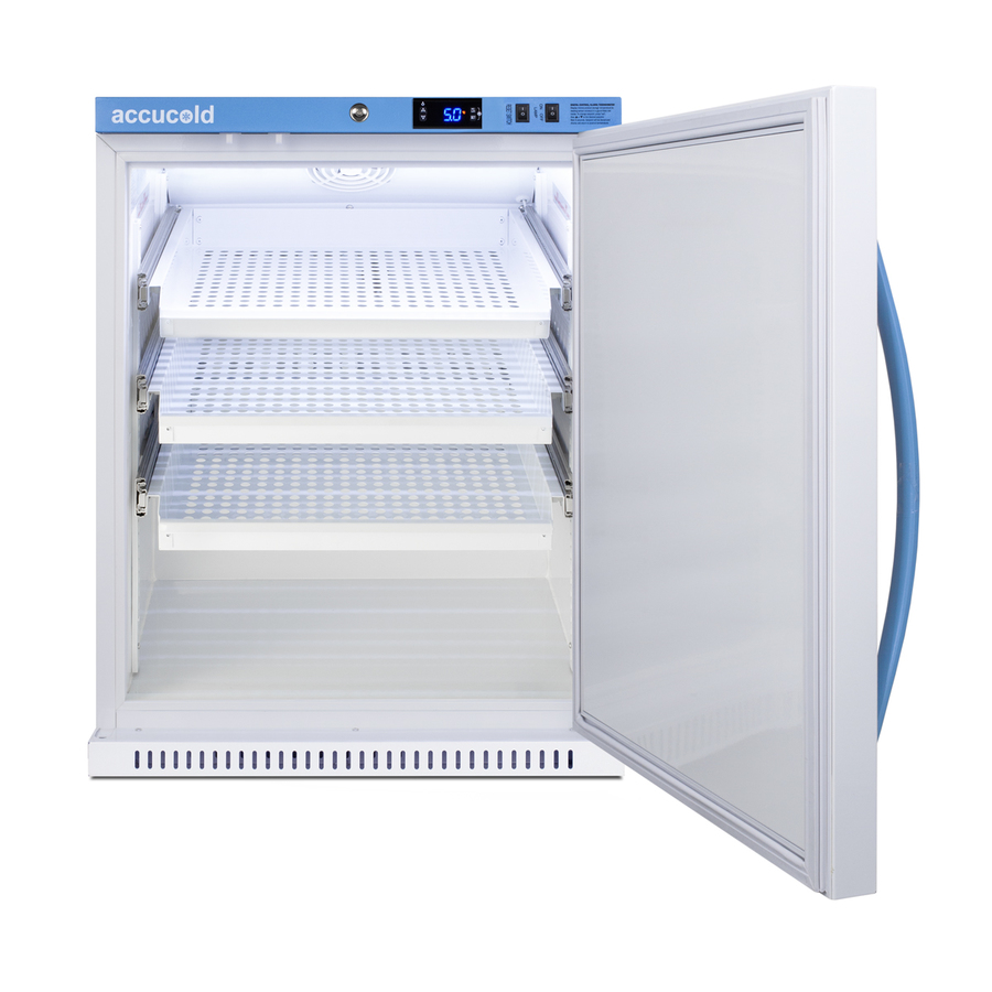 Accucold's Pharma-Vac Performance Series are upright all-refrigerators designed and purpose-built for pharmacy, medication, and vaccine applications to support meeting CDC/VFC/VFA guidelines. The ARS62PVBIADADR is a 6 cu.ft. all-refrigerator with a temperature range of +2°C to +8°C. Sized at just under 32" high to fit under lower counters complying with ADA guidelines for accessibility. It is designed for freestanding or recessed installation. The microprocessor temperature controller is externally located to minimize door openings, helping to protect stored contents from ambient temperature. The buffered temperature probe is encased in a glycol-filled bottle to better simulate temperature of the stored product, with an additional sensor that reads air temperature to ensure superior temperature control. The current and min/max temperature display is viewable in Celsius or Fahrenheit to the nearest tenth of a degree. The audible and visual temperature alarm sounds if the unit's interior goes out of range. Additional alarms include a power failure alert, door open alarm, and sensor failure alarm. This model is equipped with remote alarm contacts in the rear and a 1/2" probe port on the right side to accept additional monitoring devices. A hospital grade cord with 'green dot' plug is also included for added safety in high traffic areas. Inside, the ARS62PVBIADADR utilizes adjustable cycle defrost operation to avoid temperature spikes. Optimized forced air cooling with an internal fan to ensure excellent temperature stability and uniformity with rapid recovery after door openings. Three white powder-coated aluminum drawers provide ample storage and easy organization. Positioned on ball-bearing glides, the drawers offer full-extension for complete product access. Additionally, each drawer is removable allowing for transport of contents as needed. The drawers also lock into place for added security, while the perforated bottom ensures proper ventilation throughout the unit. This unit includes LED internal lighting with an on/off rocker switch. The interior is constructed from white powder coated metal to ensure added durability and better temperature retention. The ARS62PVBIADADR comes in a white cabinet finish with a blue accented control panel. The factory-installed antimicrobial handle is powder-coated with naturally occurring silver ions, which help to reduce the spread of germs, allowing for a safer, cleaner user experience. The user-reversible door ships with a right hand swing and self-closing function, while a factory-installed lock provides security as needed, with two keys for staff use. Powerful magnetic gaskets ensure a positive seal. Designed with hydrocarbon refrigerant, the ARS62PVBIADADR provides an energy efficient solution to vaccine storage. This unit is Pyxis, Omnicell, and AcuDose RX compatible. Additional sizes, as well as solid door options, are also available. Explore the full Pharma-Vac series at accucold.com/pharmavac. NOTE: Accucold refrigerators are purpose-built to the support meeting the current CDC (Centers for Disease Control) guidelines for the storage of vaccines. Units that end in suffix "456" have been certified to the new NSF 456 standard. As referenced in the current Vaccine Storage and Handling Toolkit, these units incorporate microprocessor controls and forced air circulation for stable operation between 2 and 8ºC. For additional temperature assurance, the CDC recommends a calibrated digital data logger (DDL), which can be added with the factory-installed option DL2B or addition of the DL2BKit accessory.