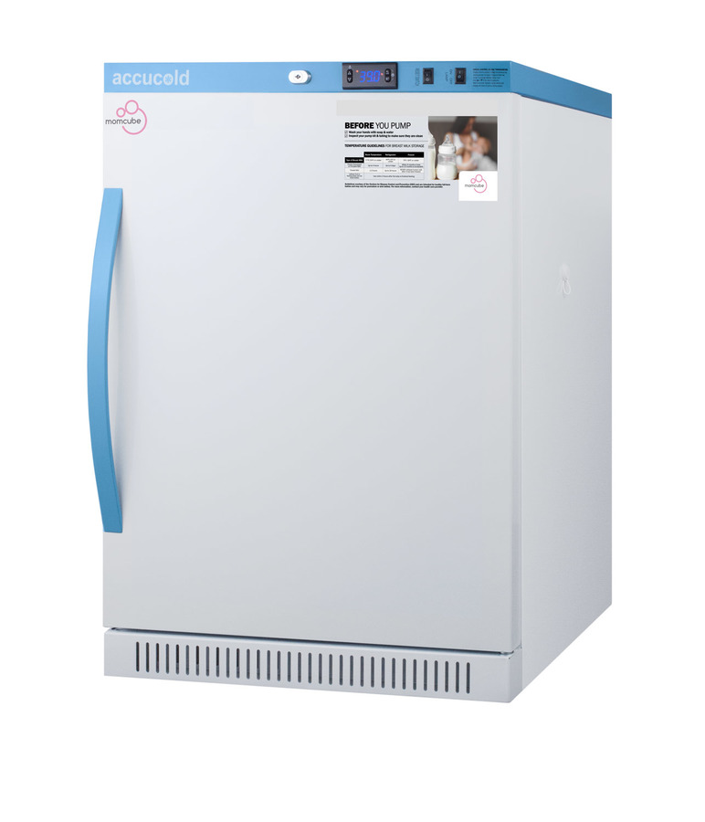 Accucold's MOMCUBE® upright all-refrigerators are designed and purpose-built for breast milk storage, with a powder-coated silver ion handle that helps prevent germ spread. All MOMCUBE® units are laboratory-tested to maintain temperature between 33-40°F, as recommended by the CDC and ideal for maternity wards, hospitals, NICUs, employee wellness rooms complying with Section 4207 of the Patient Protection and Affordable Care Act, and other facilities. The ARS6MLMC is a 6 cu.ft. all-refrigerator. The microprocessor digital thermostat is located in the top control panel, with an LED display of the interior temperature. The buffered temperature probe is encased in glycol to simulate the temperature of the interior's contents, while a second sensor measures interior air temperature for added control. Audible and visual alarms alert you to temperature fluctuations. Additional alarms include an open door alarm, power failure alarm, sensor alarm, and remote alarm contacts in the rear, which allow for alarm forwarding to an external remote alarm system. The pre-installed ½ inch probe hole is located in the right interior wall to allow for additional user-supplied monitoring devices. The digital display provides the min/max temperature in Fahrenheit to the nearest tenth of a degree. Users can switch to Celsius in a few simple steps. Temperature parameters are password protected but can be adjusted aftermarket. This unit comes with a hospital grade cord with a green dot plug for added safety in high traffic areas. Inside, the ARS6MLMC boasts four adjustable plastic-coated wire shelves for optimal storage flexibility. The forced air cooling system with two internal fans helps to provide temperature uniformity, stability, and quick recovery from door openings. An adjustable cycle defrost system helps to avoid temperature spikes and ice build-up. A soft LED light is included with this unit with an option to turn on/off with a rocker switch. The interior is constructed from white powder coated metal providing added durability and improved temperature retention. The MOMCUBE® comes in a white cabinet with blue display panel. The factory-installed antimicrobial handle is powder-coated with naturally occurring silver ions, which help to reduce the spread of germs, allowing for a safer, cleaner user experience. The user-friendly reversible door comes standard in a right-hand swing with a self-closing function. Magnetic gaskets ensure a sight seal for improved performance. The factory-installed lock offers additional security. This unit is designed for freestanding use and works within most ADA compliant applications. The MOMCUBE is an eco-friendly solution to breast milk storage. Units of various capacity, heights, and interiors are available. Explore the entire MOMCUBE® Series on our website or contact our sales team at 718-893-3900 ext. 509 for more options.