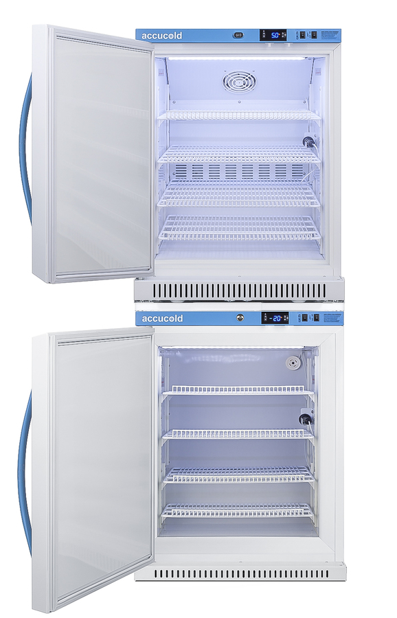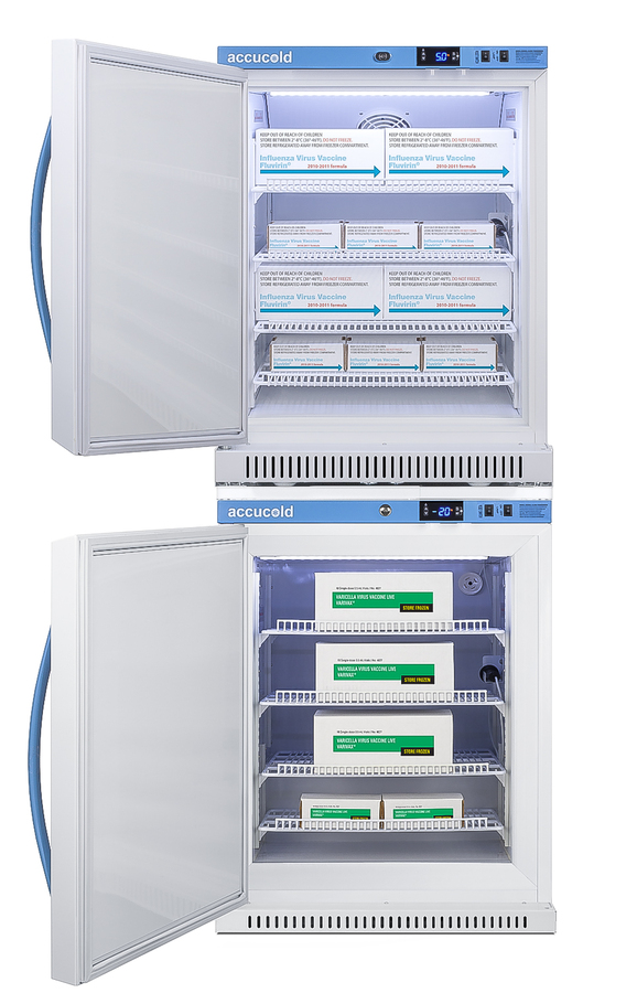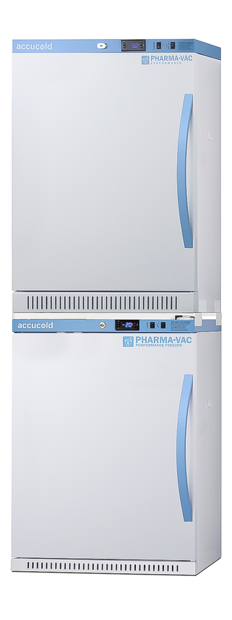 Accucold offers innovative solutions to vaccine storage with our Performance Series stackable purpose-built refrigerator-freezer combinations designed to support meeting CDC/VFC/VFA guidelines. Sized just under 24" wide, the ARS6PV-AFZ5PVBIADASTACKLHD combines the 6 cu.ft. ARG6PV auto defrost all-refrigerator with AFZ5PVBIADA all-freezer into one slim footprint using Accucold's StackRack. This ships in three boxes and requires some minor assembly upon delivery. Both units feature left hand door swings. The Pharma-Vac Performance Series is designed to meet the demanding needs of vaccine storage. Both units utilize a microprocessor temperature controller (refrigerator range: +2 to +8ºC; freezer range: -30 to -10ºC). The buffered temperature probe is encased in a glycol-filled bottle to better simulate temperature of the stored product, with an additional sensor that reads air temperature to ensure superior temperature control. The current and min/max temperature display is viewable in Celsius or Fahrenheit to the nearest tenth of a degree. The audible and visual temperature alarms sound if the units' interiors go out of range. Additional alarms include a power failure alert, door open alarm, and sensor failure alarm. Both units are equipped with remote alarm contacts in the rear and a 1/2" probe port on the right side to accept additional monitoring devices. The factory-installed antimicrobial handles are powder-coated with naturally occurring silver ions, which help to reduce the spread of germs, allowing for a safer, cleaner user experience. A hospital grade cord with 'green dot' plug is also included for added safety in high traffic areas. Inside, the ARS6PV refrigerator utilizes adjustable cycle defrost operation to avoid temperature spikes. Optimized forced air cooling with an internal fan ensures excellent temperature stability and uniformity with rapid recovery after door openings. The adjustable plastic-coated wire shelves can be positioned at 1/2" increments to accommodate virtually any sized item. This unit includes LED internal lighting with an on/off rocker switch. The interior is constructed from white powder coated metal to ensure added durability and better temperature retention. The refrigerator is designed to be stacked on top of the AFZ5PVBIADA, our Performance Series 3.88 cu.ft. all-freezer that utilizes static manual defrost operation. The freezer includes four adjustable plastic-coated wire shelves for flexible storage. Both units include front-mounted keyed locks and powerful magnetic gaskets to ensure a positive seal. Additional stacked combinations are available. Browse Accucold's website for more information, or contact our sales team at 718-893-3900 to discuss your equipment needs. NOTE: Accucold refrigerators are purpose-built to the support meeting the current CDC (Centers for Disease Control) guidelines for the storage of vaccines. As referenced in the current Vaccine Storage and Handling Toolkit, these units incorporate microprocessor controls and forced air circulation for stable operation between 2 and 8ºC. For additional temperature assurance, the CDC recommends a calibrated digital data logger (DDL), which can be added with the factory-installed option DL2B or addition of the DL2BKit accessory.
