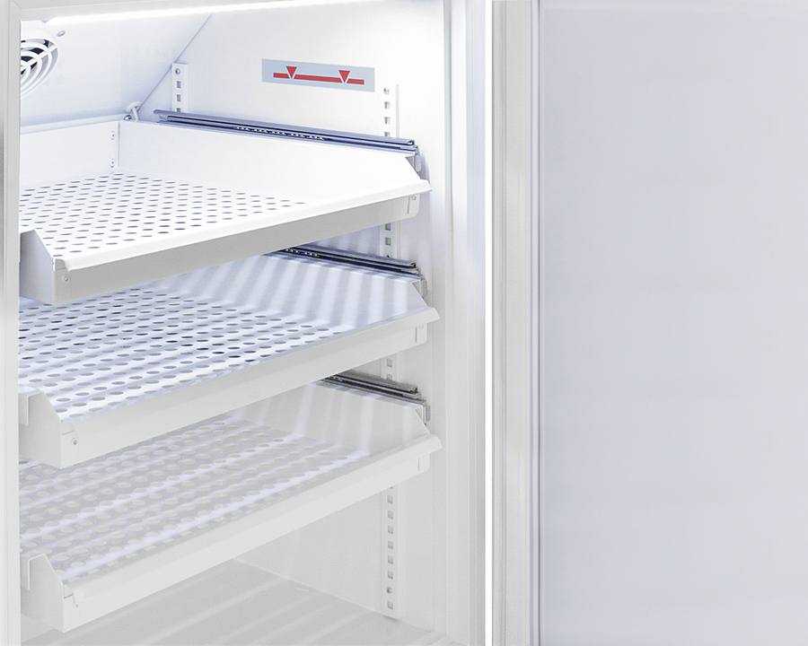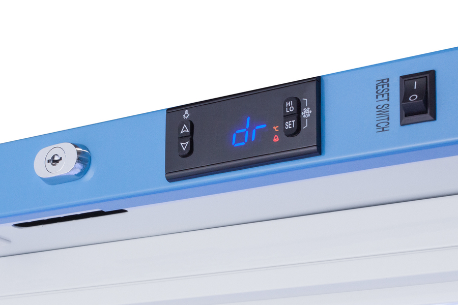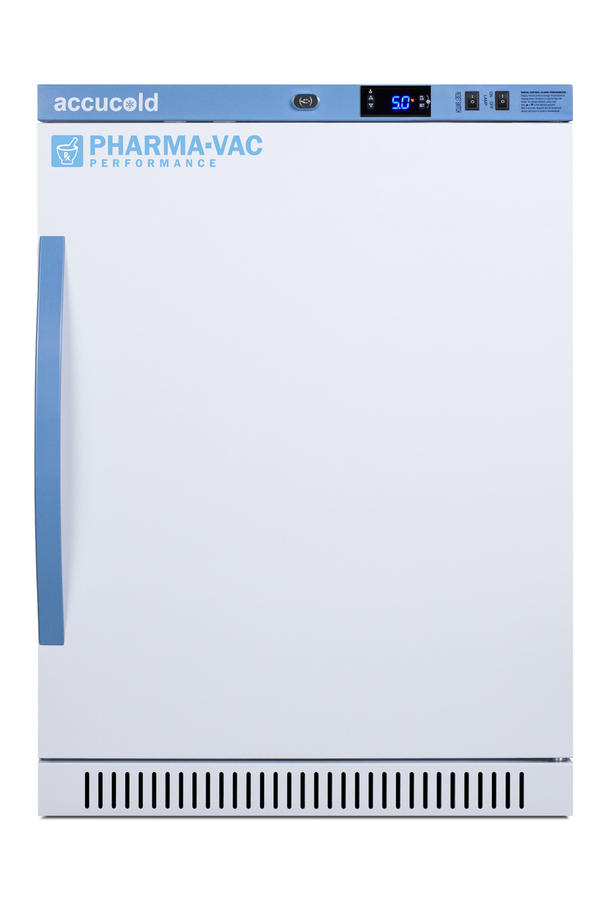 Accucold's Pharma-Vac Performance Series are upright all-refrigerators designed and purpose-built for pharmacy, medication, and vaccine applications to support meeting CDC/VFC/VFA guidelines, with a powder-coated silver ion handle that helps prevent germ spread. The ARS6PVDR is a 6 cu.ft. all-refrigerator sized at 32.5 inches high for use in most ADA compliant applications. The adjustable control range allows you to manage the temperature between +2 to +8ºC. The microprocessor temperature controller is externally located to minimize door openings, helping to protect stored contents from ambient temperature. The buffered temperature probe is encased in a glycol-filled bottle to better simulate temperature of the stored product, with an additional sensor that reads air temperature to ensure superior temperature control. The current and min/max temperature display is viewable in Celsius or Fahrenheit to the nearest tenth of a degree. The audible and visual temperature alarm sounds if the unit's interior goes out of range. Additional alarms include a power failure alert, door open alarm, and sensor failure alarm. This unit is equipped with remote alarm contacts in the rear and a 1/2" probe port on the right side to accept additional monitoring devices. This unit comes with a hospital grade cord with a green dot plug for added safety in high traffic areas. Inside, the ARS6PVDR utilizes adjustable cycle defrost operation to avoid temperature spikes. Optimized forced air cooling with one internal fan ensures excellent temperature stability and uniformity with rapid recovery after door openings. Three white powder-coated aluminum drawers provide ample storage and easy organization. Positioned on ball-bearing glides, the drawers offer full-extension for complete product access. Additionally, each drawer is removable allowing for transport of contents as needed. The drawers also lock into place for added security, while the perforated bottom ensures proper ventilation throughout the unit. LED internal lighting with an on/off rocker switch attractively illuminates the interior for easy viewing. The interior is constructed from white powder-coated metal to ensure added durability and better temperature retention. The ARS6PVDR comes in a white cabinet finish with a blue accented control panel. The factory-installed antimicrobial handle is powder-coated with naturally occurring silver ions, which help to reduce the spread of germs, allowing for a safer, cleaner user experience. The user-reversible door ships with a right-hand swing and self-closing function. This model includes a factory-installed lock and ships with two keys for staff use. Powerful magnetic gaskets ensure a positive seal. Designed with hydrocarbon refrigerant, the ARS6PVDR provides an energy-efficient solution to vaccine storage. This unit is Pyxis, Omnicell, and AcuDose RX compatible. Additional sizes, door options, and units with a combination of standard shelving and drawers are also available. Explore the full Pharma-Vac series at accucold.com/pharmavac. NOTE: Accucold refrigerators are purpose-built to the support meeting the current CDC (Centers for Disease Control) guidelines for the storage of vaccines. Units that end in suffix "456" have been certified to the new NSF 456 standard. As referenced in the current Vaccine Storage and Handling Toolkit, these units incorporate microprocessor controls and forced air circulation for stable operation between 2 and 8ºC. For additional temperature assurance, the CDC recommends a calibrated digital data logger (DDL), which can be added with the factory-installed option DL2B or addition of the DL2BKit accessory.
