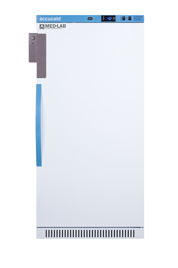 Accucold's Med-Lab Performance Series all-refrigerators are designed and purpose-built to meet the demanding needs of life science, laboratory, and medical cold storage applications. The ARS8ML is an 8 cu.ft. all-refrigerator with an adjustable control range from +2 to +10ºC. The microprocessor temperature controller is externally located to minimize door openings, helping to protect stored contents from ambient temperature. The buffered temperature probe is encased in a glycol-filled bottle to better simulate temperature of the stored product, with an additional sensor that reads air temperature to ensure superior temperature control. The current and min/max temperature display is viewable in Celsius or Fahrenheit to the nearest tenth of a degree. The audible and visual temperature alarm sounds if the unit's interior goes out of range. Additional alarms include a power failure alert, door open alarm, and sensor failure alarm. This unit is equipped with remote alarm contacts in the rear and a 1/2" probe port on the right side to accept additional monitoring devices. This unit comes with a hospital grade cord with a green dot plug for added safety in high traffic areas. Inside, the ARS8ML utilizes adjustable cycle defrost operation to avoid temperature spikes. Optimized forced air cooling with two internal fans ensures excellent temperature stability and uniformity with rapid recovery after door openings. The adjustable plastic-coated wire shelves can be positioned at 1/2" increments to accommodate virtually any sized item. We include seven shelves, more than competitor products providing to maximize interior shelving storage area. This unit includes LED internal lighting with an on/off rocker switch. The interior is constructed from white powder coated metal to ensure added durability and better temperature retention. The ARS8ML comes in a white cabinet finish with a blue accented control panel. The factory-installed antimicrobial handle is powder-coated with naturally occurring silver ions, which help to reduce the spread of germs, allowing for a safer, cleaner user experience. The user-reversible door ships with a right hand swing and self-closing function. This model includes a factory-installed lock and ships with two keys for staff use. Powerful magnetic gaskets ensure a positive seal. Designed with hydrocarbon refrigerant, the ARS8ML provides an energy efficient solution to laboratory and life science storage. This unit is Pyxis, Omnicell, and AcuDose RX compatible. Additional sizes are available. Explore the full Med-Lab series at accucold.com/medlab. NOTE: Accucold refrigerators are purpose-built to the support meeting the current CDC (Centers for Disease Control) guidelines for the storage of vaccines. At this time, Accucold refrigerators have not been evaluated to the new NSF 456 standard. As referenced in the current Vaccine Storage and Handling Toolkit, these units incorporate microprocessor controls and forced air circulation for stable operation. For additional temperature assurance, the CDC recommends a calibrated digital data logger (DDL), which can be added with the factory-installed option DL2B or addition of the DL2BKit accessory.