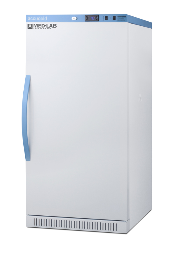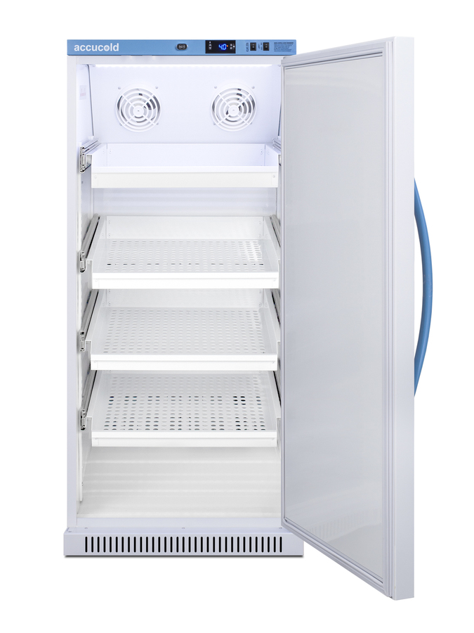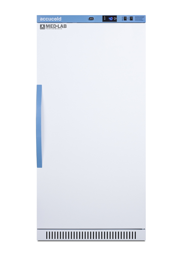Accucold's Med-Lab Performance Series all-refrigerators are designed and purpose-built to meet the demanding needs of life science, laboratory, and medical cold storage applications. The ARS8MLDR is an 8 cu.ft. all-refrigerator with an adjustable control range from +2 to +10ºC. The microprocessor temperature controller is externally located to minimize door openings, helping to protect stored contents from ambient temperature. The buffered temperature probe is encased in a glycol-filled bottle to better simulate temperature of the stored product, with an additional sensor that reads air temperature to ensure superior temperature control. The current and min/max temperature display is viewable in Celsius or Fahrenheit to the nearest tenth of a degree. The audible and visual temperature alarm sounds if the unit's interior goes out of range. Additional alarms include a power failure alert, door open alarm, and sensor failure alarm. This unit is equipped with remote alarm contacts in the rear and a 1/2" probe port on the right side to accept additional monitoring devices. This unit comes with a hospital grade cord with a green dot plug for added safety in high traffic areas. Inside, the ARS8MLDR utilizes adjustable cycle defrost operation to avoid temperature spikes. Optimized forced air cooling with two internal fans ensures excellent temperature stability and uniformity with rapid recovery after door openings. Four white powder-coated aluminum drawers provide ample storage and easy organization. Positioned on ball-bearing glides, the drawers offer full-extension for complete product access. Additionally, each drawer is removable allowing for transport of contents as needed. The drawers also lock into place for added security, while the perforated bottom ensures proper ventilation throughout the unit. LED internal lighting with an on/off rocker switch attractively illuminates the interior for easy viewing. The interior is constructed from white powder-coated metal to ensure added durability and better temperature retention. The ARS8MLDR comes in a white cabinet finish with a blue accented control panel. The factory-installed antimicrobial handle is powder-coated with naturally occurring silver ions, which help to reduce the spread of germs, allowing for a safer, cleaner user experience. The user-reversible door ships with a right-hand swing and self-closing function. This model includes a factory-installed lock and ships with two keys for staff use. Powerful magnetic gaskets ensure a positive seal. Designed with hydrocarbon refrigerant, the ARS8MLDR provides an energy-efficient solution to laboratory and life science storage. This unit is Pyxis, Omnicell, and AcuDose RX compatible. Additional sizes, door options, and units with a combination of standard shelving and drawers are also available. Explore the full Med-Lab series at accucold.com/medlab. NOTE: Accucold refrigerators are purpose-built to the support meeting the current CDC (Centers for Disease Control) guidelines for the storage of vaccines. At this time, Accucold refrigerators have not been evaluated to the new NSF 456 standard. As referenced in the current Vaccine Storage and Handling Toolkit, these units incorporate microprocessor controls and forced air circulation for stable operation. For additional temperature assurance, the CDC recommends a calibrated digital data logger (DDL), which can be added with the factory-installed option DL2B or addition of the DL2BKit accessory.