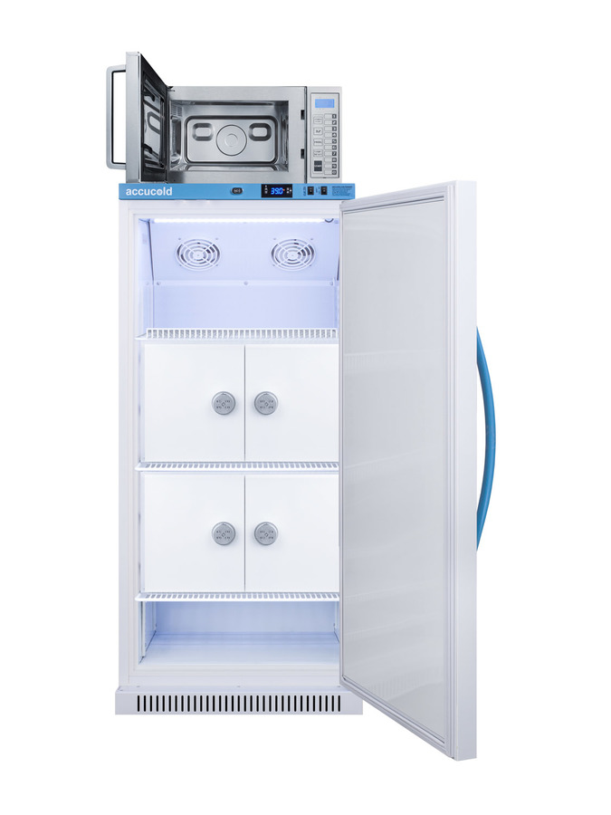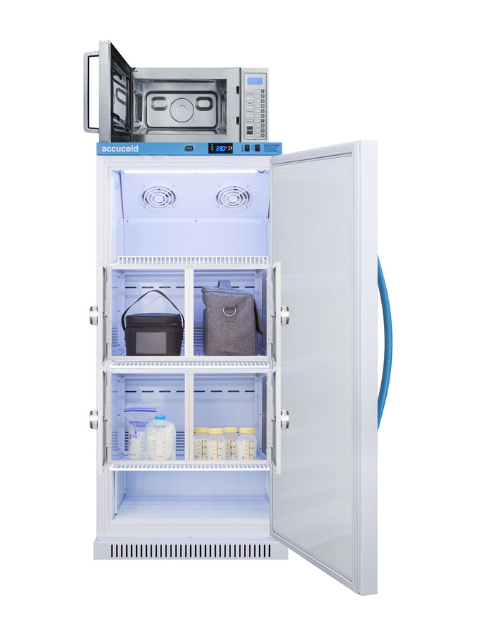 The ARS8MLMCLK-SCM1000SS combines Accucold’s MOMCUBE 8 cu.ft. all-refrigerator for breast milk storage with Summit’s stainless steel commercial microwave. The complete unit has a slim width under 24 inches providing for an easy fit in a variety of spaces. The all-refrigerator’s reversible door allows for additional flexibility in unit placement. Inside, the MOMCUBE all-refrigerator boasts four locking compartments, each with a combination lock to ensure added privacy for mothers storing their breast milk. Two master keys are included to override the combination locks if needed. The locker doors are constructed from galvanized steel and the interior is constructed from white powder coated metal providing added durability and improved temperature retention. This unit comes with a hospital grade cord with a green dot plug for added safety in high traffic areas. The factory-installed antimicrobial handle is powder-coated with naturally occurring silver ions, which help to reduce the spread of germs, allowing for a safer, cleaner user experience. The SCM1000SS microwave features a complete stainless steel exterior and easy-grab handle. User-friendly digital display and controls allow for easy sanitation of pumping equipment, making it the perfect complement to the 8 cu.ft. MOMCUBE all-refrigerator. The MLRS8MCLK-SCM1000SS is shipped separately and ready to use. This unit is purpose-built for use in NICUs, hospitals, maternity rooms, mothers' suits, and other facilities and